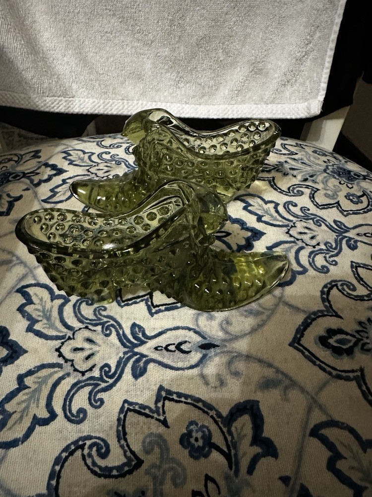 The Vintage Fenton Art Glass Olive Green Hobnail Cat Head Shoe Slipper Heel Boot is a Victorian-style figurine featuring a decorative shoe slipper design. Made of art glass in the United States in the 1970s, this original piece stands at 6 inches long and 3 inches tall, with a glossy finish. The elegant and unique design, with a cat head detail on the heel, makes it a charming and collectible item for those interested in vintage glassware and artisanal pieces. Set of 2