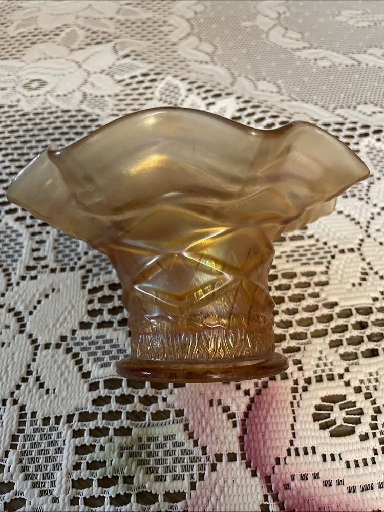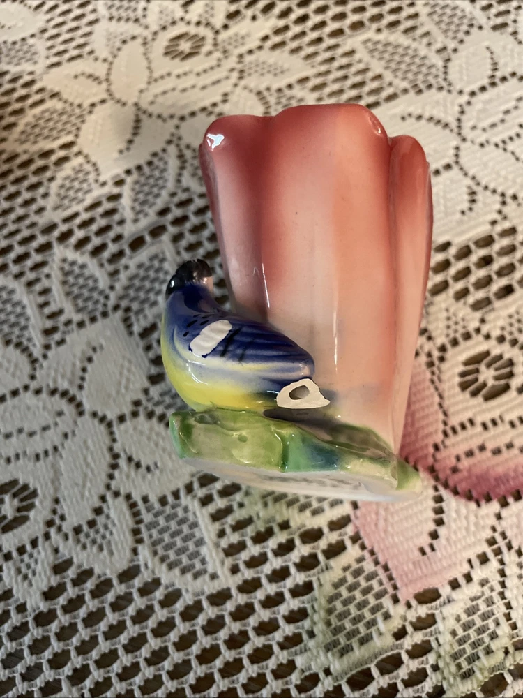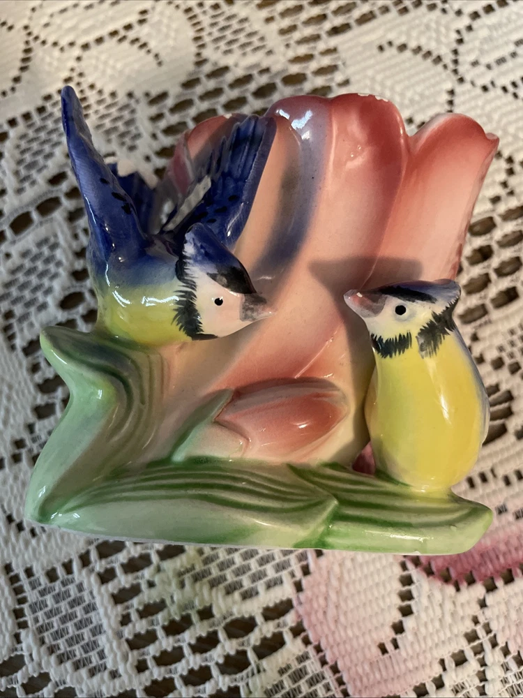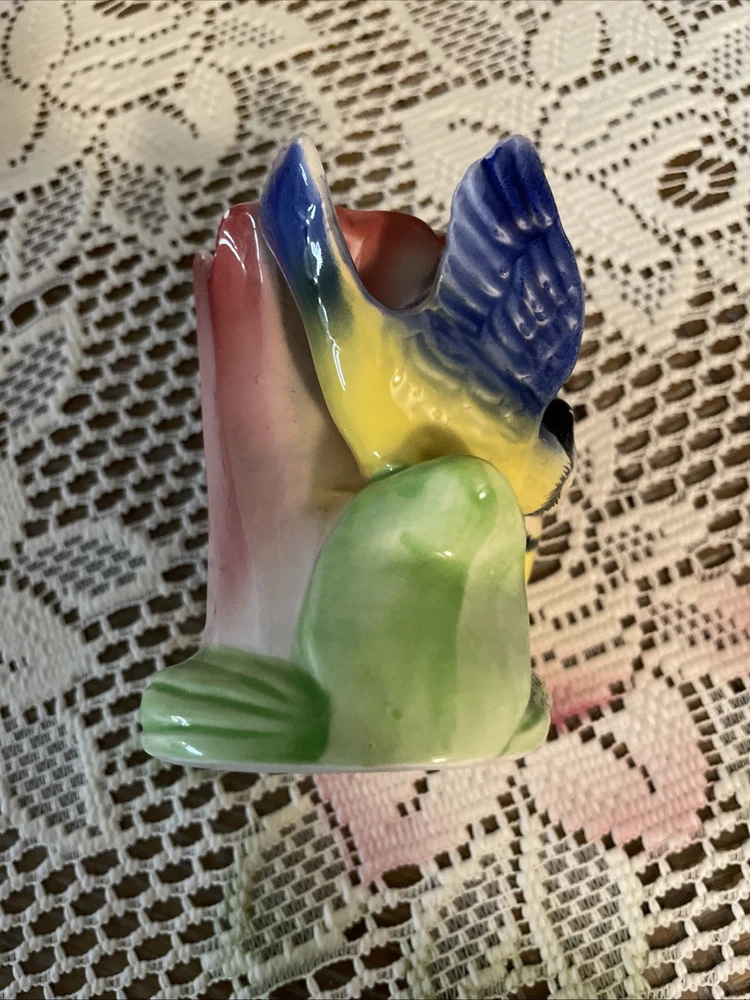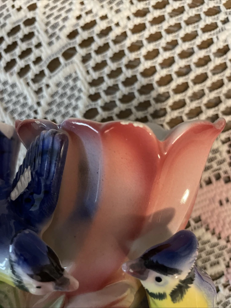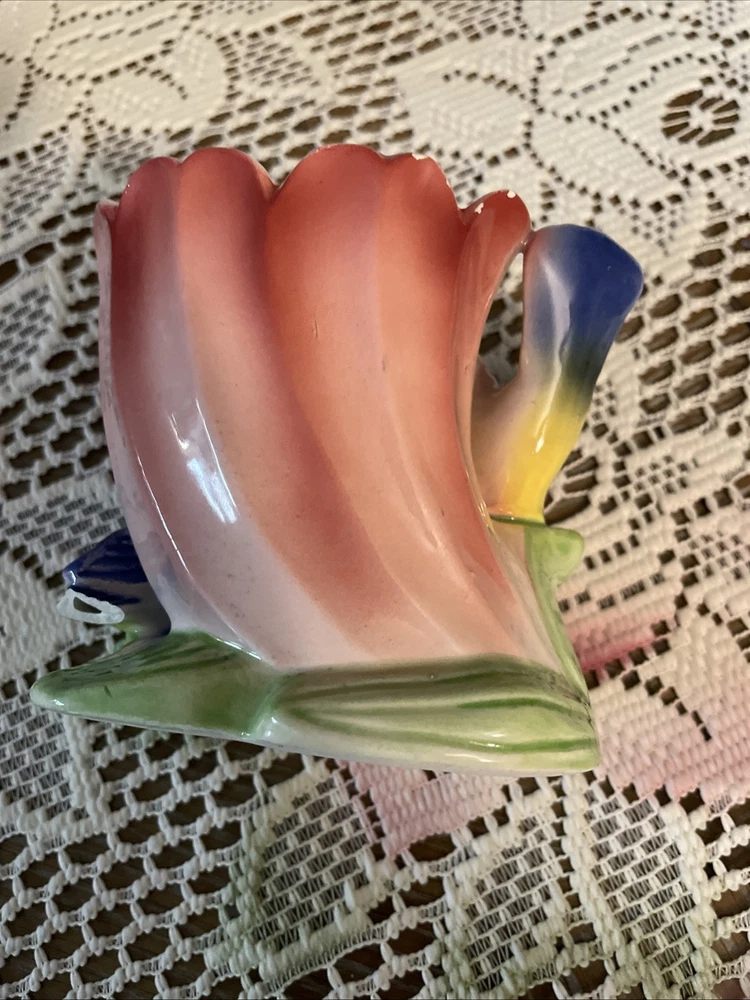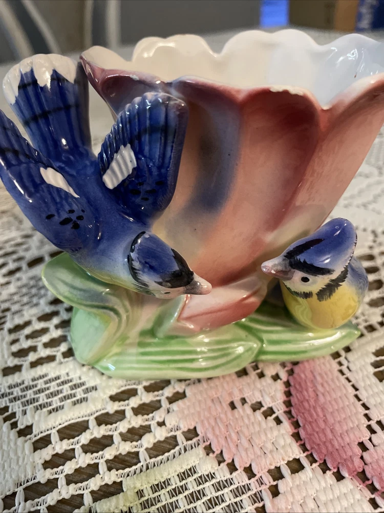 This is a set of two small vintage pieces.Fenton Marigold Carnival Glass Hat Vase Ruffle X pattern 3.5 inches high by 6inches across, flower design in bottom. The vintage bluejay figural planter I believe is Japanese and very rare. It measures 4 inches by 4 inches.Both beautiful pieces have slight damage which is shown in pictures. Please feel free to ask any questions.