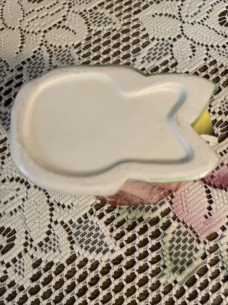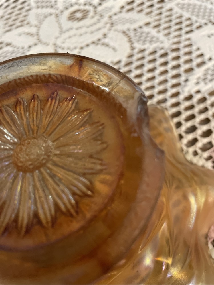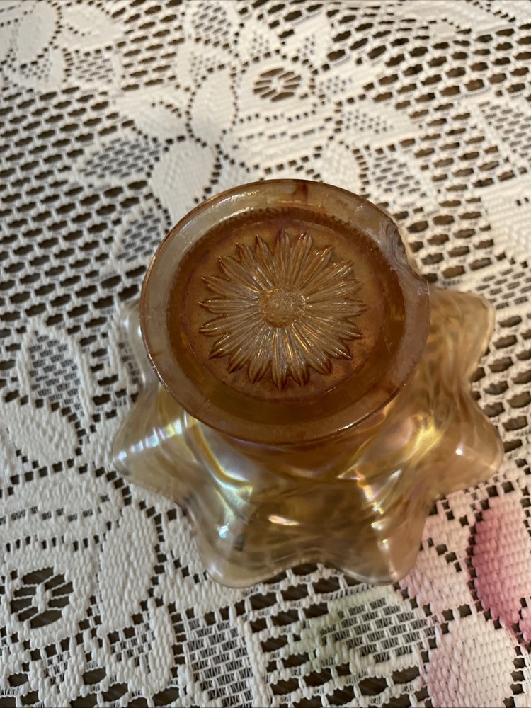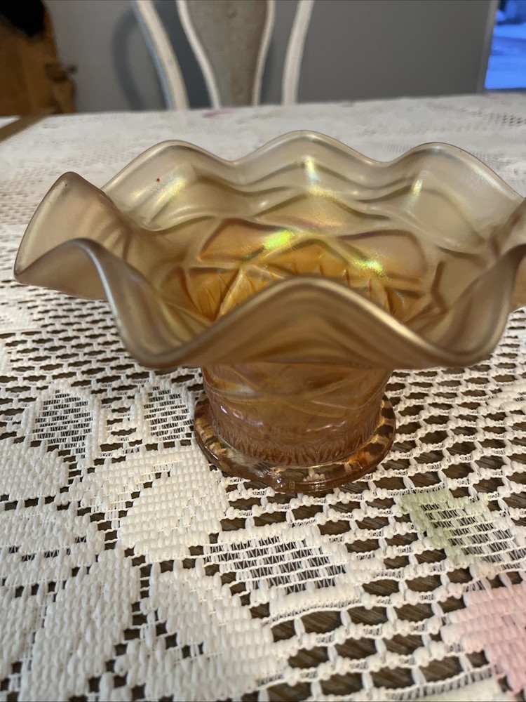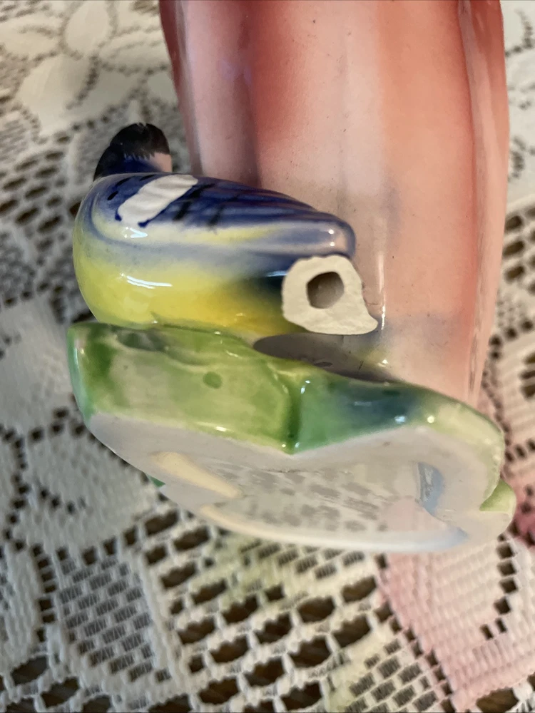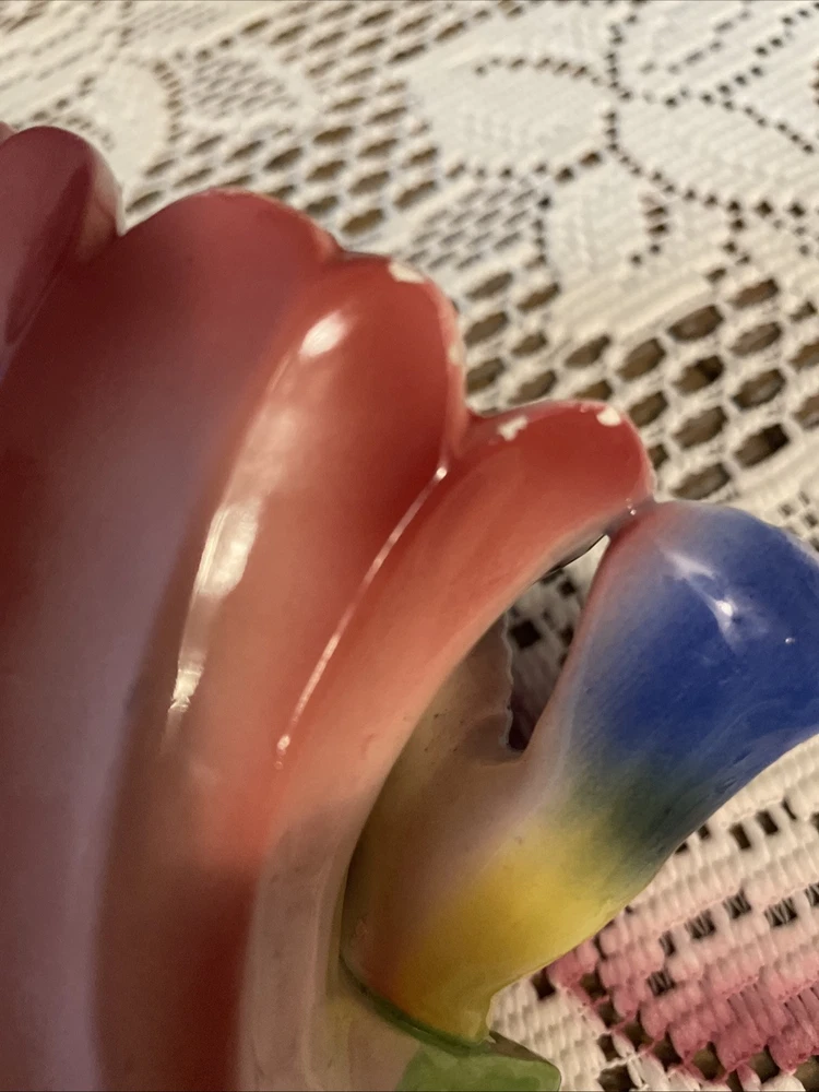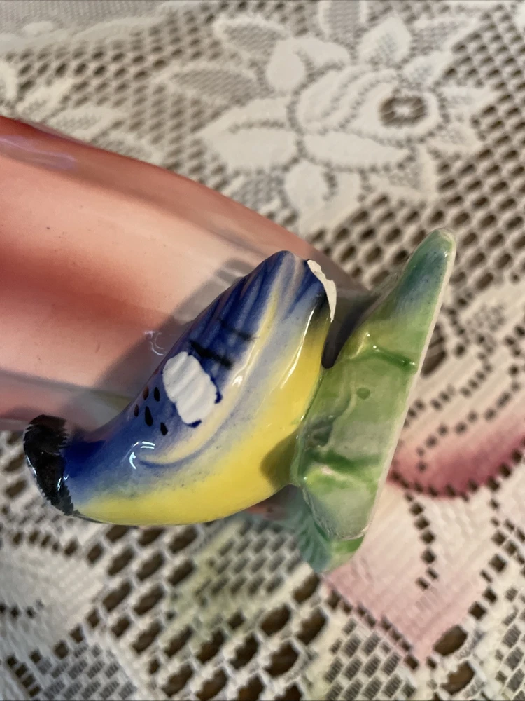 This is a set of two small vintage pieces.Fenton Marigold Carnival Glass Hat Vase Ruffle X pattern 3.5 inches high by 6inches across, flower design in bottom. The vintage bluejay figural planter I believe is Japanese and very rare. It measures 4 inches by 4 inches.Both beautiful pieces have slight damage which is shown in pictures. Please feel free to ask any questions.