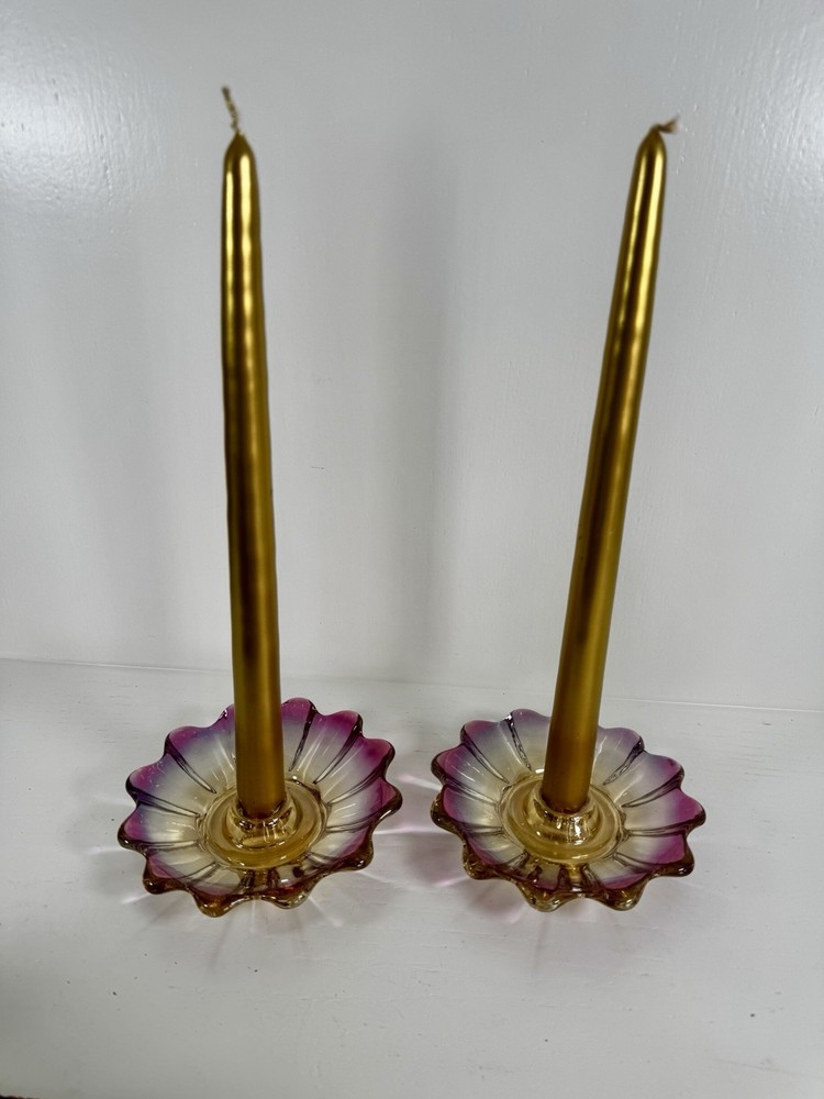 Beautiful pair of vintage Fenton cranberry opalescent glass candle bobeches featuring softly ruffled edges and a classic pink-to-opalescent fade with warm amber centers. Designed to catch wax drips beneath taper candles, these mid-century glass bobeches also serve as elegant decorative accents when paired with brass, crystal, or traditional candlesticks. Perfect for collectors replacing missing original bobeches or anyone styling romantic vintage tablescapes. Details: • Approx. 5” diameter • Approx. 1” tall • Fits standard taper candles • Matching pair included Unmarked example consistent with earlier Fenton production prior to logo usage. Carefully packed for safe shipping. replacement bobeche candle drip tray cranberry glass pink opalescent ruffled glass vintage candle accessory fenton replacement part ⭐ Kerby Curates No junk. Just gems. Feel free to reach out with any questions — happy to help!