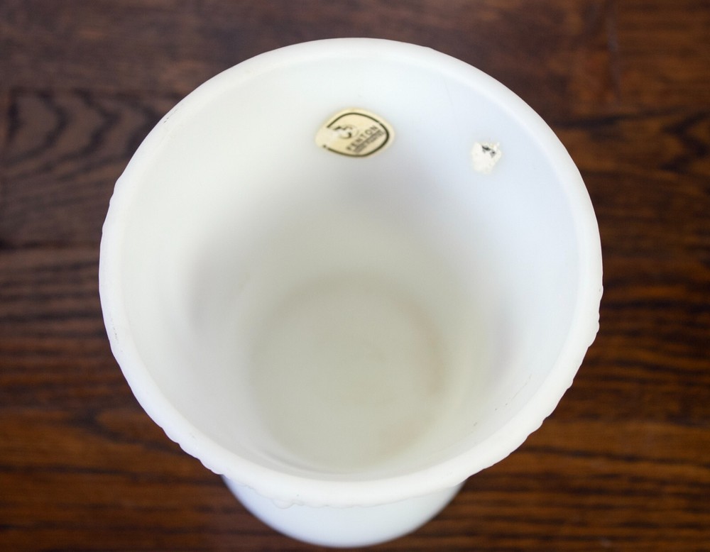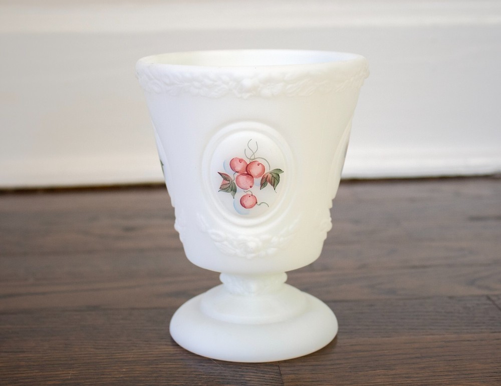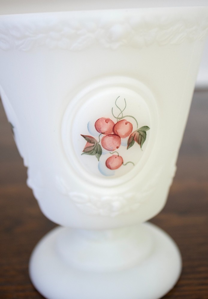 Lovely vintage Fenton white satin glass pedestal candy dish with no lid and hand-painted details. The hand painting is placed in pressed oval cameos with little berry/cherry clusters around the dish. There is a Fenton sticker on the interior, The Fenton logo is pressed into the bottom with the artist's signature painted. The dish is in good condition with no chips or cracks. The pedestal dish measures approximately 5.75" tall and 4.25" in diameter.