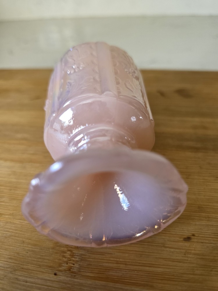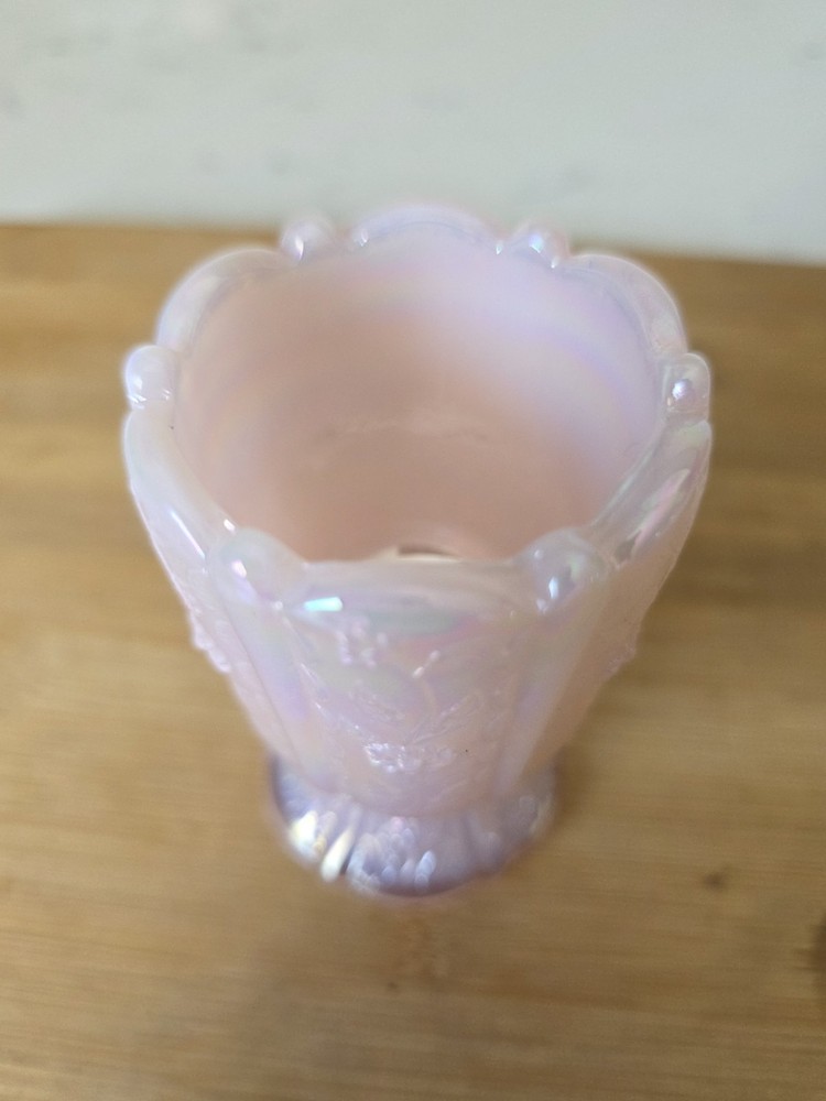 The Vintage Fenton Light Pink Paneled Daisy Toothpick Holder is a charming collectible piece made of opalescent pearl glass in the United States. Standing at 3 5/8 inches tall and 2 1/4 inches wide, this original toothpick holder features a beautiful paneled daisy pattern, adding a touch of elegance to any kitchen or dining room. This rare find from the renowned Fenton brand is a unique and delightful addition to any vintage collection. Excellent condition