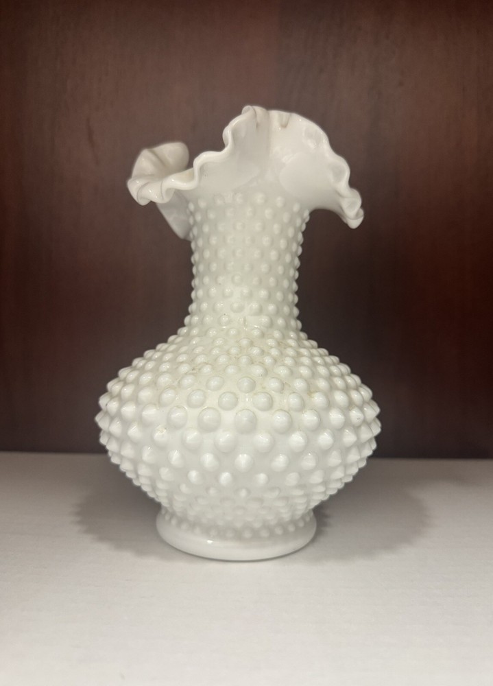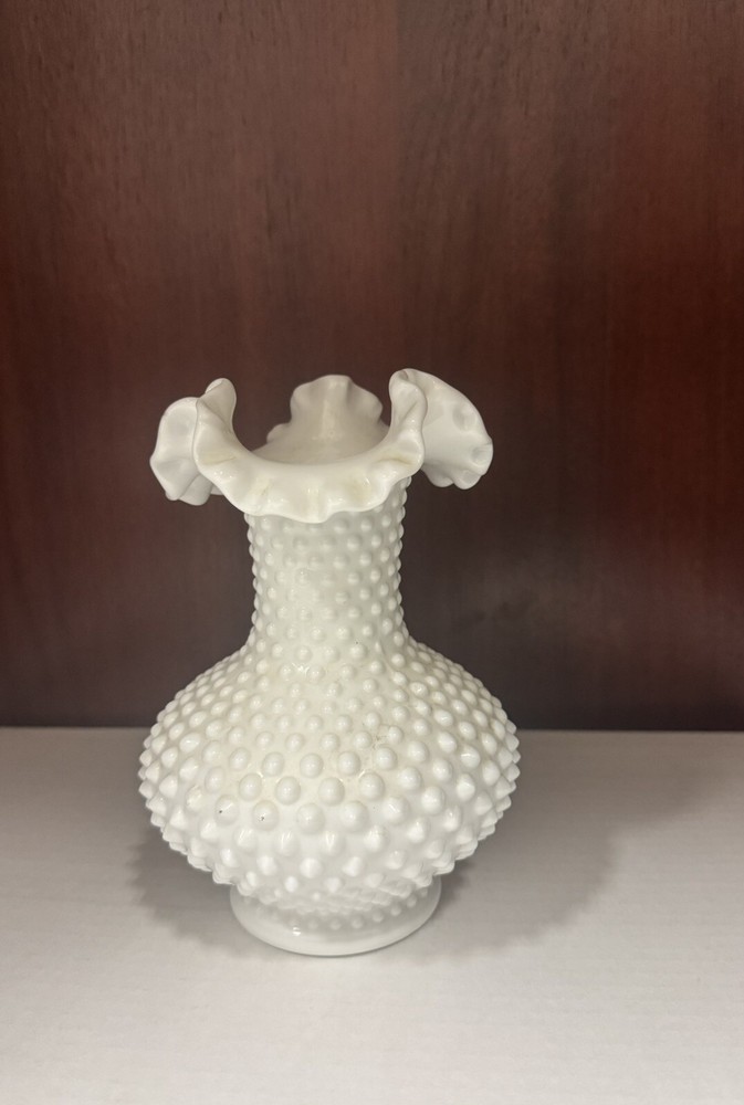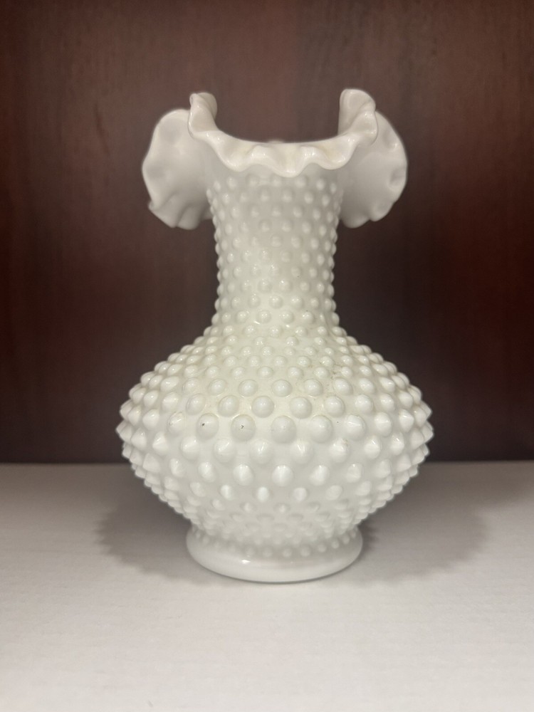 Valentines is coming up! Any lady would love flowers in this vase. Vintage Fenton Milk Glass Vase from the mid 20th Century, featuring a ruffled pattern in white glass. This original mid-century modern piece from North America is part of the hobnail product line by Fenton. The vase has a glossy finish and is made of fused glass. It is a classic example of American glassware production, showcasing a timeless ruffled design.