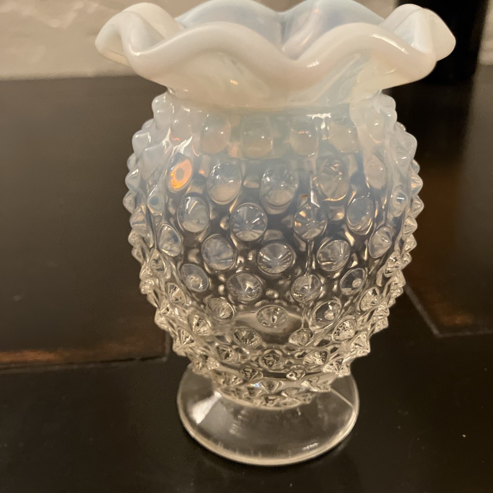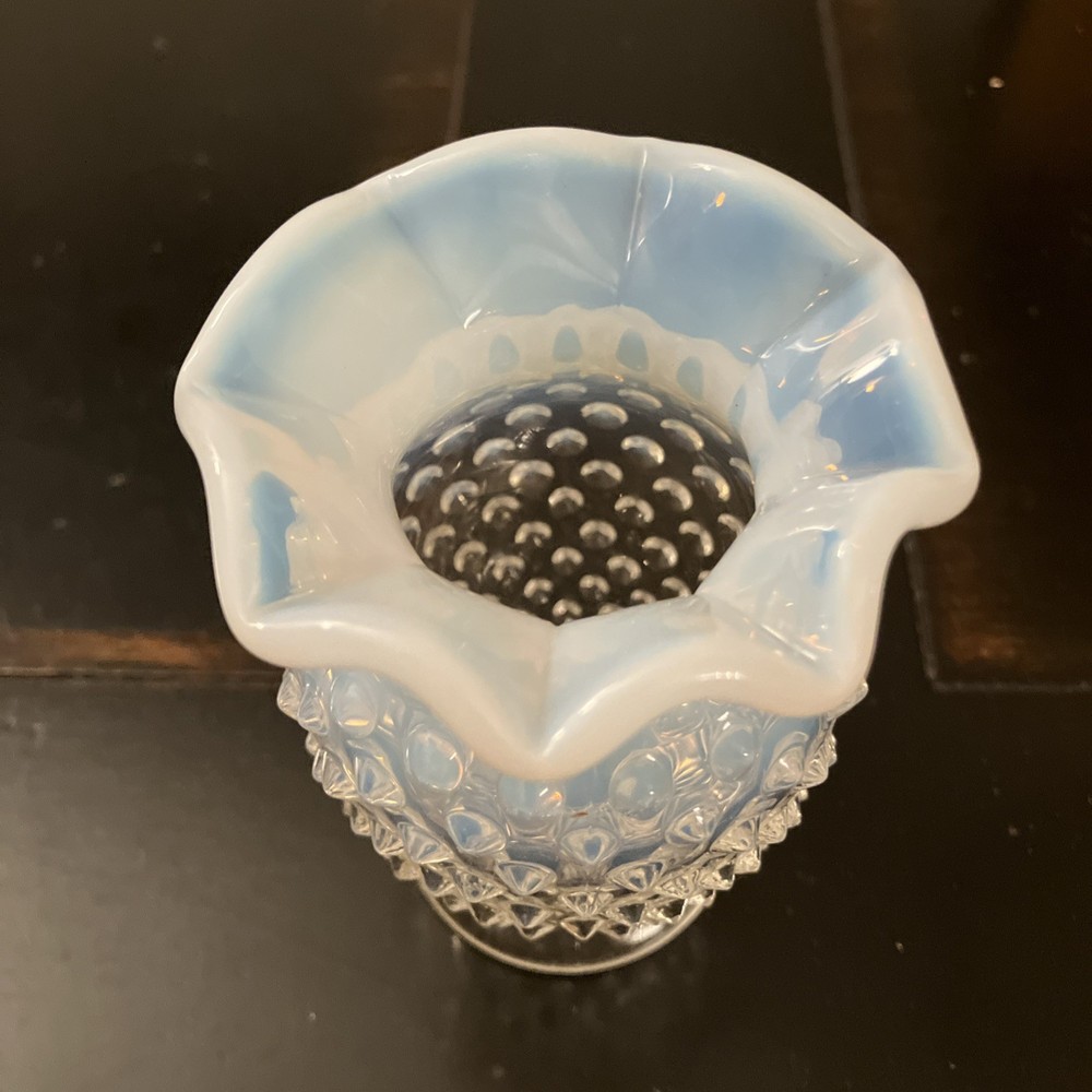 Vintage Fenton Moonstone Opalescent Bud Vase Hobnail Glass Ruffled Edge 3.75 "H