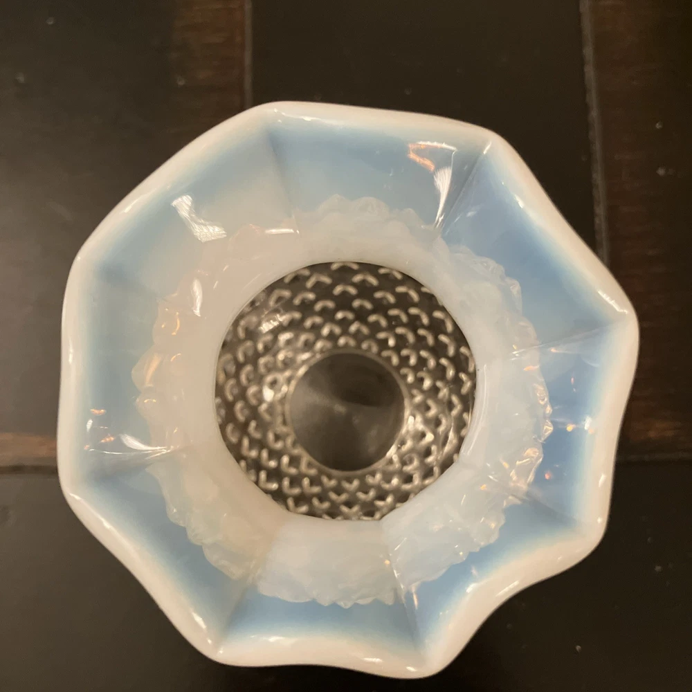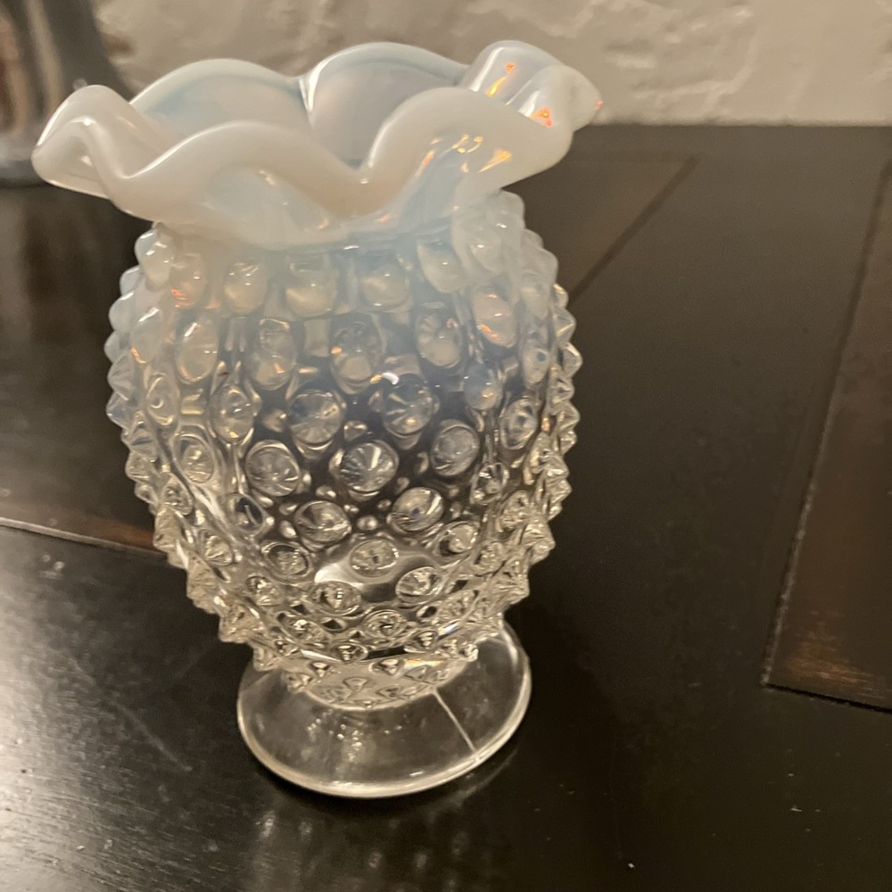 Finish: Glossy Brand: Fenton Item Height: 3.75" Era: Mid 20th Century (1941-1969) Material: Glass Occasion: All Occasions Item Length: 3.75 in Size: Small Style: Mid-Century Modernism Color: Moonstone Opalescent Diameter: 2.5" top 1.75" base Pattern: Ruffled Country of Origin: United States Type: Vase
