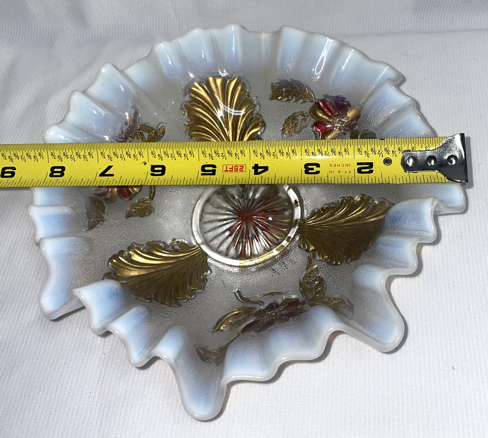 Fenton Art Glass Opalescent Ruffled Edge W/ Gold Featured Flowers And Leafs Pre -owned. Gold is flaking and peeling, should be carefully handled. No chips or cracks or rough edges. Bowl measures 8.5 inches edge to edge x 2.5 inches high. Please hand wash only. Great display item. ATTENTION REGARDING SHIPPING !! Shipping costs are expensive. Here is an offer that is hard to refuse. If you buy 2 or more items totaling $50 or more , I will handle the shipping cost (ground) anywhere in the continental United States. The items cannot be listed as having to be shipped alone due to SPECIAL PACKING NEEDS . eBay does not adjust the shipping cost removal from the invoice automatically. I can do it on the final invoice after you have the items in your shopping basket, before you pay. If eBay forces payment before that is done, you will receive a refund of shipping cost made before your package is shipped within the first business day following the transaction. The free shipping offer does not apply to Priority or Expedited shipping, although we can discuss a fair reduction in shipping cost should you desire the shipping upgrade. SAVE SHIPPING COSTS! – USE COMBINED SHIPPING Shipping costs are high. The best way to save money on shipping costs is through combined shipping,… purchasing more than 1 item and having them shipped together. The cost per item drops substantially. To do this you MUST NOT pay for items until after the combined shipping cost has been calculated on the invoice. If you pay before this has been done you will end up paying the individual shipping cost for each item, and I am unable to issue refunds for shipping overpayments when this occurs because eBay does not refund the fees they charge me on the refunded amount. LOOKING FOR LESS EXPENSIVE SHIPPING? Click on "See details" next to Expedited Shipping Fee above to see other shipping options. eBay calculates the shipping fee based on package size, weight and type of shipping you select. SOME ITEMS CANNOT BE COMBINED WITH OTHER ITEMS DUE TO UNIQUE PACKAGING CHARACTERISTICS. THERE WILL BE A NOTE IN THE LISTING WHEN COMBINED SHIPPING CANNOT BE USED.