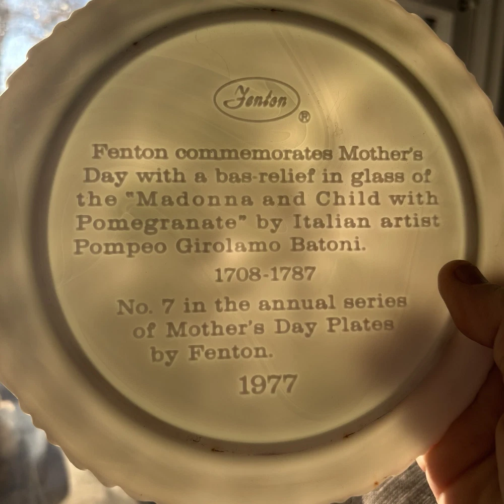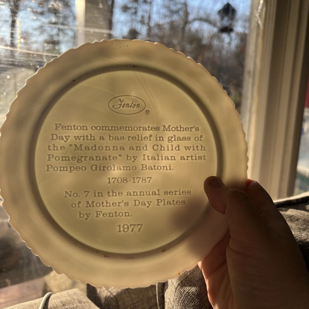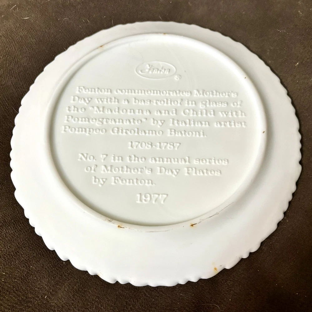 Department: Adult Material: Glass Antique: No Item Width: 7.5 in Vintage: Yes Year Manufactured: 1977 Handmade: Yes Finish: Matte Production Technique: Fused Glass Subject/Theme: Mother's Day Original/Licensed Reproduction: Licensed Reproduction Product Line: Mother’s Day Plate UPC: Does not apply Country/Region of Manufacture: United States Type of Glass: Pressed Glass Care Instructions: Hand Wash Only Pattern: Madonna And Child Original/Reproduction: Vintage Original Set Includes: Plate Style: Mid-Century Modern Type: Plate Features: Fenton Logo Impression gtin13: Does not apply Theme: Mothers Day Occasion: Mother's Day Brand: Fenton Color: White Origin: North America Production Style: Art Glass Plate Diameter: 7.5 in Time Period Manufactured: 1970-1979 Backstamp: Printed Shape: Round