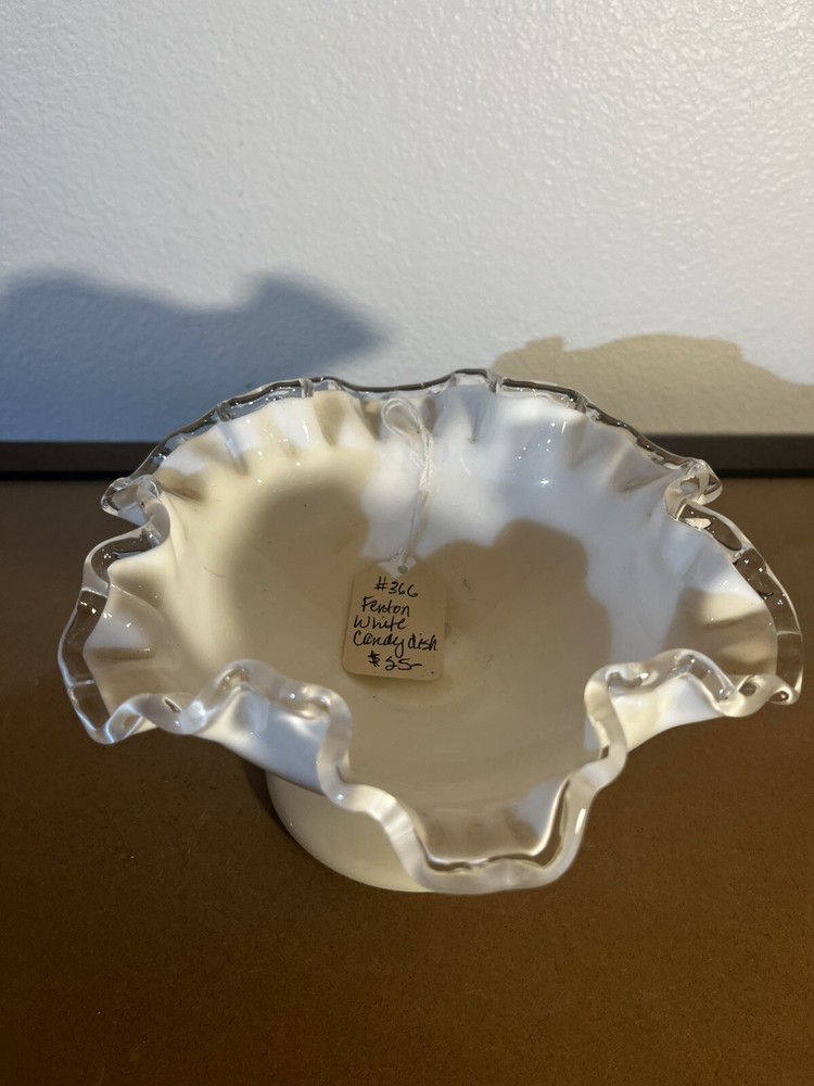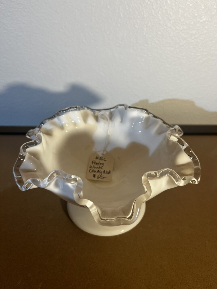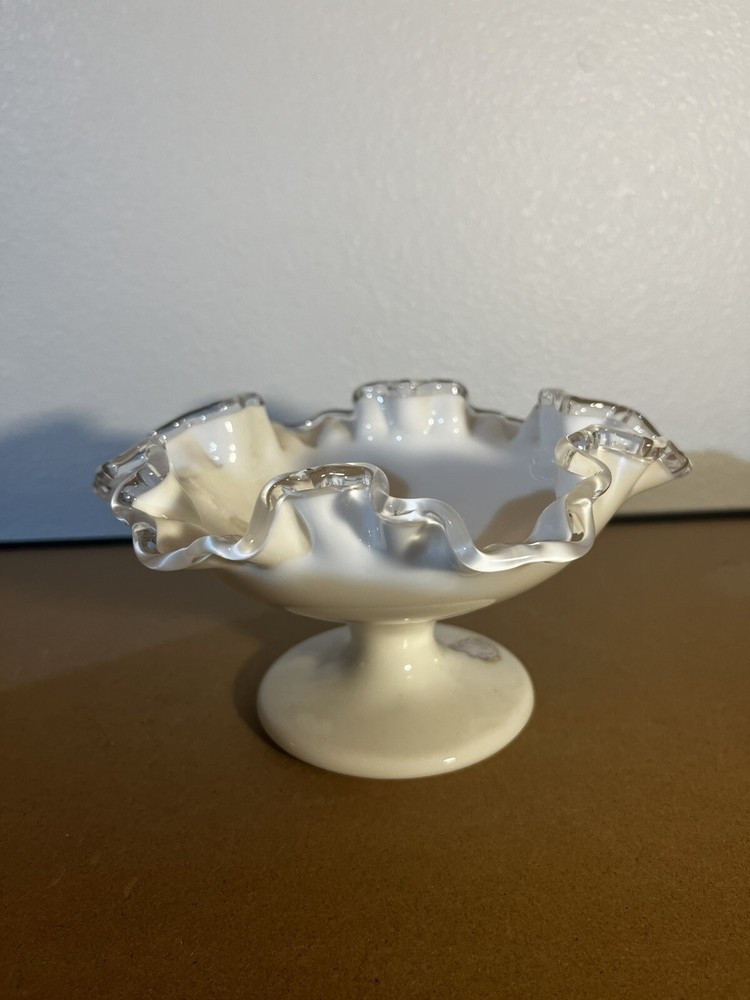 Vintage Fenton Glass Silvercrest Crimped Ribbon Edge Pedestal Bowl Vase is a decorative Mid-Century Modern piece from the 1960s. This white milk glass vase features a crimped ribbon edge design, suitable for display. Made by Fenton in the United States, this glass bowl exudes elegance and charm, perfect for adding a touch of vintage flair to any space.