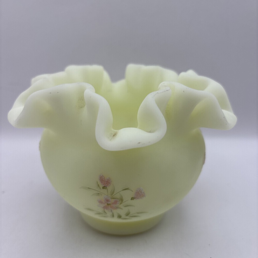 This vintage Fenton glass bowl features a beautiful hand-painted floral design in yellow and lime green colors. Made in the United States as part of the Art Glass production style, this piece is signed by the artist and showcases the brand's quality craftsmanship. With its charming flower theme and unique color combination, this Fenton glassware would make a lovely addition to any collection of decorative pottery and glassware.