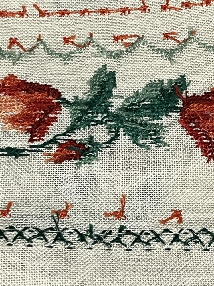 This is a lovely lot of five rose buds done extremely well. The one even has little seed pearls sewn into the bottom border. These are very shabby Chicish, cottage. I was going to frame in metal frames to hang as a small wall collage and never got round to it. Please blow up to see the beautiful details and colors these are more like a burnt orange, orangey pink hue if that is even a color (lol) with the two different greens. Please ask any questions you may have and look at photos I also put ruler for sizes. Comes from clean smoke free home! Happy Holidays!