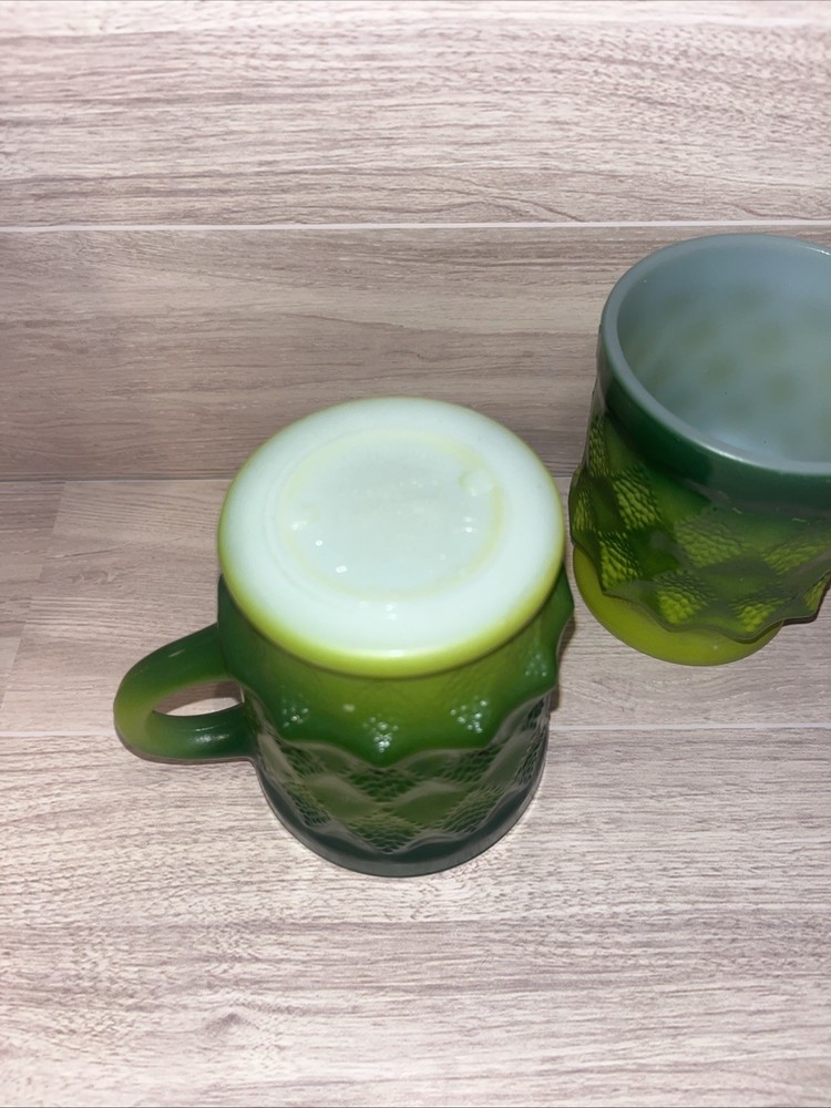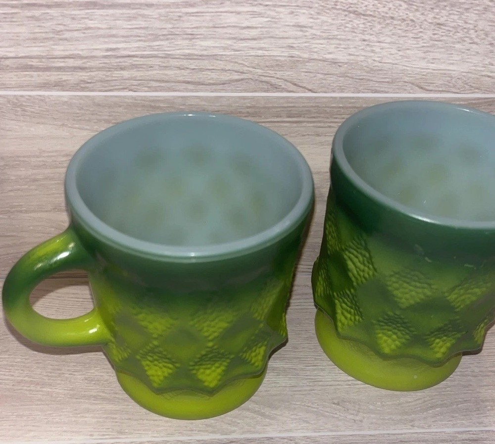 The product is a set of two vintage Fire King Anchor Hocking Kimberly Diamond ombre coffee cups retro mugs from the 1970s. These round, glossy milk glass mugs feature a retro style with a Kimberly Diamond pattern and multicolor decorative design. Made in the United States, these coffee mugs are hand wash only and stand at 3.8 inches tall with a 3-inch diameter. The mugs are a unique addition to any collection, perfect for all occasions, and showcase the American theme and production technique of the time period.