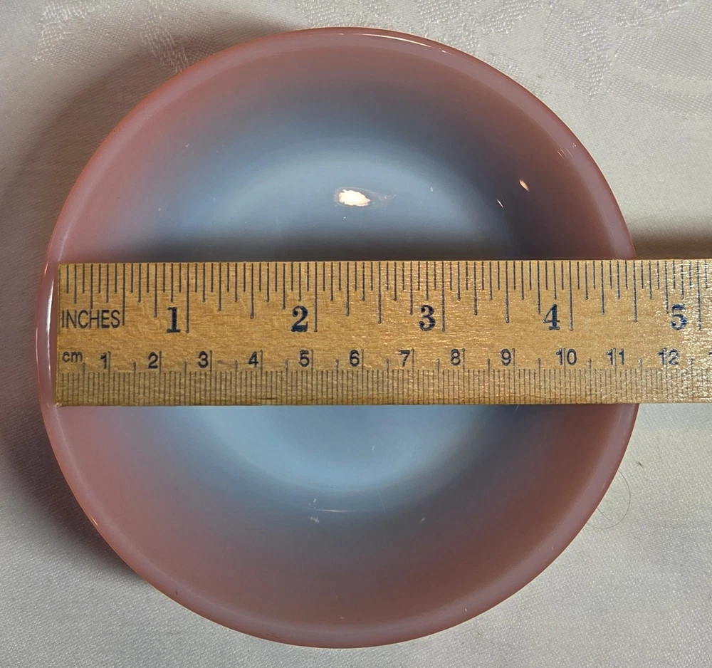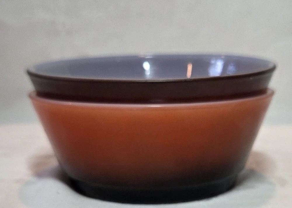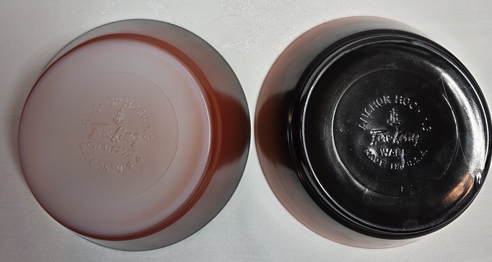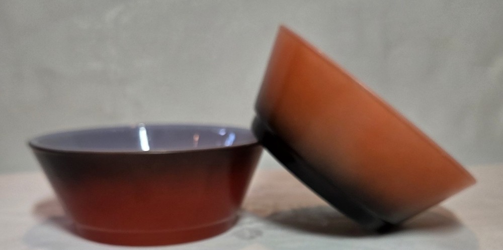 The product is a set of 2 vintage Fire King Pink/Black Ombré bowl stackable cereal bowls from Anchor Hocking. Made of glass with a glossy finish, these round bowls feature a multicolor ombré pattern and measure 2 inches in depth and 4.5 inches in diameter. Manufactured in the United States during the 1960s, these collectible bowls are a unique addition to any kitchen or dining space, embodying a retro design with a fire-themed aesthetic.