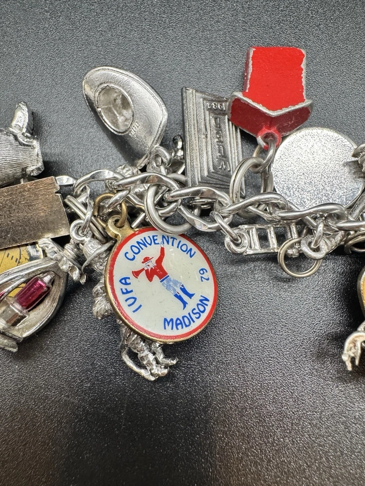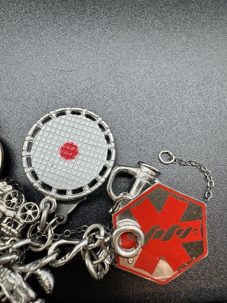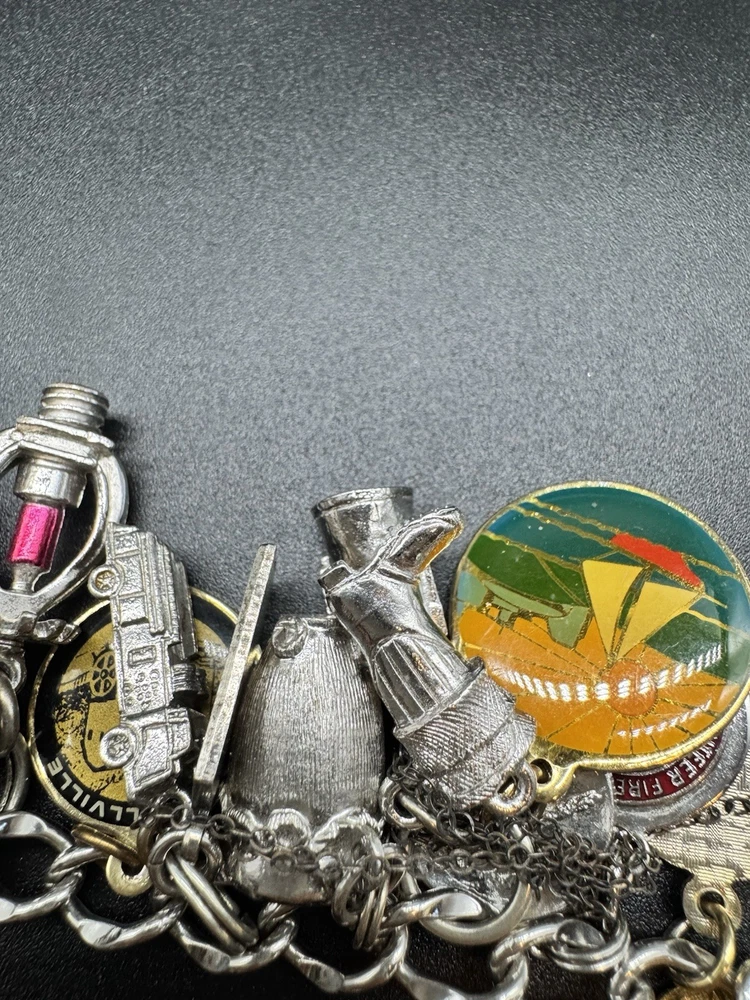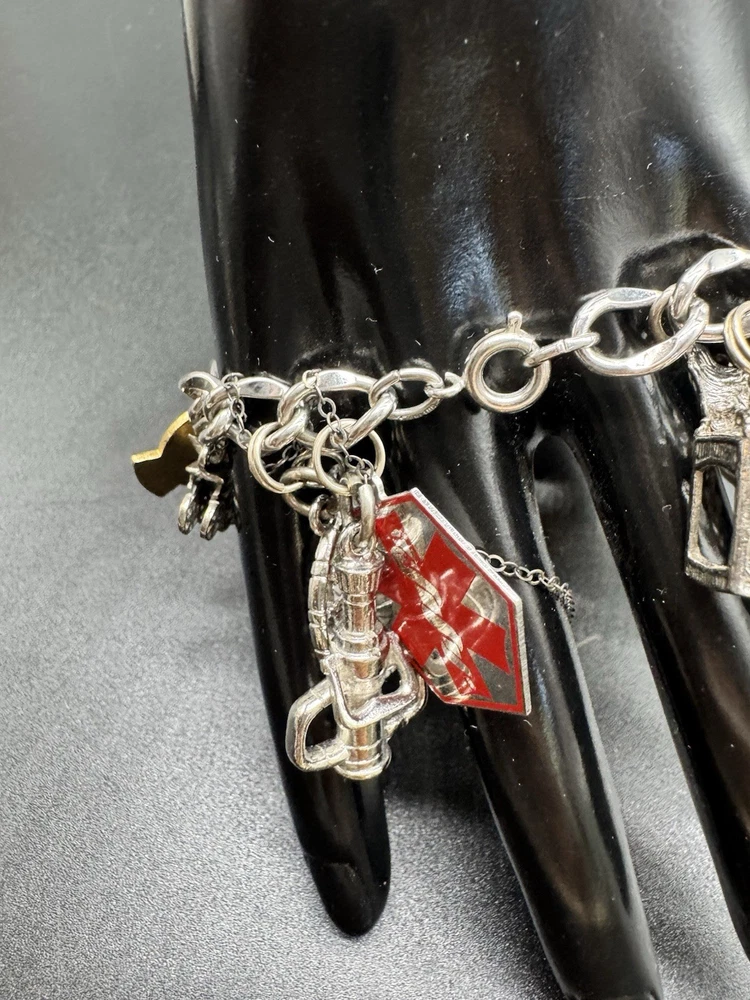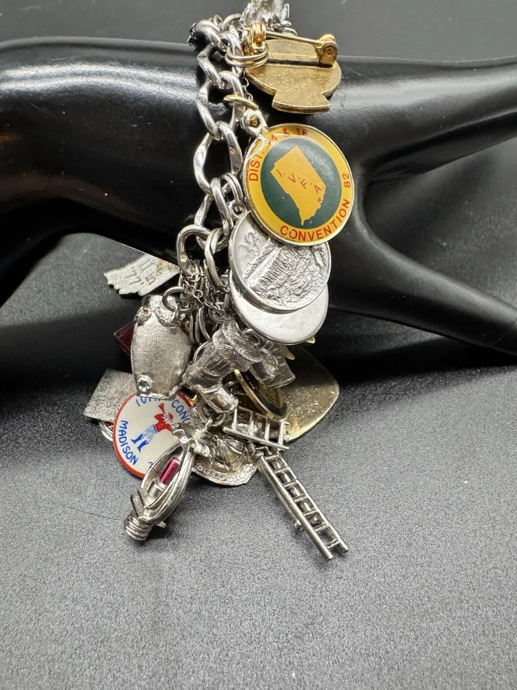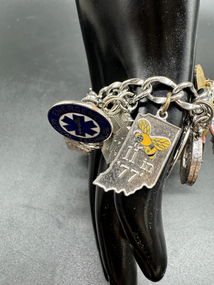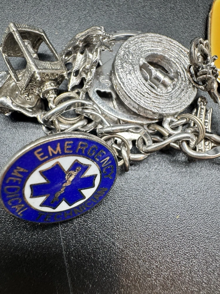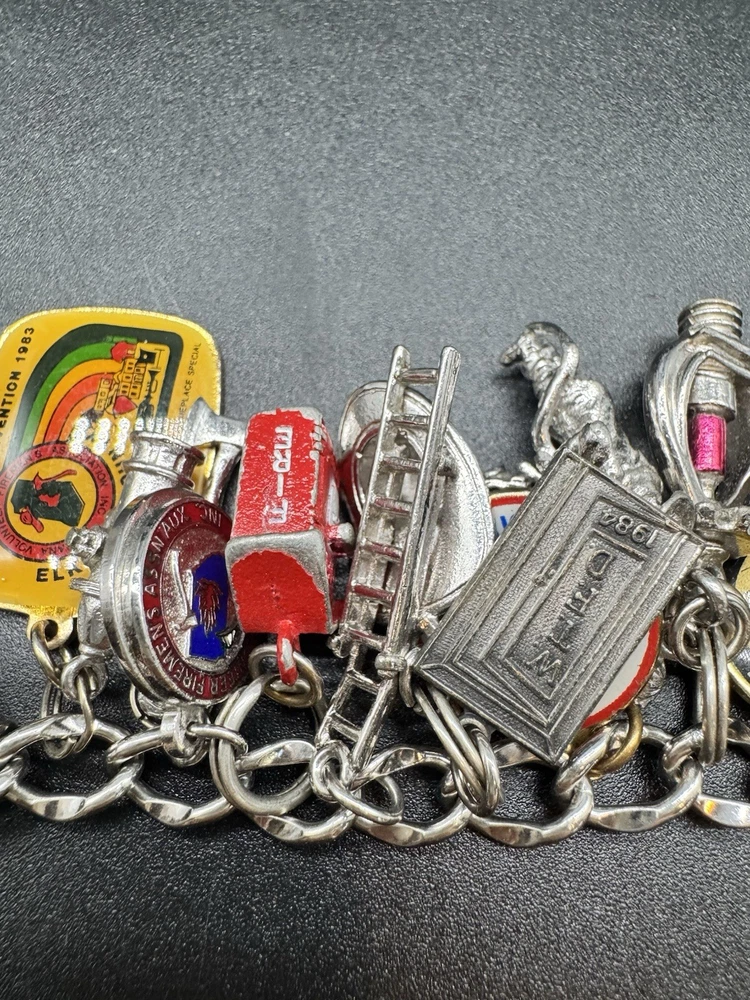 Vintage Firefighter Charm Bracelet Loaded! IUFA EMT Elks Conventions 1962–83 ⸻ Description: This is a one-of-a-kind, heavily loaded vintage firefighter charm bracelet packed with nostalgia, history, and heart. Assembled over decades, it includes commemorative charms from firefighter conventions (IUFA), EMT service, and vintage organizations like the Elks. This bracelet is ideal for collectors of firefighter memorabilia, emergency service history, or lovers of detailed charm jewelry. 🧯 Over 25 charms and badges, including: • 🧑🚒 1962 IUFA Convention - Madison, WI enamel badge • 🧯 1982 IUFA Convention District 14 & 16 charm • 🏛️ 1983 Elks Firefighters Convention - El Paso, TX • 🚒 Red fire truck with ladder and engine detail • 👨🚒 Firefighter figurine holding a rescued kitten (incredible detail!) • 🔥 Coiled fire hose, hydrants, axes, fire ladders • 🆘 EMT, EMS, and red & blue enamel Maltese crosses • 🏅 Indiana state charm “11 in ’77” with a bee emblem • 🧢 Mini firefighter helmet marked STER (possible sterling silver) • 🔧 Brass tone and enamel convention pins • 🛠️ Vintage mechanical and 3D fire equipment charms • 🕯️ Lantern, log cabin, crab, and firefighting gear charms This bracelet tells a story of dedication and bravery through carefully collected and worn memorabilia. Some enamel loss and vintage patina are visible, consistent with age and use. Length is approx. 7.5 to 8 inches. The bracelet is silver-tone metal with some charms possibly being sterling or brass (unmarked or partially marked). ⸻ Item Specifics: • Type: Vintage Charm Bracelet • Theme: Firefighter / EMT / Convention / Rescue • Material: Mixed Metals (Silver-tone, Brass-tone, Enamel) • Length: Approx. 7.5–8 inches • Main Colors: Silver with red, yellow, and blue accents • Condition: Vintage pre-owned; good condition with visible wear • Decade Coverage: 1960s–1980s • Signed: One charm marked “STER” (sterling) ⸻ Search Tags (Background Keywords): Fireman charm bracelet, vintage fire department jewelry, firefighter collectibles, emergency responder charm bracelet, vintage EMT jewelry, Elks convention memorabilia, IUFA charm, first responder bracelet, firetruck charm, firehose charm, red enamel cross jewelry, vintage fireman kit, firefighter gift idea, collectible charm jewelry ⸻ Shipping Info: I try to ship within 24 hours, with the exception of weekends and holidays. I carefully pack all items to ensure safe delivery. 💌 Be sure to check out my other listings—I post vintage treasures daily! Follow my shop for more historic, whimsical, and one-of-a-kind finds. ✨ Thanks for shopping with Vintage Wowzers. Have a wonderful day! ⸻JUNE0025