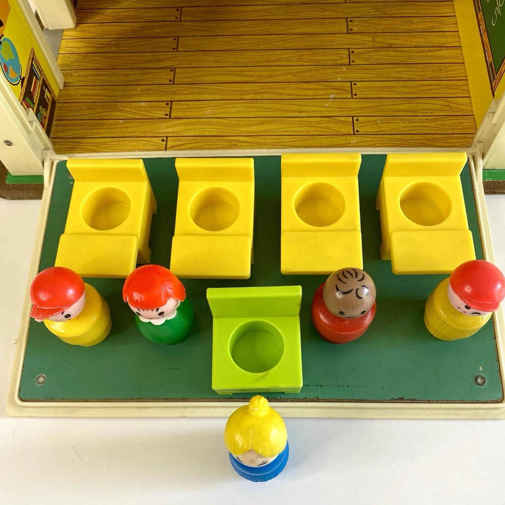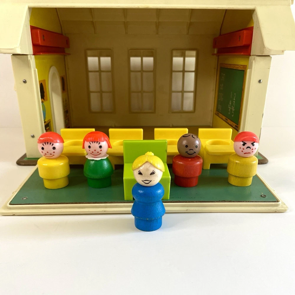Fisher Price Play Family School partial set, vintage from the early 1970s, containing: School house Little People figures: a blonde teacher and 4 kids; 2 are original from the set (Black boy and redhead girl) and 2 came from other sets (white boys with baseball caps); 1 baseball cap boy is all plastic, and the others have wood bodies with plastic heads 1 green teacher chair and 4 yellow student desks Merry-go-round and swing set Craft table (not part of original set) The entire set is in good to very good used condition, having been played with by a few generations over the past 50 years; see photos for current condition. It's clean and sturdy and ready to be played with by the next few generations!