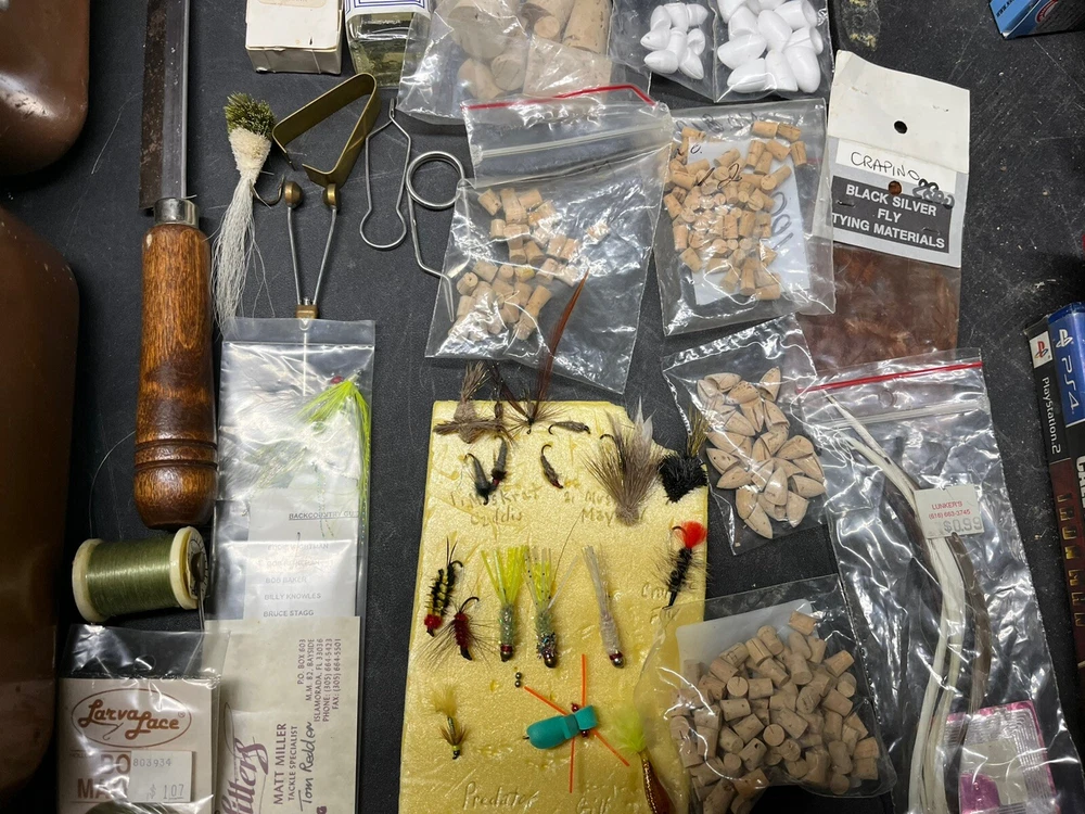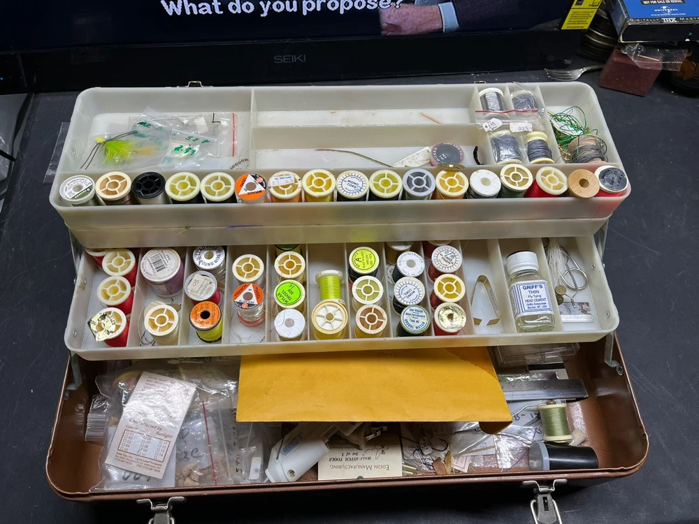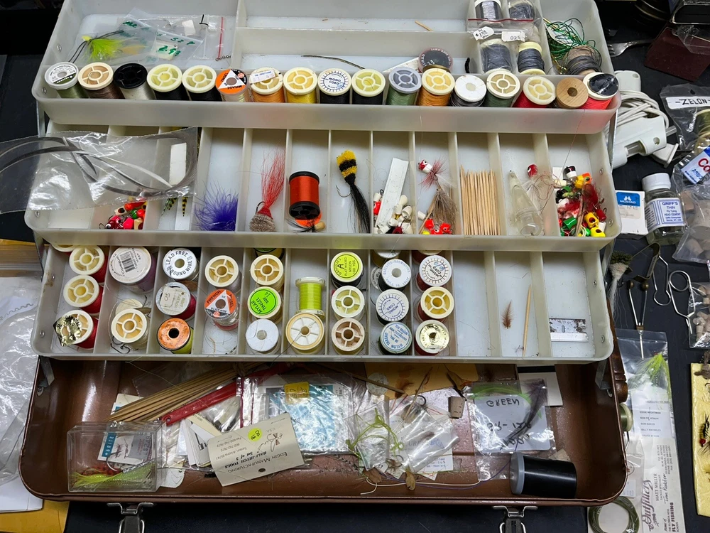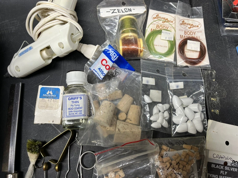 The product is a vintage fishing lot that includes new and used tackle such as hooks, lures, and items for fly fishing. The bait type is crankbait, suitable for freshwater fishing. The bait shape is fish, and the color is multicolor. This fishing lot is versatile, suitable for targeting all fish species. There are tons of line, feathers and other materials for creating your own lures and tools to help with the assembly of the lures for fly fishing and comes within a fishing tackle box