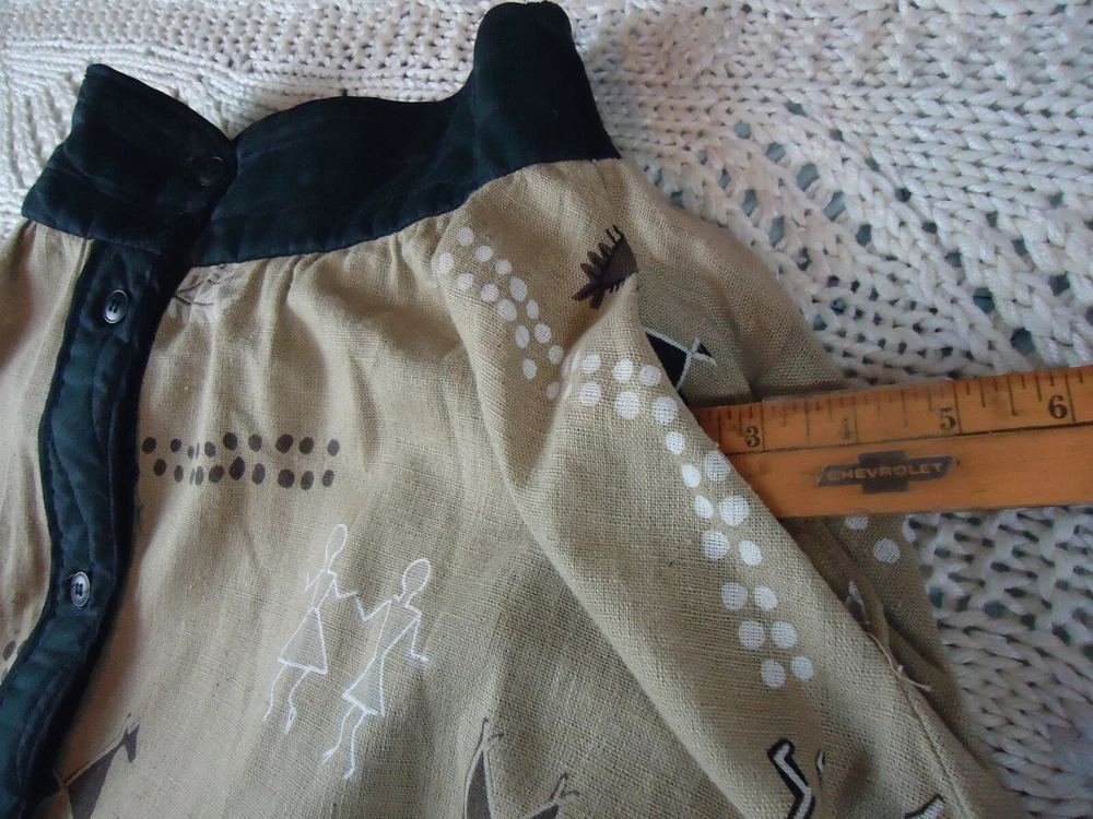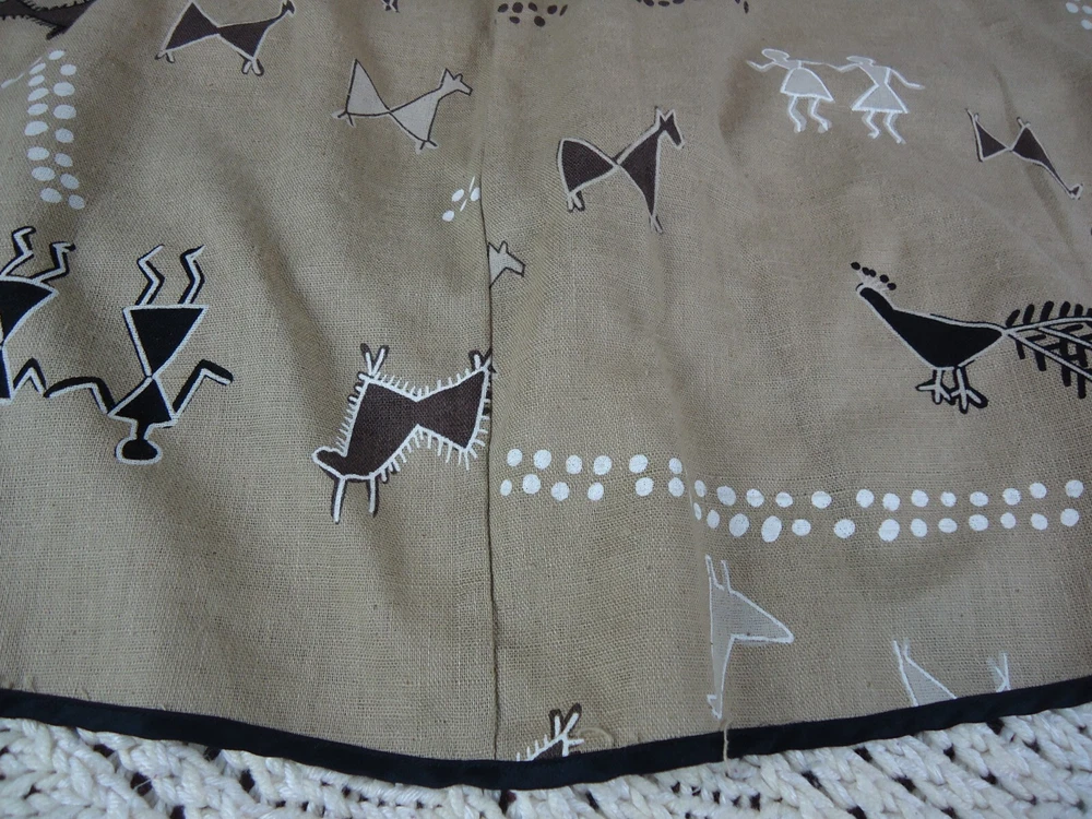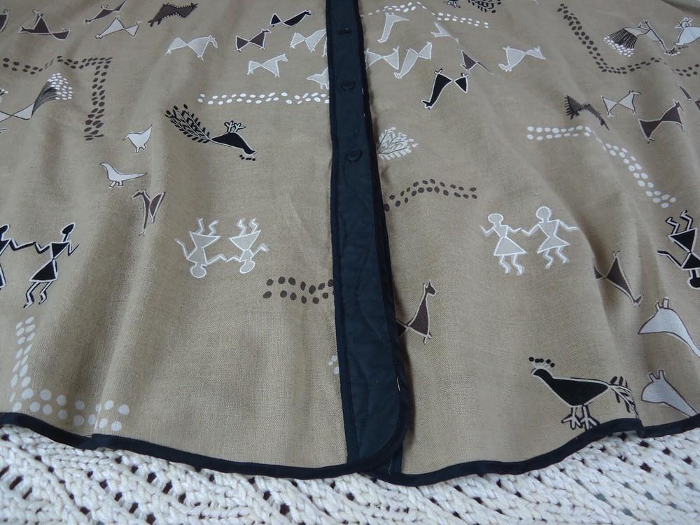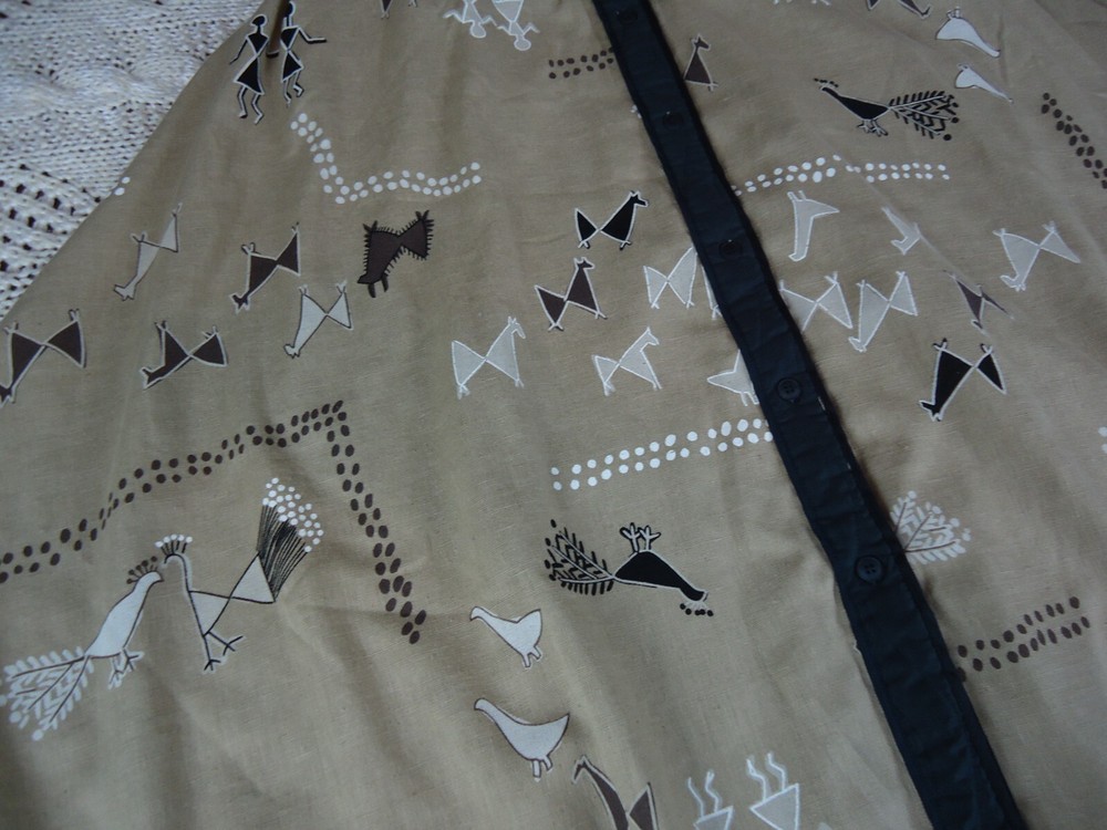 Color: beige, black, brown, white Material: not on the tag Country/Region of Manufacture: United States Season: Fall, Spring, Summer, Winter Vintage: Yes Department: Women Closure: Button Style: Flare Type: Skirt Size Type: Regular Size: S Brand: Jeanne Marc Accents: quilted front waist panel and detail down the front, elastic waist in the back, full button front Pattern: cave art, animals, people, birds, peacock, lama, alpaca Skirt Length: Long Theme: VTG, Crunchy, Earthy, Witch, Outdoors, Fall, Desert, Southern, Ranch, BOHO, Lagenlook, Art, Animals, 80s, Aztec, Bohemian, Hipster, Hippie, Nature, Retro, Southwestern, Tribal