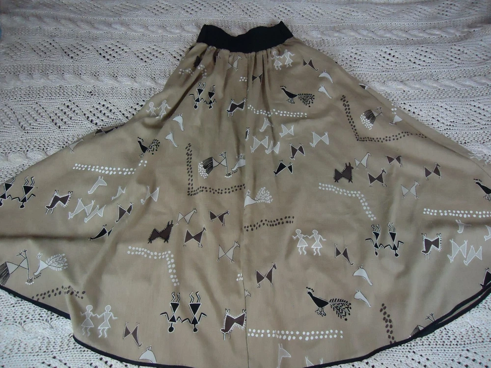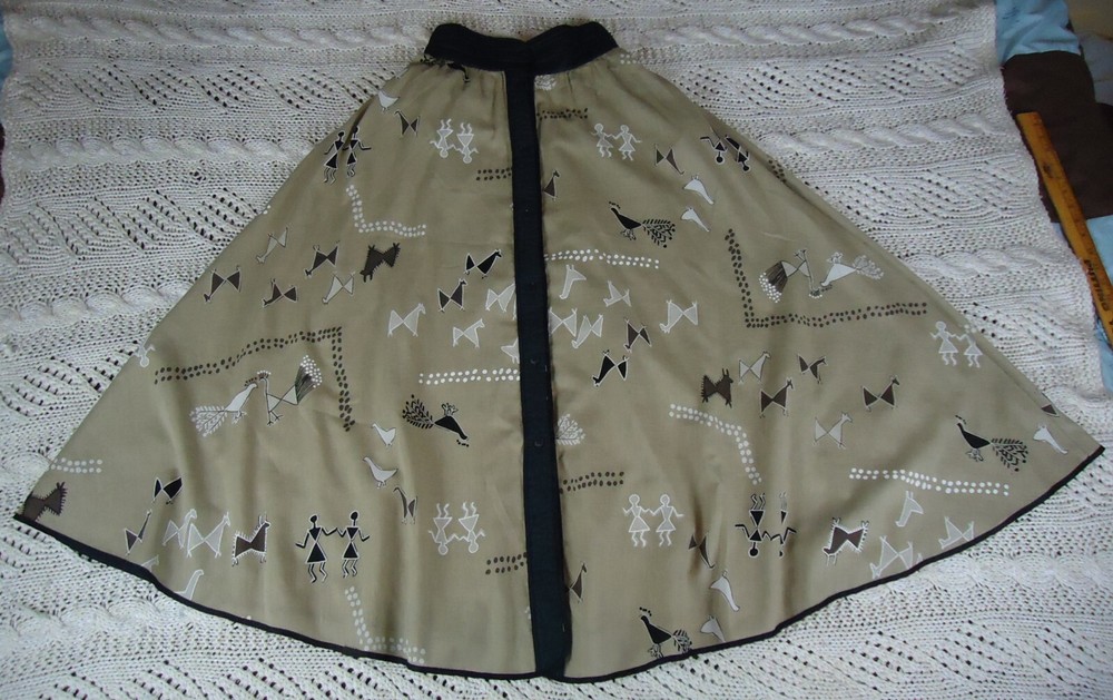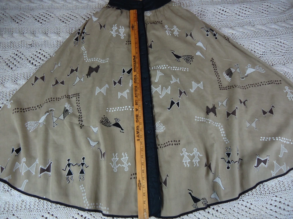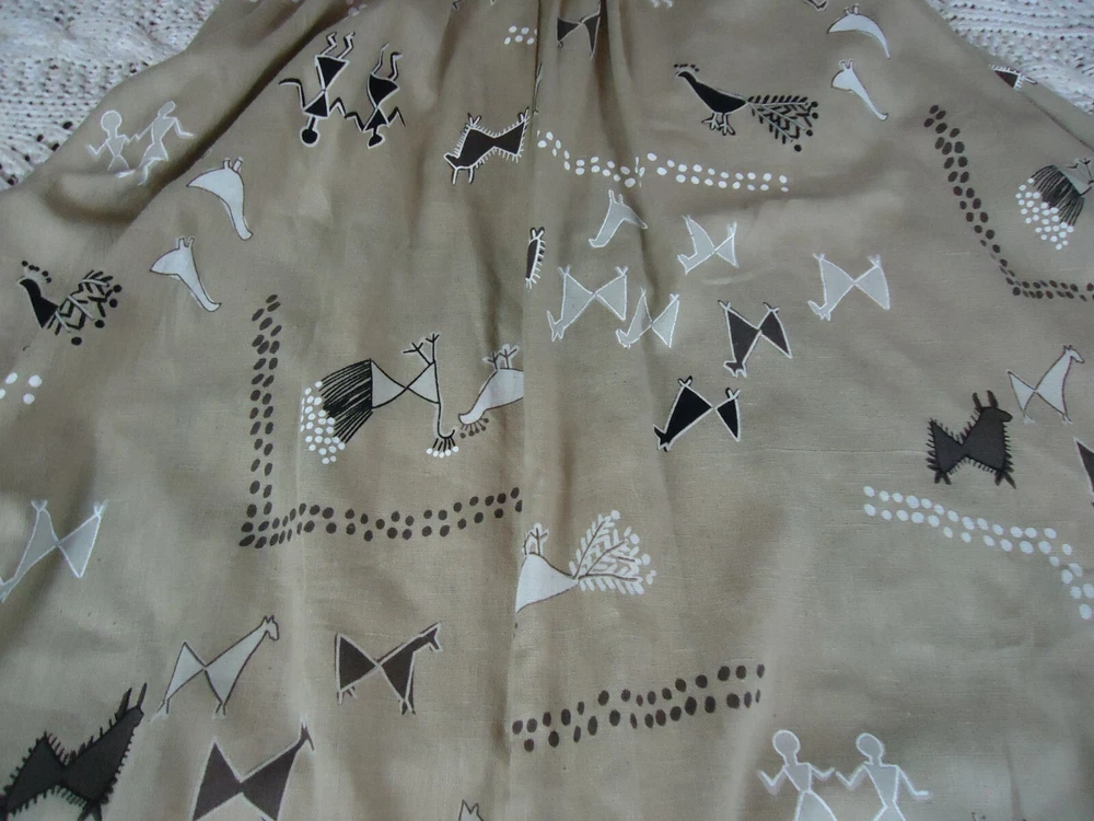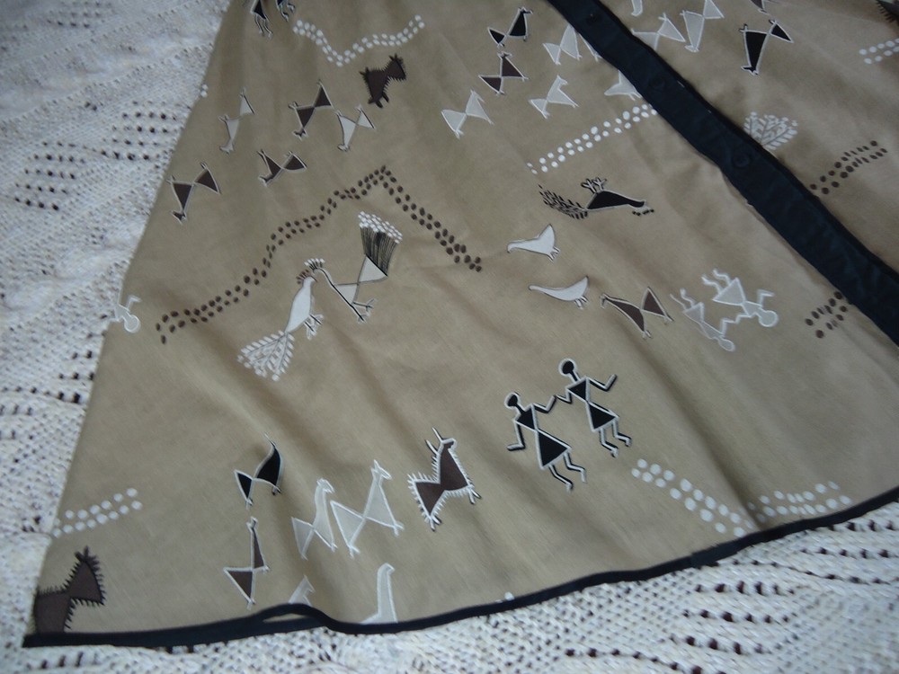 Jeanne Marc Size S Women's Long Flared Novelty Print VTG Cave Art Southwestern. This is in preowned used condition and as such may show some minor signs of wear but it is in great condition overall. T6