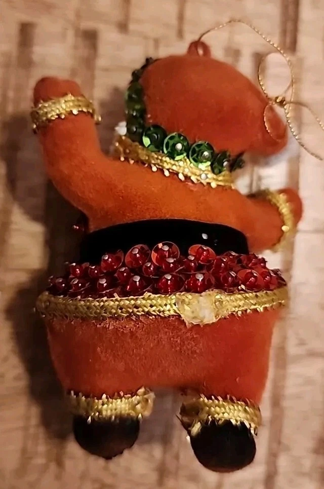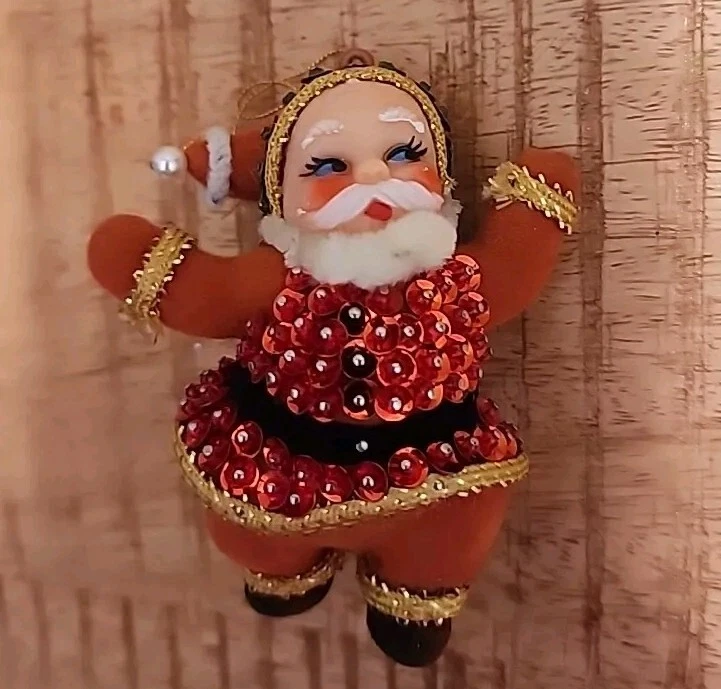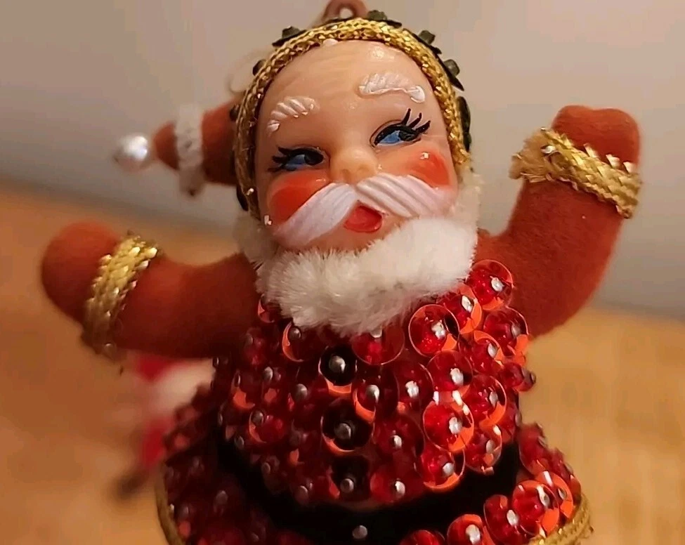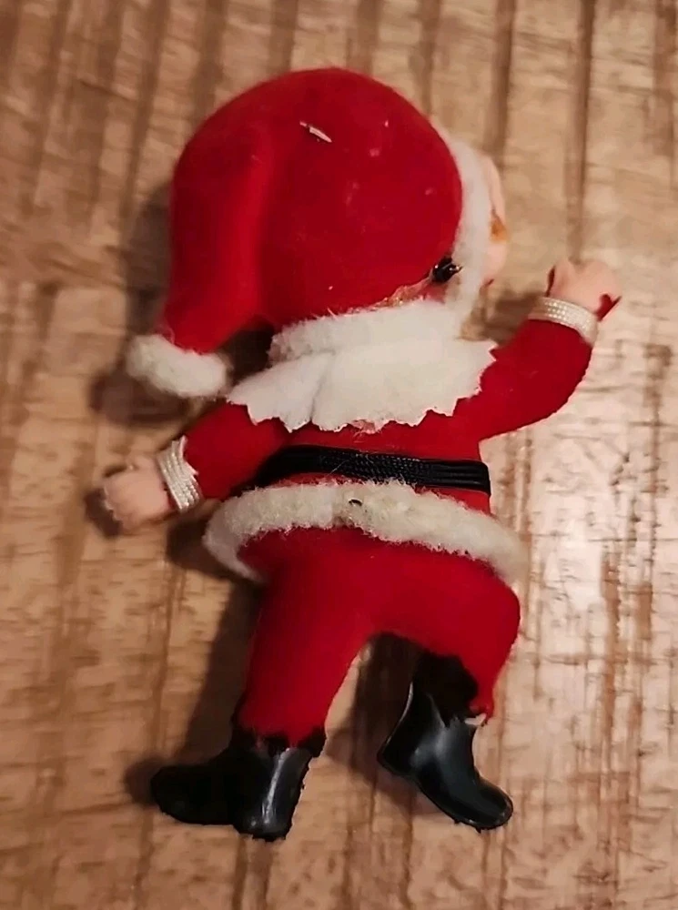 This vintage ornament set features a Santa adorned with beads and sequins, creating a festive and whimsical look and a Elf flocked red mid century Pixie made in Taiwan. The ornaments are 3" and 4" in size and depict classic holiday characters from the 1950's-1960's. The Santa and Elf figures are part of the Christmas-themed collection and would be a charming addition to any room during the holiday season. This ornaments set captures the nostalgic charm of mid-century holiday decor. All sales are final.
