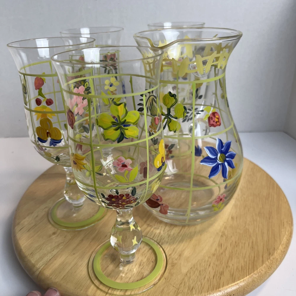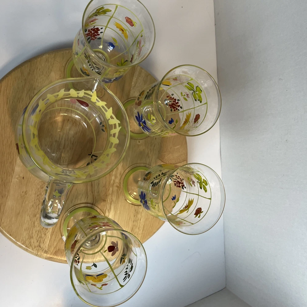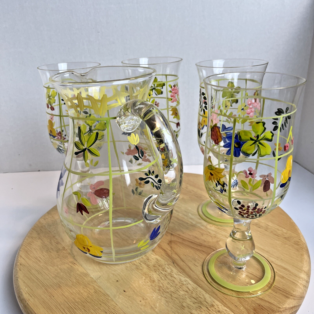Vintage Pitcher & 4 Stemmed Glasses Hand Painted Flowers Summer Cottage Core. Great for wine, lemonade, ice tea, any summer drinks