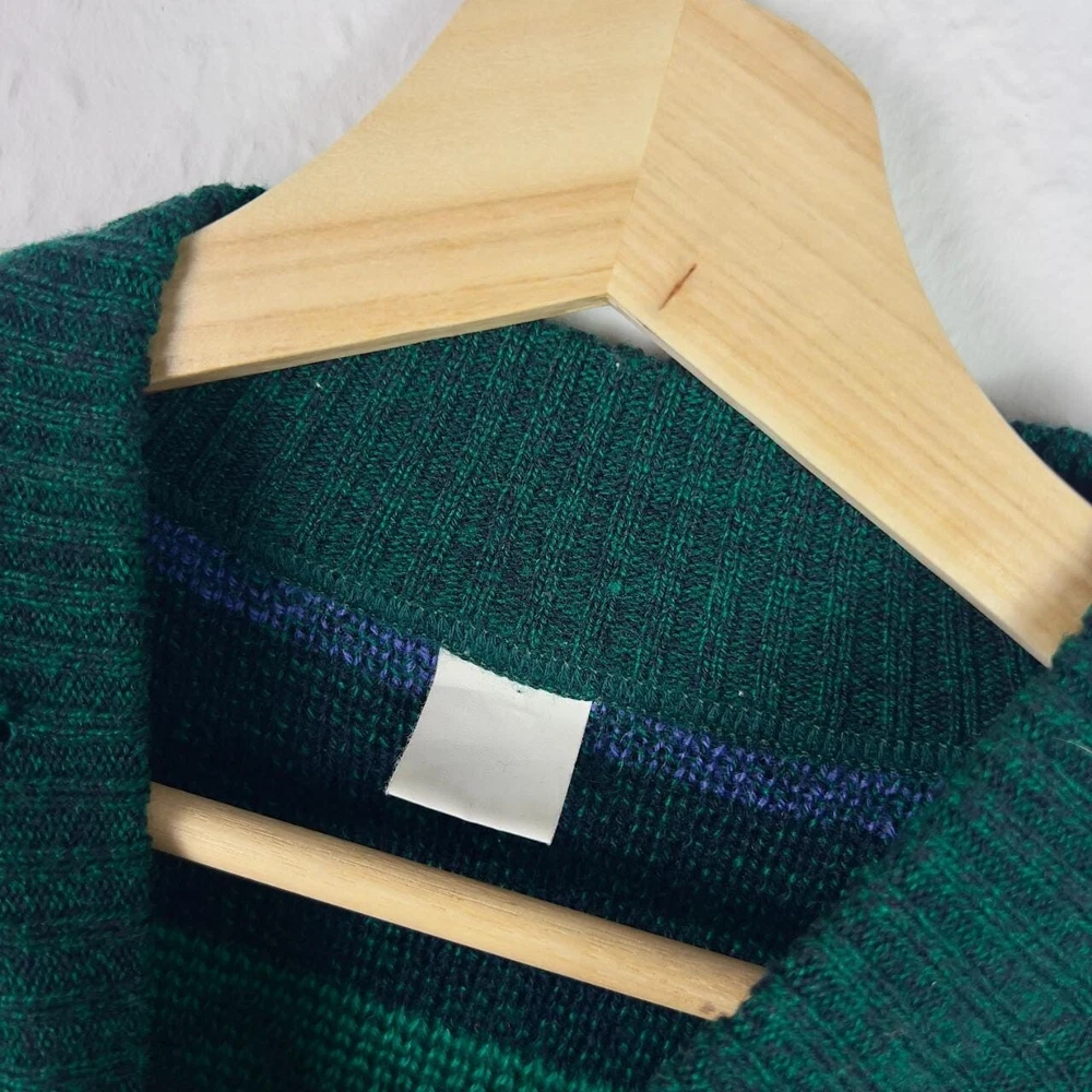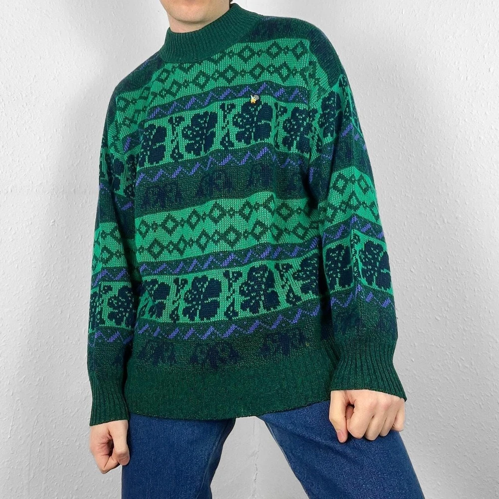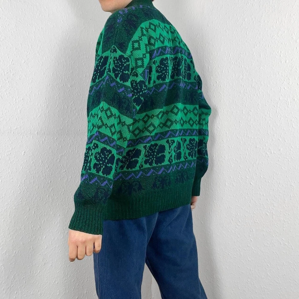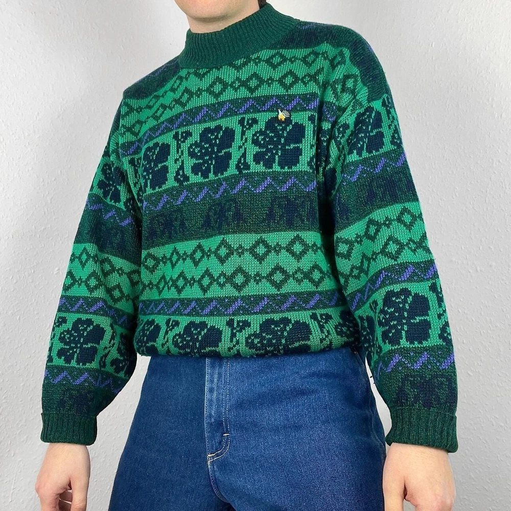 Vintage knitted jumper in green with funky floral & striped geometric pattern. Mock neck sweater, in great condition. Fits approx. a size medium or suits smaller oversized, measurements below Length: 27 inches Pit to pit: 24 inches £3 UK P&P 💌 Model is 5’9 and a men’s medium Please get in touch for more measurements All items are second-hand so please expect small signs of wear - any major flaws will be noted