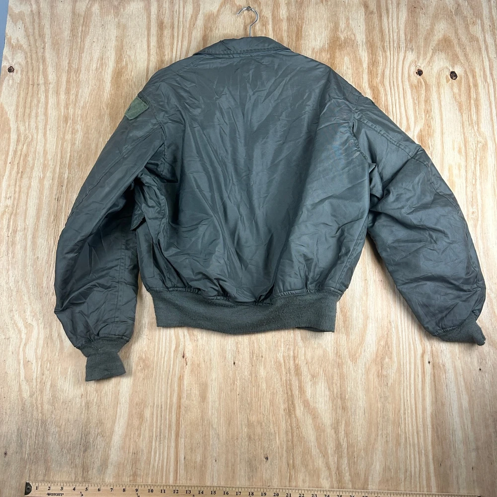Stay warm and stylish with this vintage Flyer's Cold Weather CWU-36/P jacket from the US Army. The jacket features a full zip closure and solid green color with a logo accent. It is made of lightweight nylon material with polyester insulation, making it perfect for walking, hunting, and hiking during summer, fall, and spring seasons. The jacket also has pockets to keep your essentials safe and secure. This jacket is a size XL and fits regularly. It is suitable for travel, casual wear, and workwear. The garment care requires dry cleaning only. This jacket is a must-have for any vintage clothing enthusiast and is perfect for those who want to add a touch of style to their wardrobe. SKU: PK-36-82