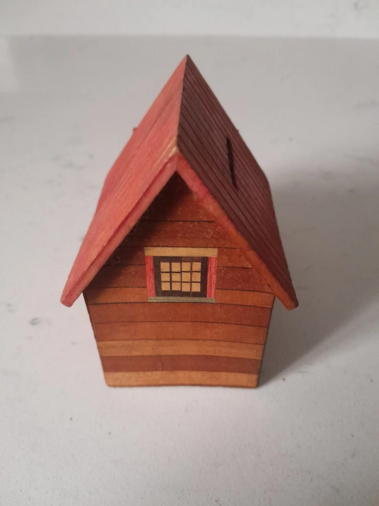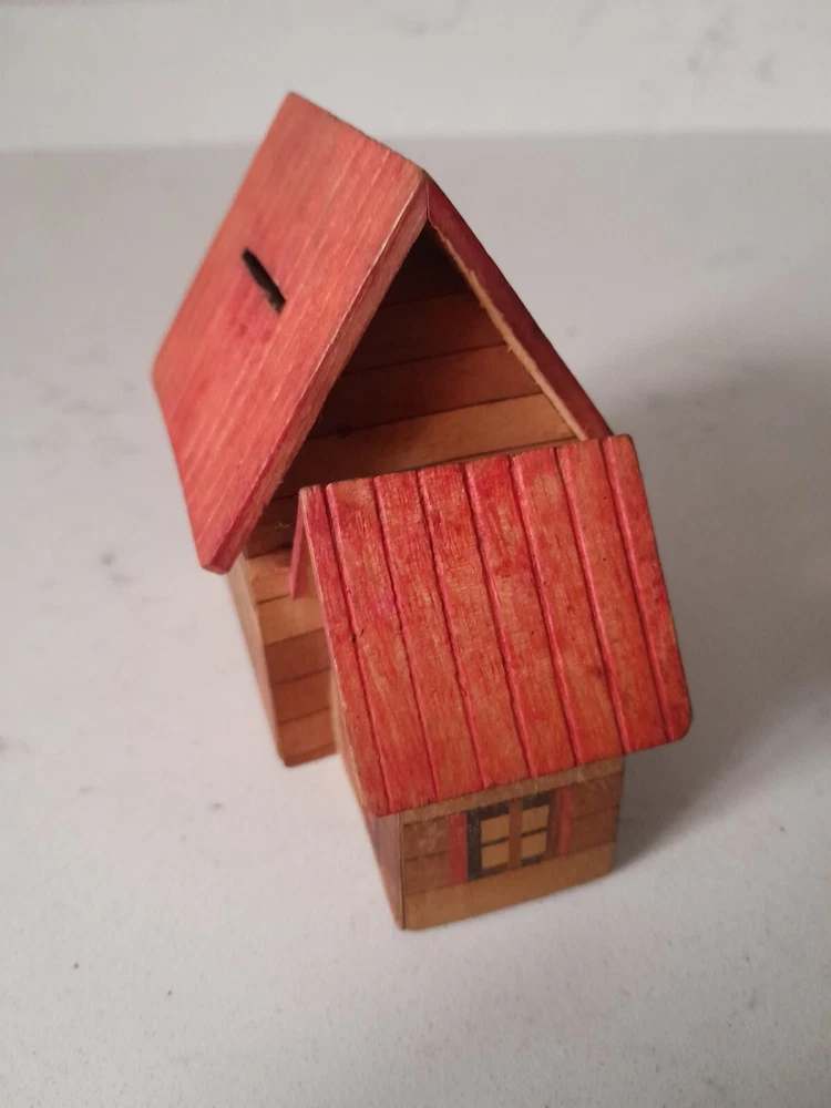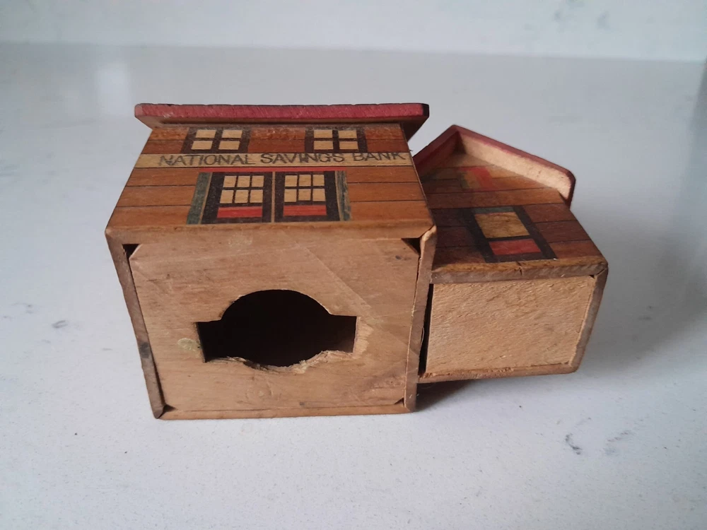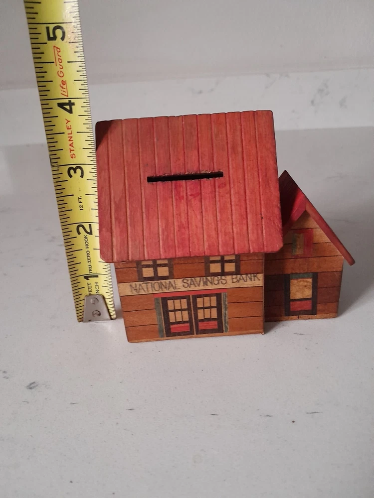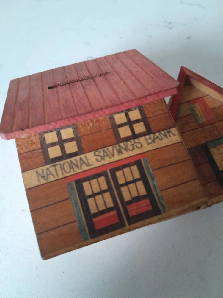 This is a Vintage Folk Art Painted Wooden National Savings Bank Coin Bank. It is an original piece made of wood in the United States. This coin bank features unique folk art painting and serves as a decorative and functional item for saving money. Missing plug