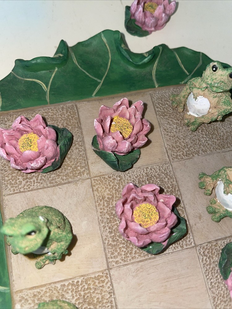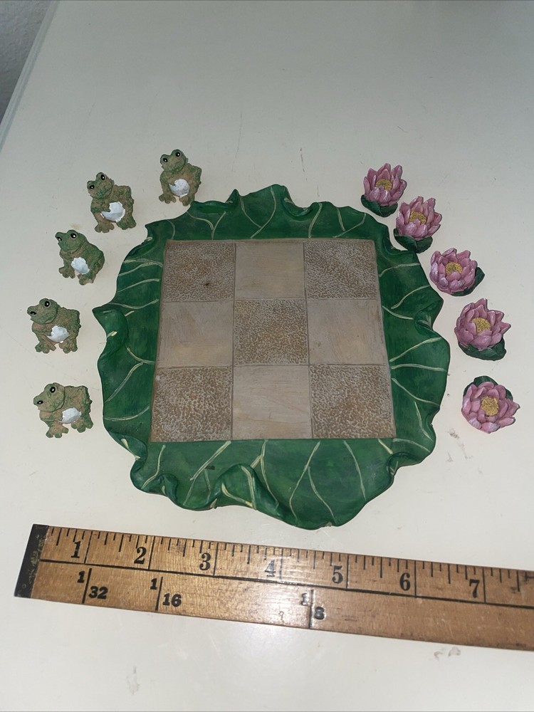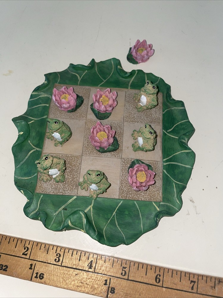 This vintage stoneware tic tac toe game is a unique piece of folk art that will add a touch of charm to any collection. Handmade by Lyn Ganoe in 2002, this statue features miniature frogs and flowers with vibrant colors that make it a decorative piece perfect for any gaming enthusiast. The game is contemporary, produced in the United States, and made of clay and stone materials. The sculpture is 6.5 inches long and 6 inches wide, with a period of production from 2000-2009. It is signed by the artist and features a handmade design that showcases the culture of folk art. This item is perfect for collectors who appreciate unique and vibrant pieces that add a touch of history to their collection. It would make an interesting gift especially for those who love games.
