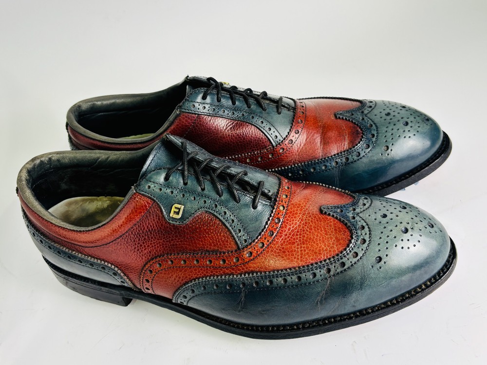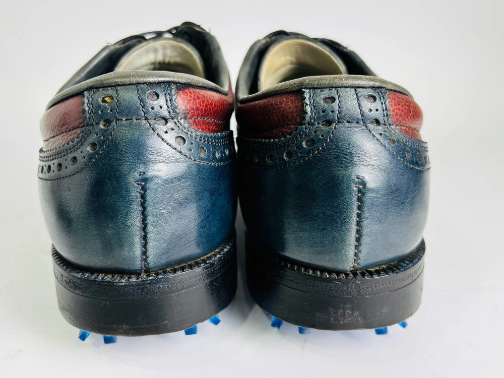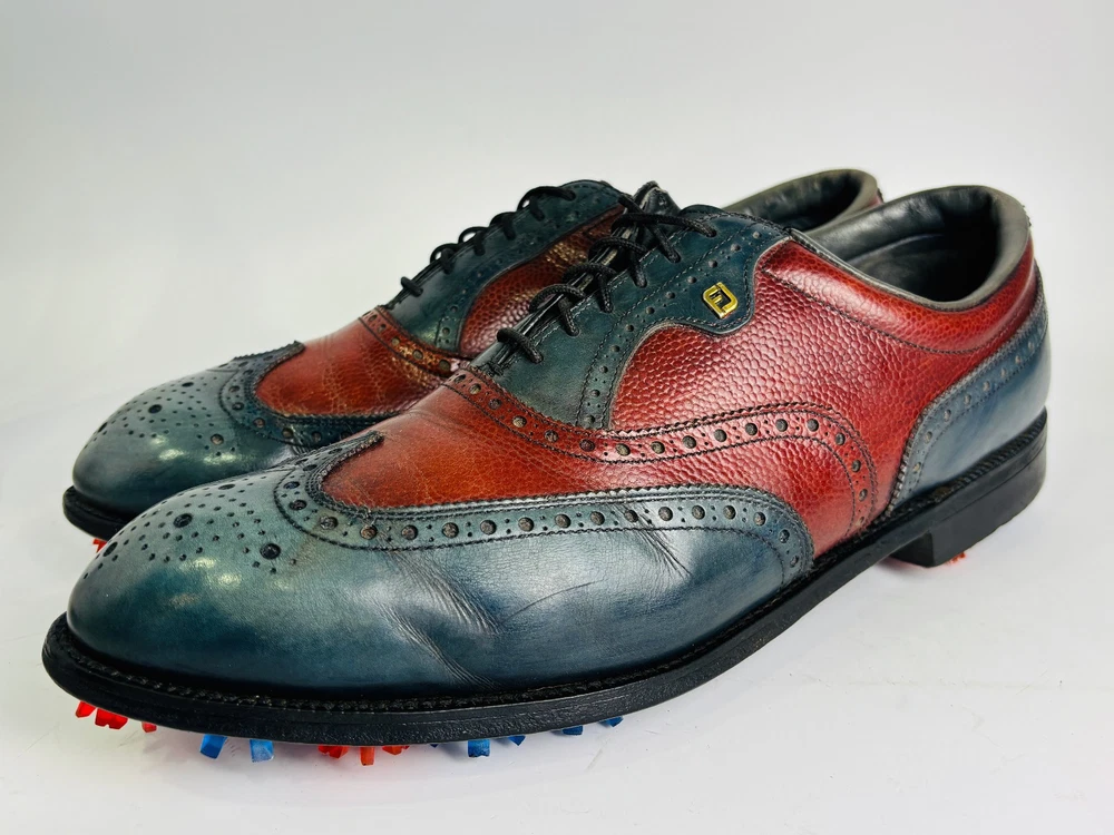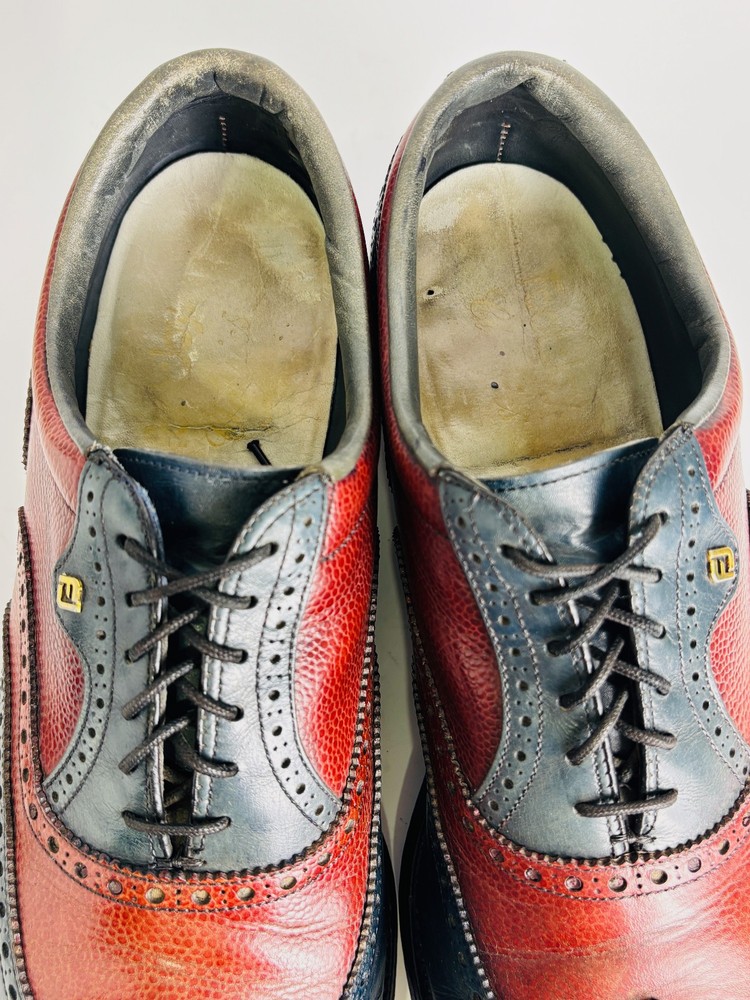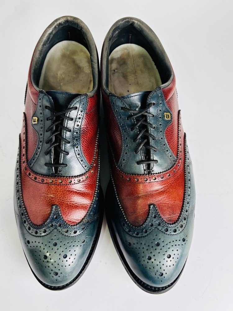 Offered here is a rare and collectible pair of vintage FootJoy wingtip golf shoes , size 11.5 D , proudly Made in the USA . These two-tone leather classics feature bold red pebble-grain panels contrasted with deep blue smooth leather, full brogue detailing, and new soft spikes. These shoes were crafted during the golden era of FootJoy manufacturing, when every pair was hand-finished in their Brockton, Massachusetts facility. That factory closed in 2008, marking the end of U.S.-made FootJoy footwear — making surviving pairs like these truly scarce. FootJoy has long been considered the gold standard in golf footwear, worn by legends such as Jack Nicklaus, Tom Watson, and Payne Stewart . Vintage USA-made FootJoys are highly sought after by collectors and golfers who appreciate their superior craftsmanship, premium leather, and timeless style. With the supply permanently capped, values for well-preserved examples are only expected to rise. Condition : Very good vintage condition overall. The uppers are supple and retain rich color. There is a small rip in the heel counter (photographed) that has been sealed with cement and clear tape for stability, but it will need a proper repair for long-term wear. Spikes and soles are in excellent shape. Details: Brand: FootJoy Size: 11.5 D Color: Red pebble-grain & blue smooth leather two-tone Style: Wingtip full brogue golf shoes Made in USA – Brockton, Massachusetts factory (now closed) new matching soft spikes Collectible vintage golf footwear Why These Matter: FootJoy’s American-made shoes were built to a standard rarely seen today. The leather quality, hand-finishing, and Goodyear welt construction made them not only high-performance on the course but also durable enough to last decades. With production moved overseas and the U.S. factory gone, vintage models like these represent a piece of golf history — both wearable and highly collectible.