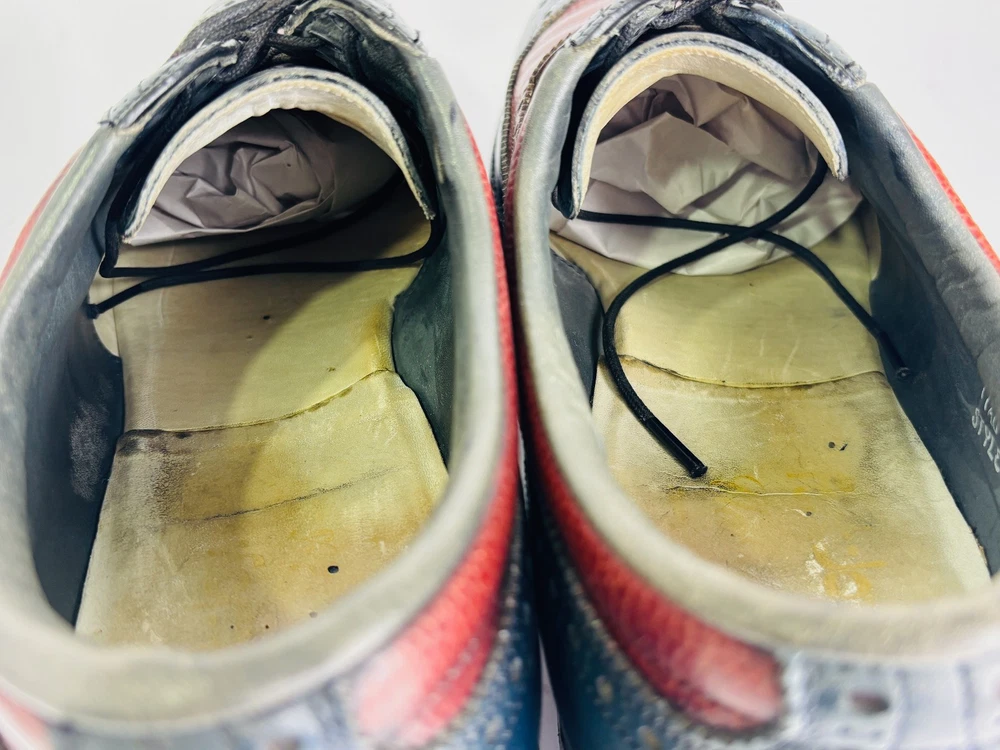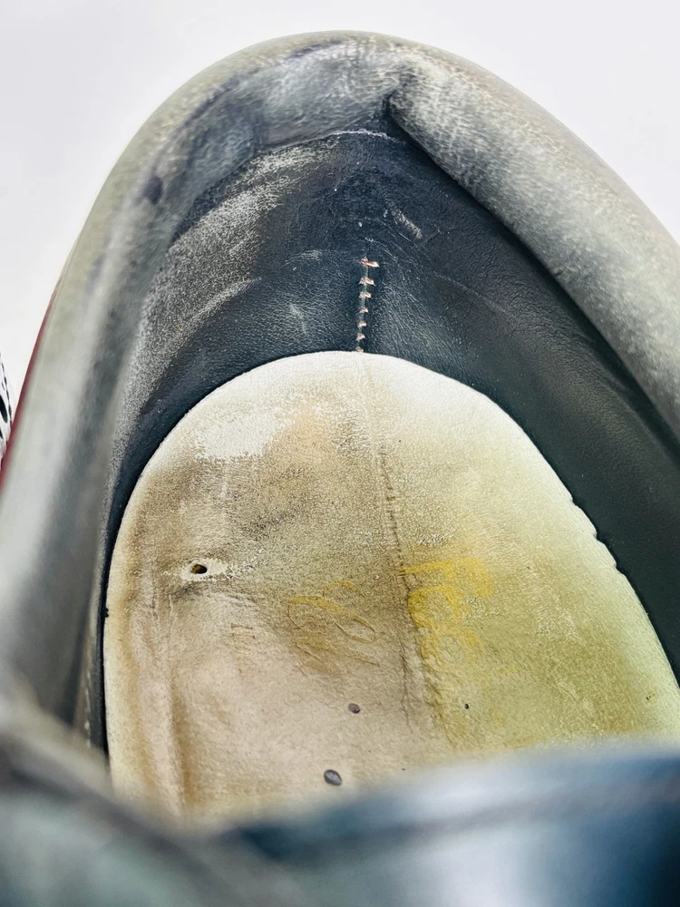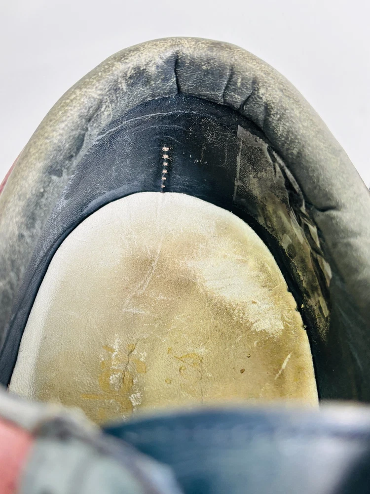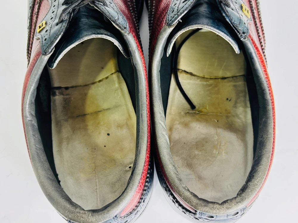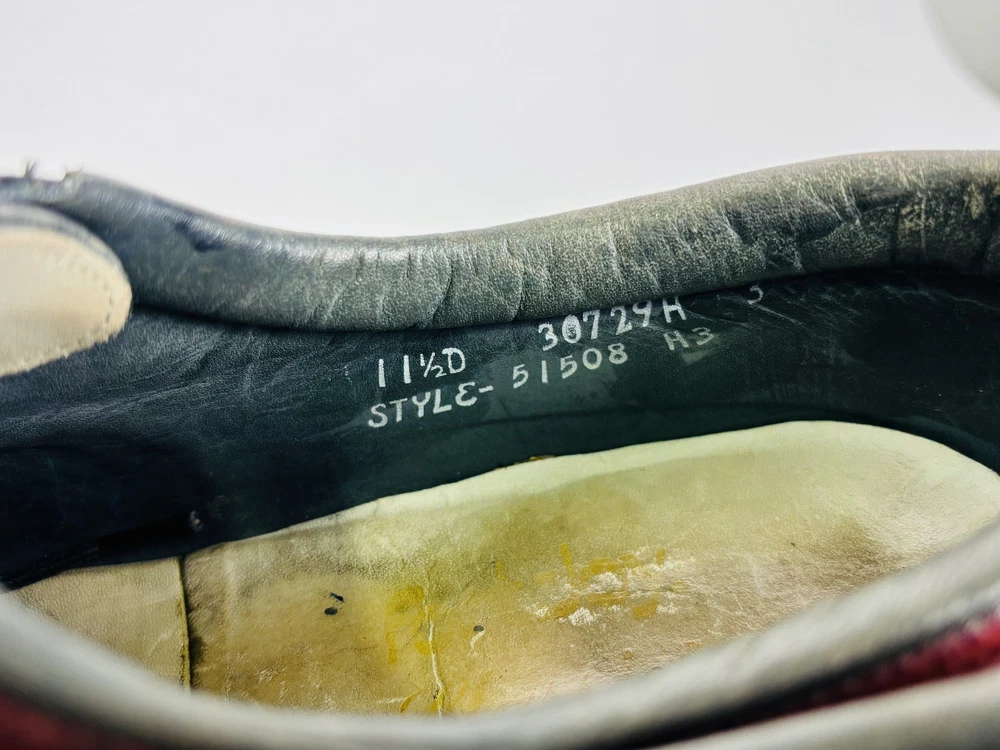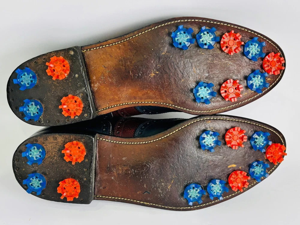Offered here is a rare and collectible pair of vintage FootJoy wingtip golf shoes , size 11.5 D , proudly Made in the USA . These two-tone leather classics feature bold red pebble-grain panels contrasted with deep blue smooth leather, full brogue detailing, and new soft spikes. These shoes were crafted during the golden era of FootJoy manufacturing, when every pair was hand-finished in their Brockton, Massachusetts facility. That factory closed in 2008, marking the end of U.S.-made FootJoy footwear — making surviving pairs like these truly scarce. FootJoy has long been considered the gold standard in golf footwear, worn by legends such as Jack Nicklaus, Tom Watson, and Payne Stewart . Vintage USA-made FootJoys are highly sought after by collectors and golfers who appreciate their superior craftsmanship, premium leather, and timeless style. With the supply permanently capped, values for well-preserved examples are only expected to rise. Condition : Very good vintage condition overall. The uppers are supple and retain rich color. There is a small rip in the heel counter (photographed) that has been sealed with cement and clear tape for stability, but it will need a proper repair for long-term wear. Spikes and soles are in excellent shape. Details: Brand: FootJoy Size: 11.5 D Color: Red pebble-grain & blue smooth leather two-tone Style: Wingtip full brogue golf shoes Made in USA – Brockton, Massachusetts factory (now closed) new matching soft spikes Collectible vintage golf footwear Why These Matter: FootJoy’s American-made shoes were built to a standard rarely seen today. The leather quality, hand-finishing, and Goodyear welt construction made them not only high-performance on the course but also durable enough to last decades. With production moved overseas and the U.S. factory gone, vintage models like these represent a piece of golf history — both wearable and highly collectible.