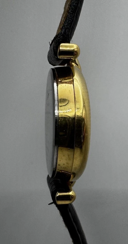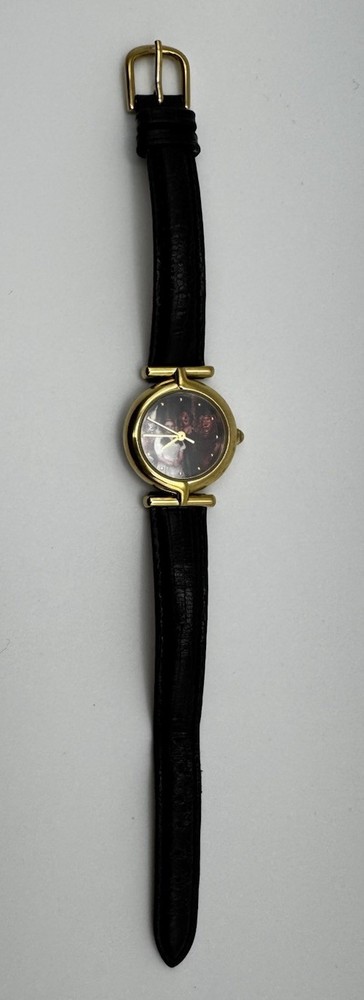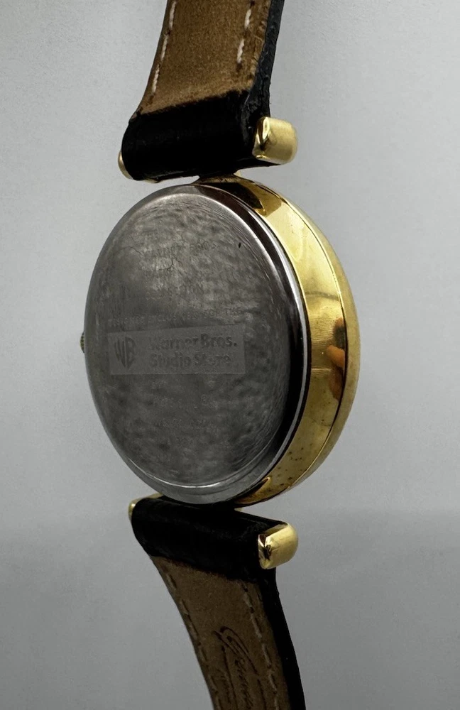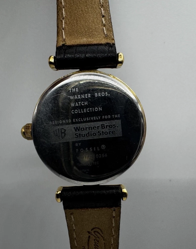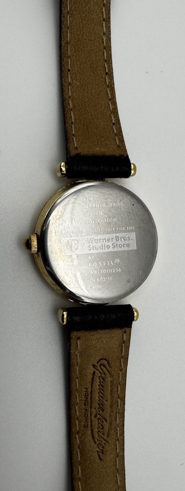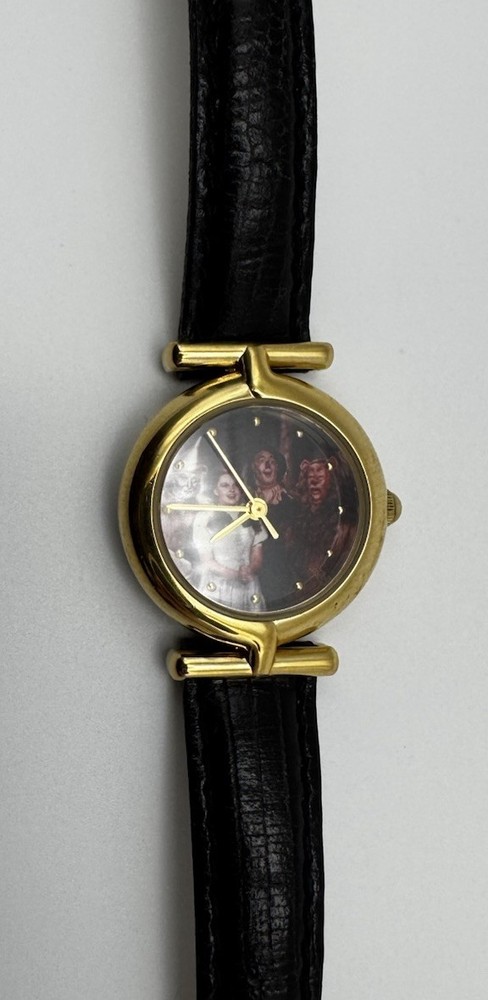 Vintage Fossil Warner Bros watch featuring Dorothy, the Tin Man, Scarecrow, and the Cowardly Lion on the dial. Gold‑tone case with a black leather strap. Fully working and shows light vintage wear. A nostalgic collectible from the Wizard of Oz Studio Store series.