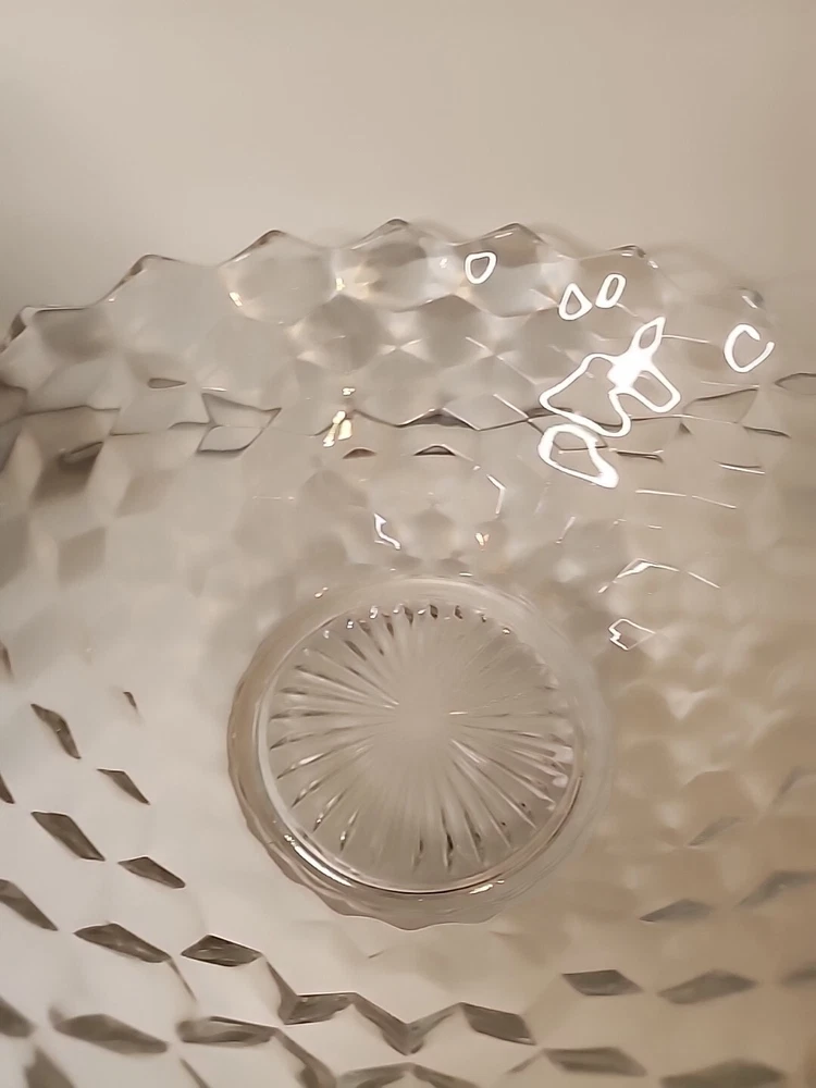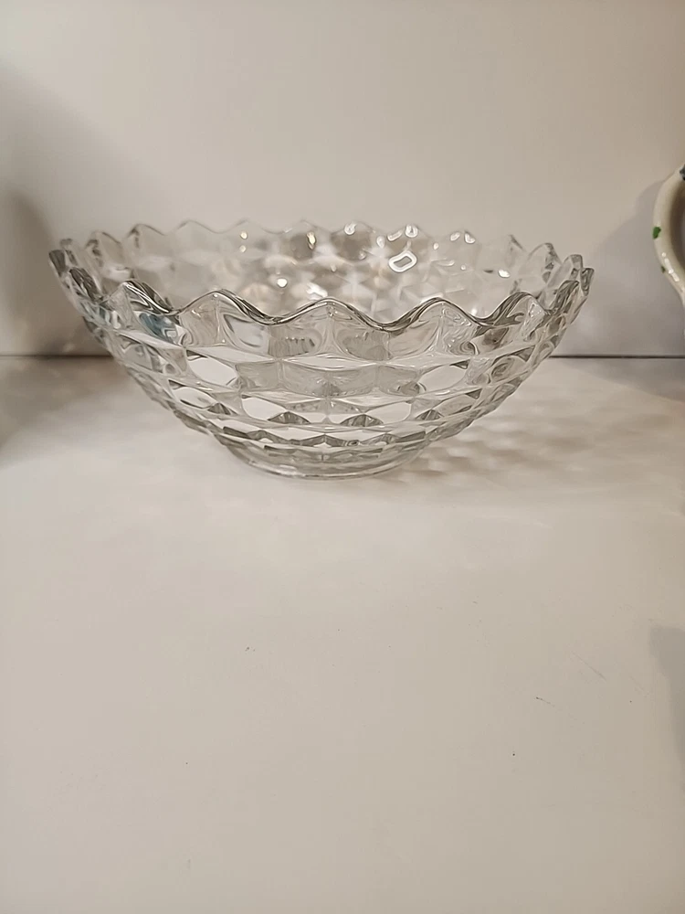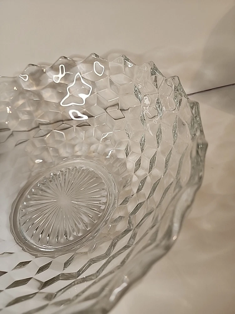 This vintage Fostoria American Cubist Pattern serving bowl is a beautiful addition to any dinnerware collection. The round, 10-inch bowl features a stunning fruit pattern and is made of shiny clear glass. Perfect for all occasions, this mid-century modern style bowl is a licensed reproduction and weighs 4 pounds and 12 ounces. The bowl is designed with a single place setting and comes with a matching fruit bowl. It is perfect for serving fruits or any other dish. The item length and depth are 4 inches, and it has a beautiful clear color that will complement any table setting. This bowl is a great piece for collectors or anyone who appreciates beautiful glassware. New out of box