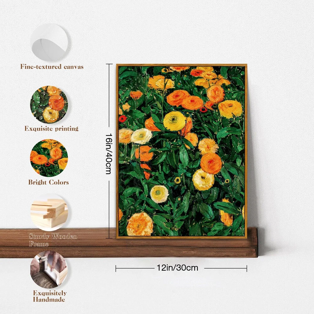 Vintage Marigolds: This botanical wall art captures the vibrant colors and lively growth of flowers, showcasing their brilliance and vitality. The fragrance and vitality of flowers fill the space, offering an immersive experience in a floral paradise Premium Quality: Crafted with professional inks for vivid colors that endure sunlight exposure. Detailed printing on textured canvas remains unaffected by moisture. Wrapped with a wooden frame on all sides for a stable structure that lasts over time Space Decoration: Immerse yourself in charming countryside scenes and still-life beauty from the past century. Ideal for decorating farmhouses, cottages, or adding vintage elegance to any space, including living rooms, dining rooms, and bedrooms Hang Effortlessly: Manually measures about 12x16 inches (30x40 cm) with a margin of error of 0.2 inches, features sturdy hooks on the back for easy hanging in your desired location using the provided traceless nails and installation instructions Thoughtful Choice: Evokes cherished memories and stirs nostalgia. Ideal for partners, friends, family, or anyone special on birthdays, housewarmings, anniversaries, or any occasion, serving as both a vintage decoration and a memento of special moments