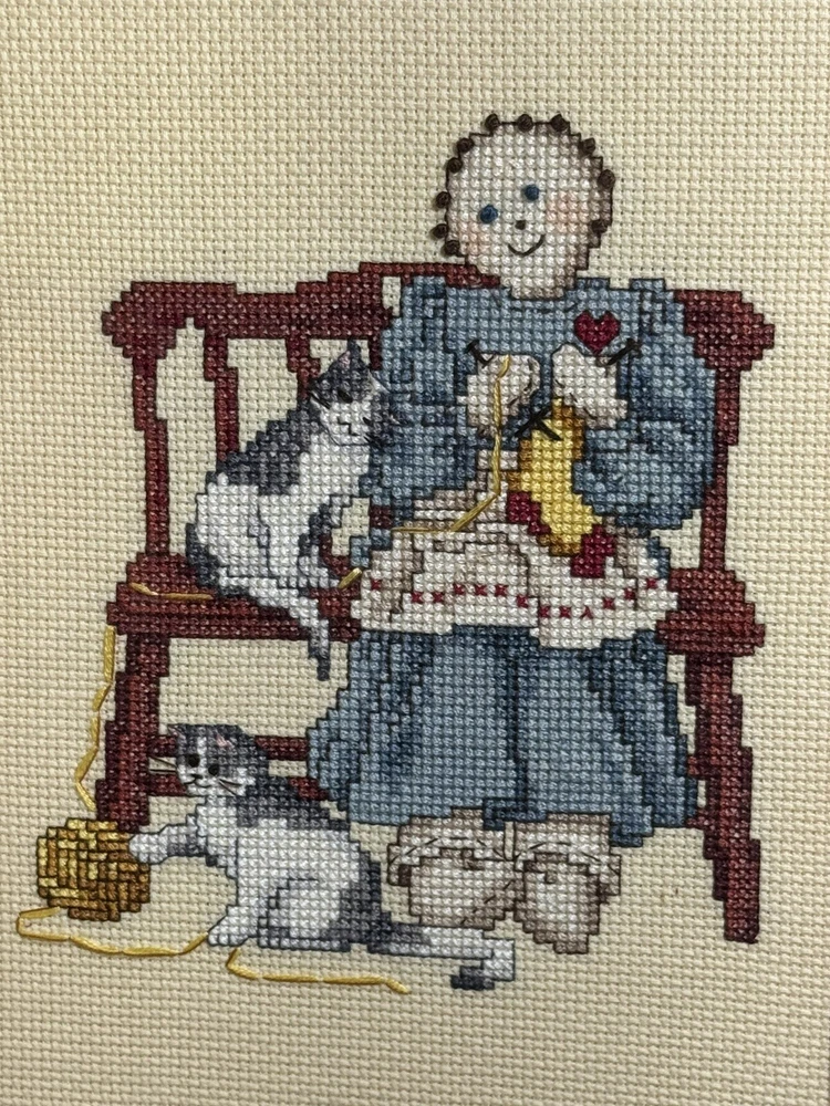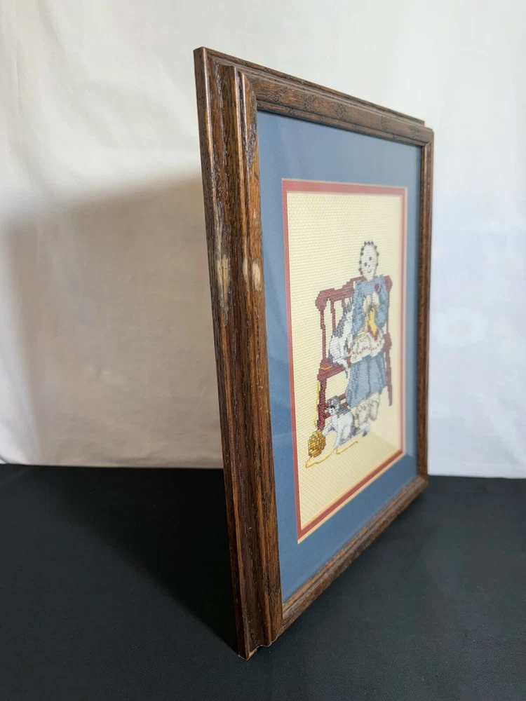 This vintage framed cross stitch art piece features a charming scene of a girl knitting with two cats. The intricate details of the embroidery make this piece a unique addition to any collection. Made in the USA, this piece is a testament to the skill and dedication of American craftsmen. The type of embroidery used is cross stitch, and the piece is finished and ready to display. The perfect addition to any home decor, this piece is sure to delight any lover of embroidery and vintage art.