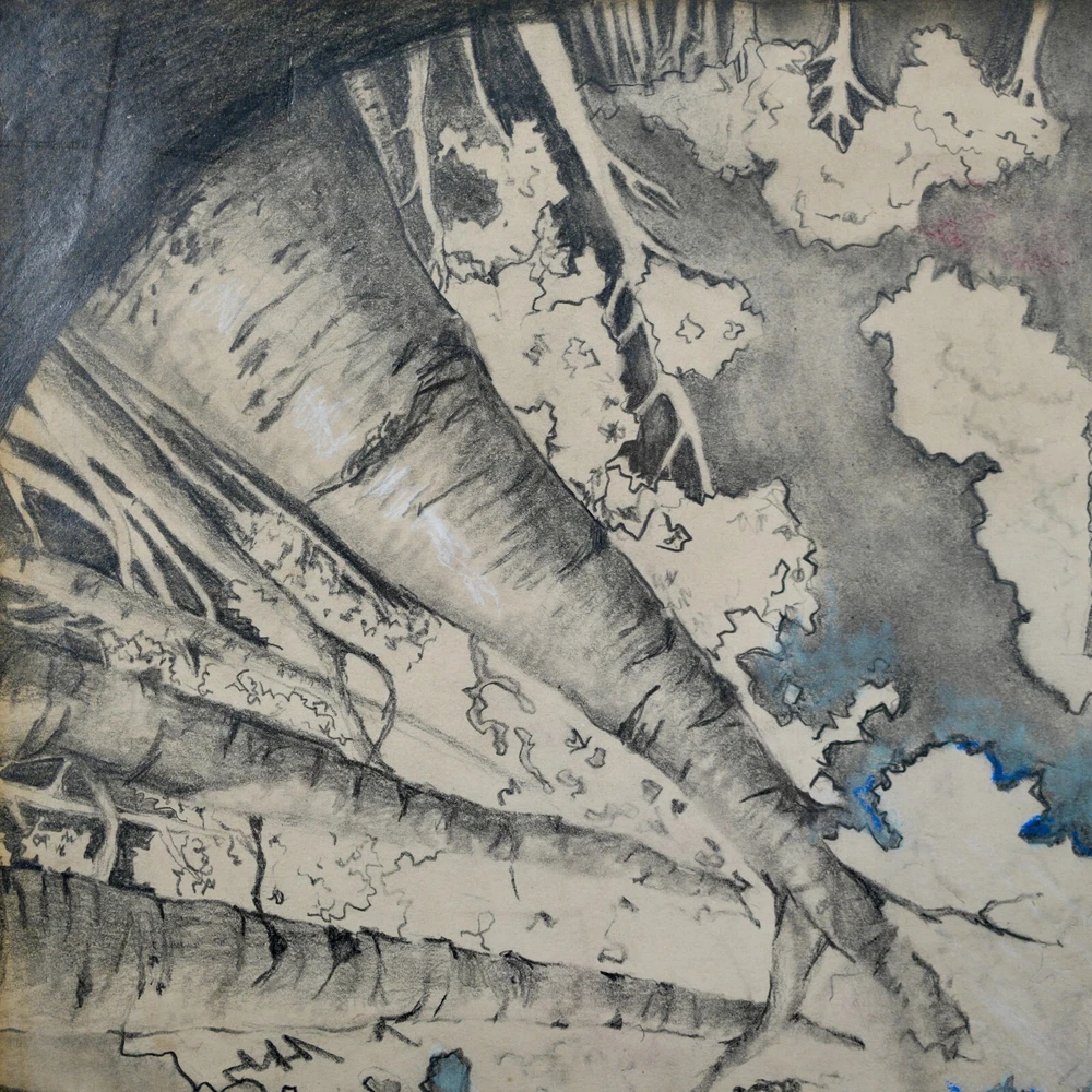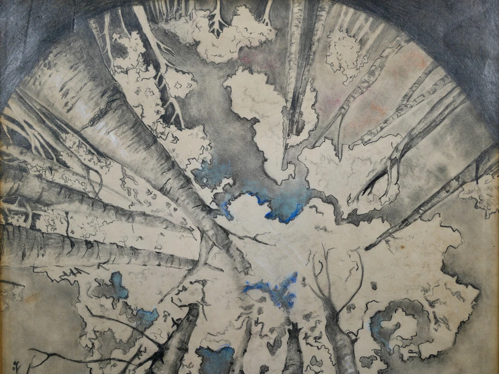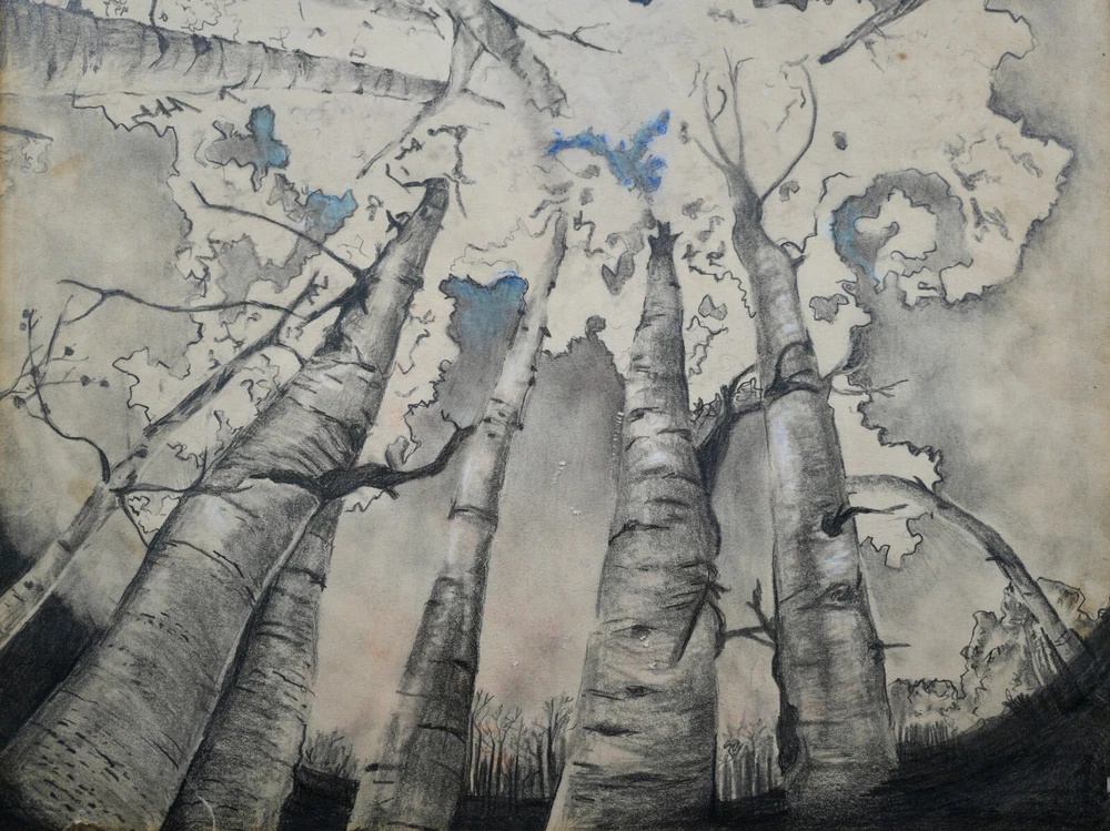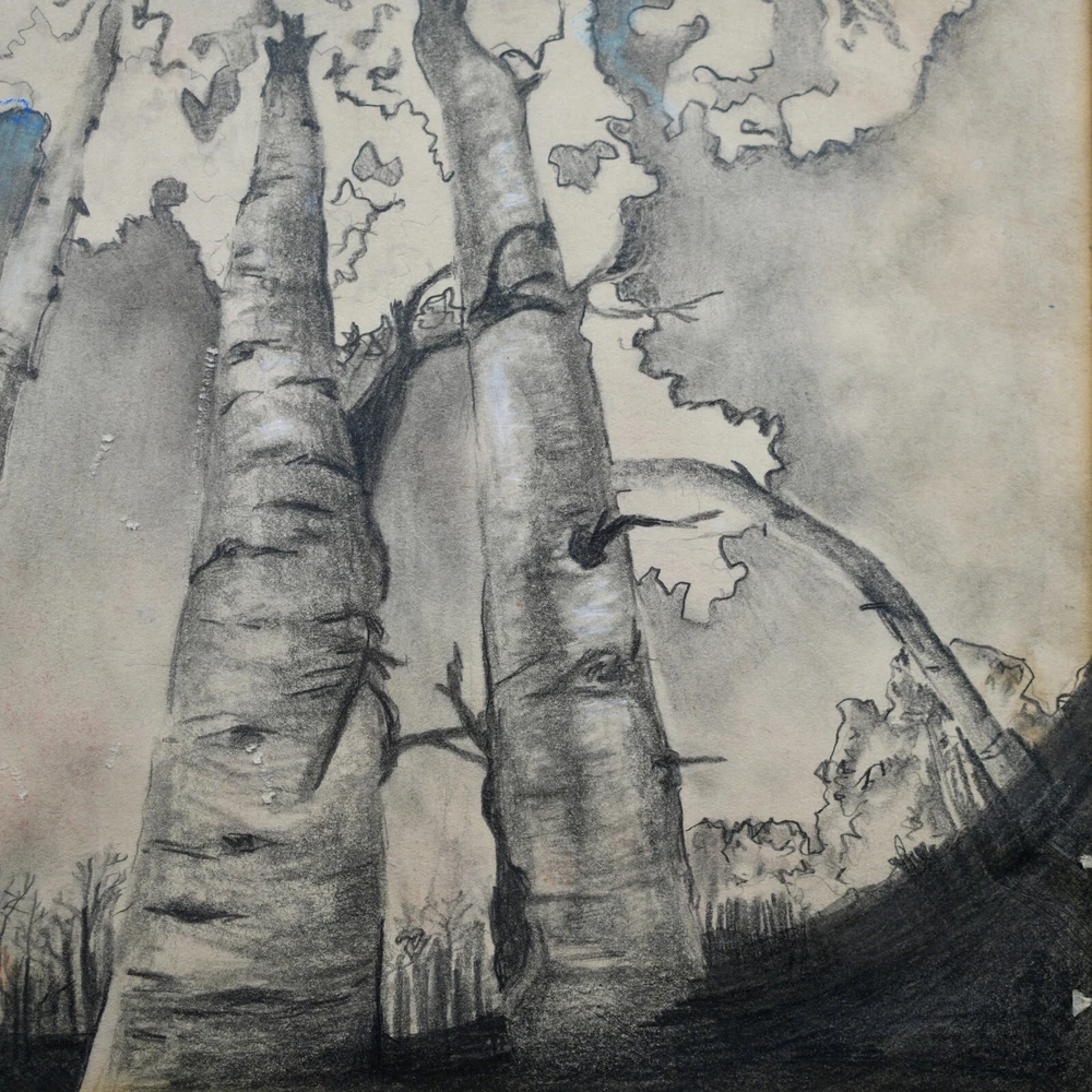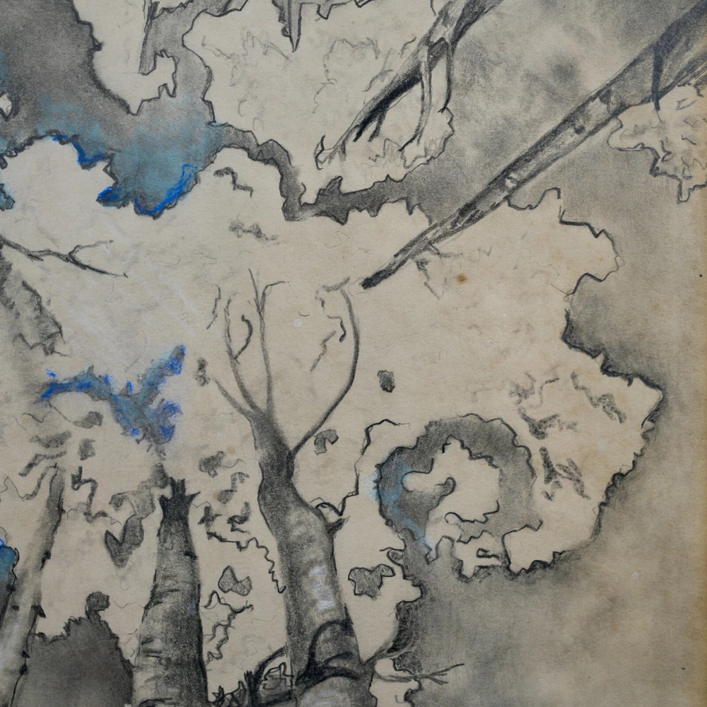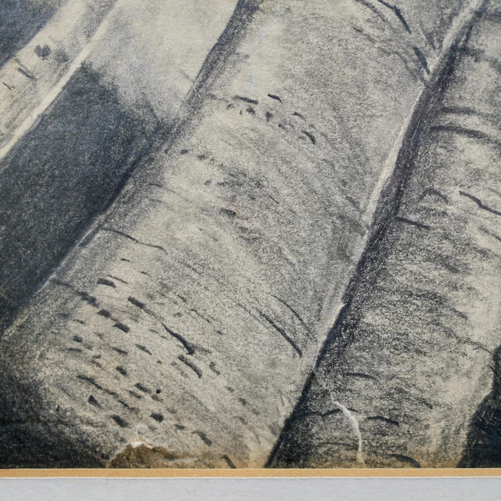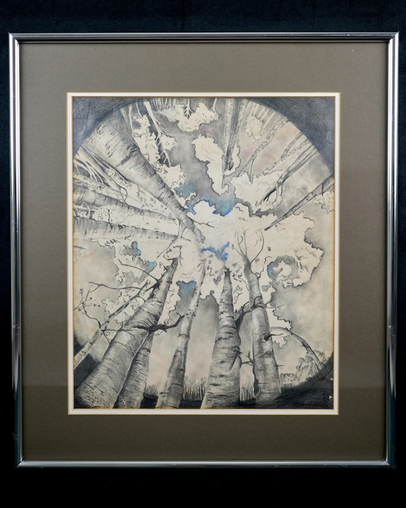 The Vintage ( Circa.1960s ) Framed Original Landscape Charcoal and Color Pencil Painting "View of Birch Forest" , No Signature Found. It Depicts the Landscape Scenery of White Birch Forest in Winter. The Composition is Made through the Unique Perspective of Children Looking Up, the Sight Follows the Towering Birch Tree Trunk and Looks Towards the Blue Sky and White Clouds, which is Full of Children Interest. The Painting Shows Toning, Tear at the Bottom Edge, and Some Scratch on the Frame Consistent With Age, Overall in Good Condition. Title: "View of Birch Forest" Artist: Unsigned Time Period: 1960s Medium: Charcoal and Color Pencil on Paper Condition: Overall in Good Condition Frame Size: 26" By 23" Sight Size: 18-1/4" By 15-1/4" Available For Domestic Shipping and International Shipping. Thanks!