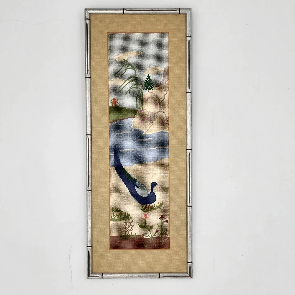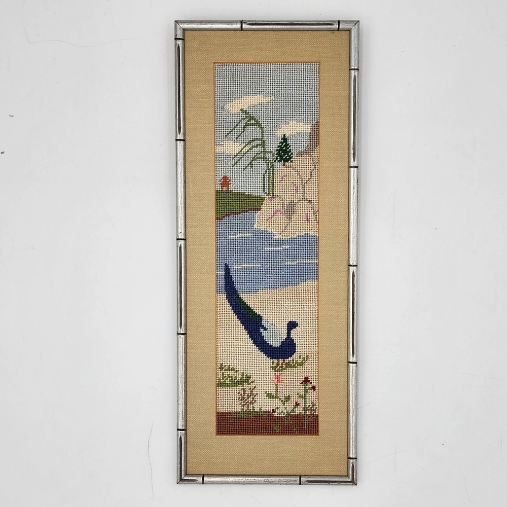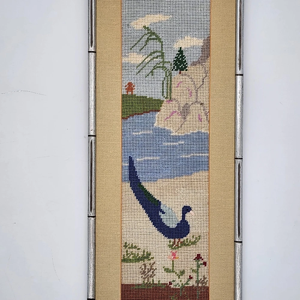Charming vintage hand-stitched needlepoint artwork featuring a serene landscape with a graceful peacock by a riverside. The scene is beautifully detailed with soft pastel tones—blue water, tan sand, green foliage, and a small red-roofed house in the distance—creating a peaceful, nature-inspired composition. Presented in a narrow rectangular frame with a linen mat and silver-toned trim, the piece has a refined, mid-century aesthetic perfect for bohemian, cottage, or traditional interiors. Medium: Needlepoint embroidery on fabric Frame Size: Approx. 8.5” x 20.5” (including frame) Era: Likely mid-20th century Condition: Very good vintage condition with minor age wear to frame consistent with age Style: Folk Art / Mid-Century Decorative Needlework A lovely handmade textile piece that brings a touch of warmth and artistry to any wall.