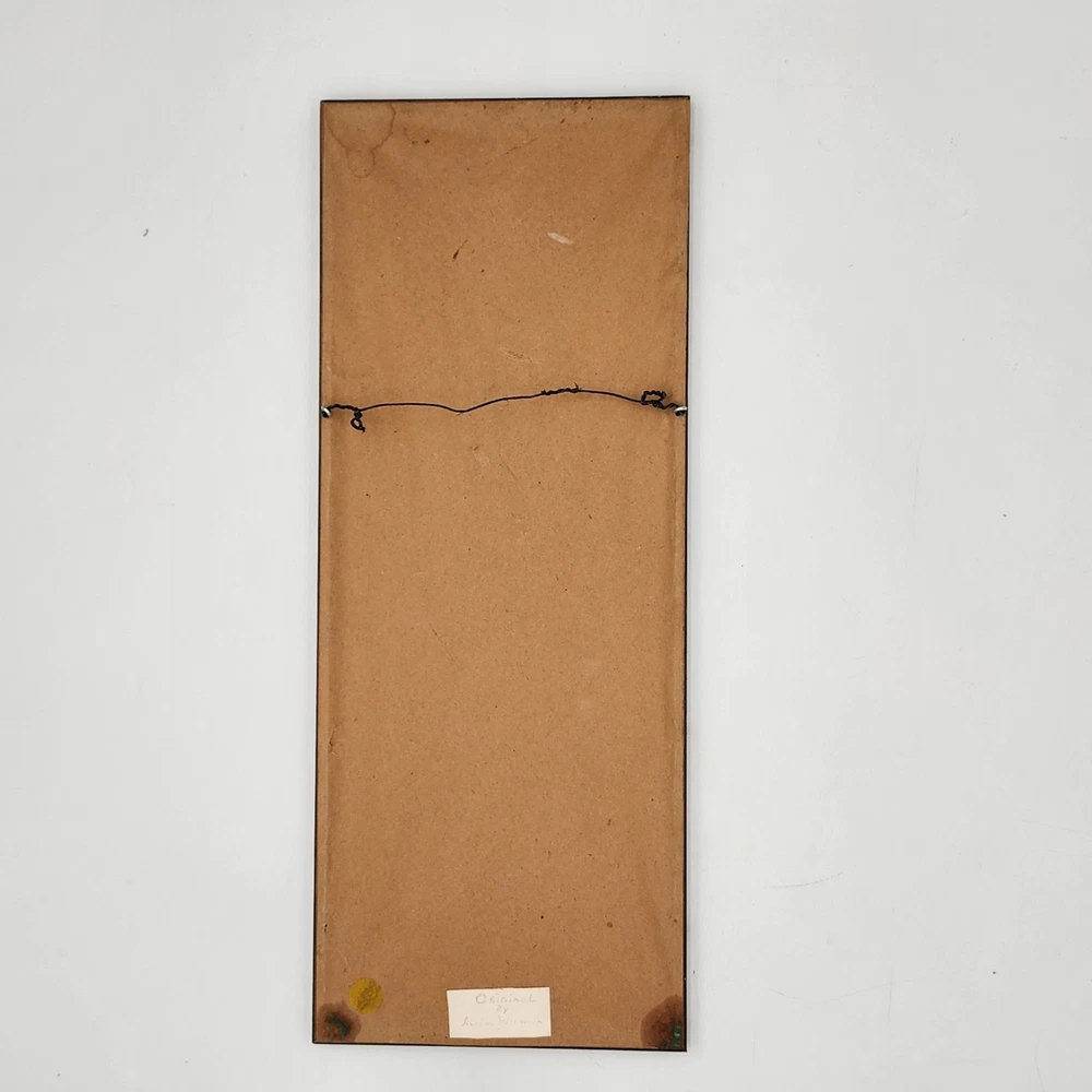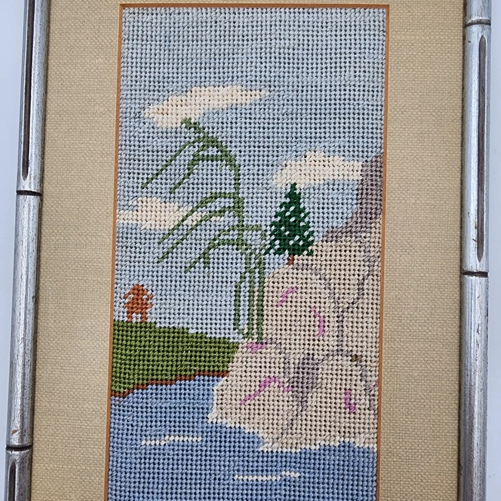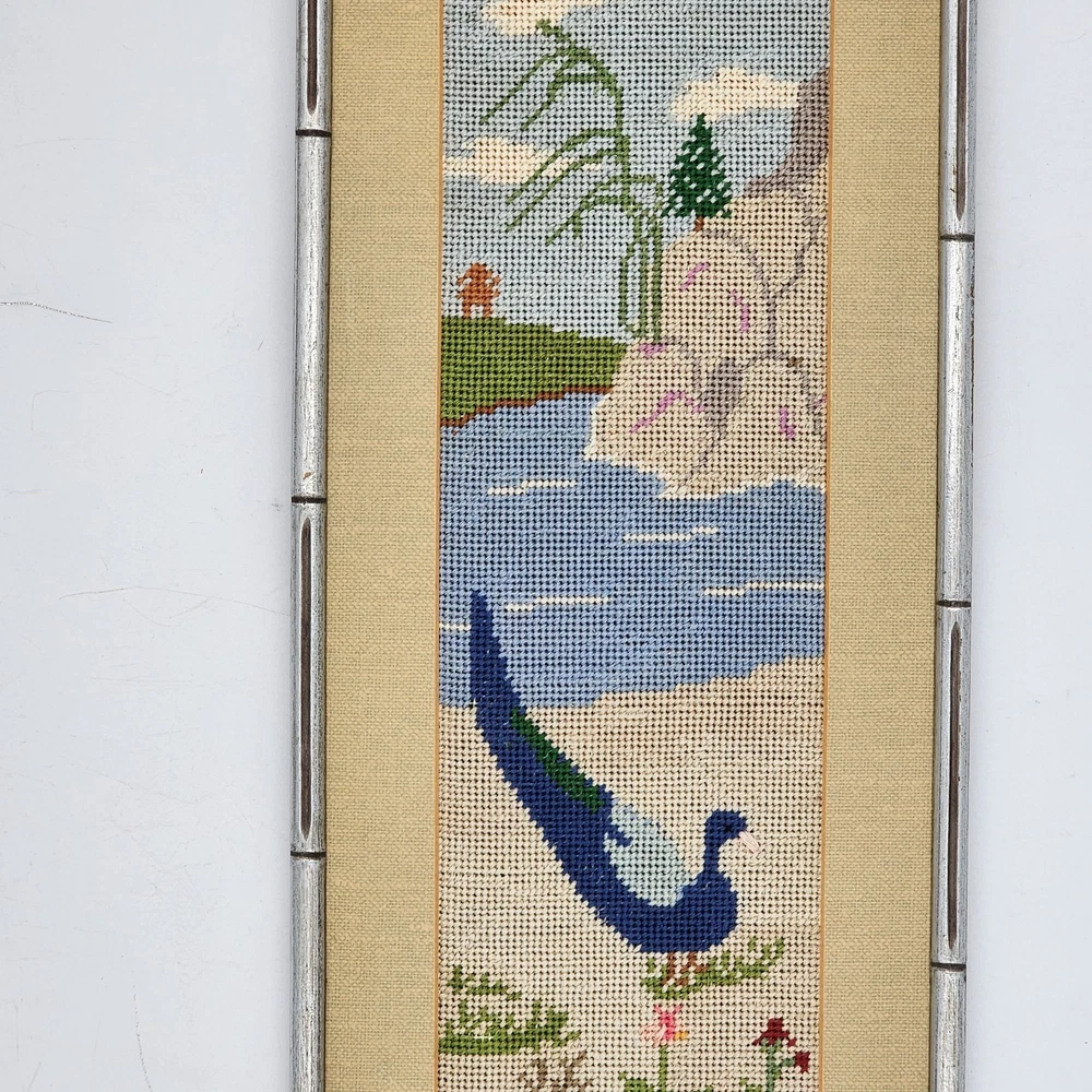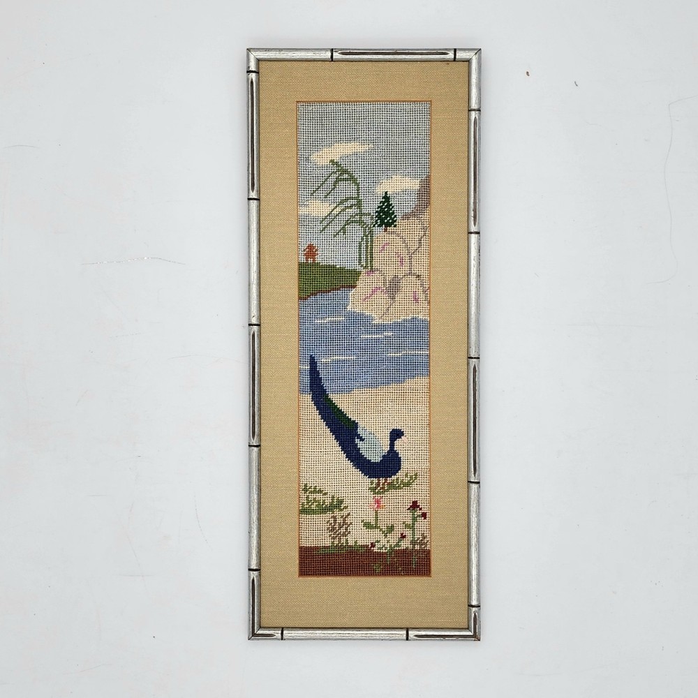 Charming vintage hand-stitched needlepoint artwork featuring a serene landscape with a graceful peacock by a riverside. The scene is beautifully detailed with soft pastel tones—blue water, tan sand, green foliage, and a small red-roofed house in the distance—creating a peaceful, nature-inspired composition. Presented in a narrow rectangular frame with a linen mat and silver-toned trim, the piece has a refined, mid-century aesthetic perfect for bohemian, cottage, or traditional interiors. Medium: Needlepoint embroidery on fabric Frame Size: Approx. 8.5” x 20.5” (including frame) Era: Likely mid-20th century Condition: Very good vintage condition with minor age wear to frame consistent with age Style: Folk Art / Mid-Century Decorative Needlework A lovely handmade textile piece that brings a touch of warmth and artistry to any wall.