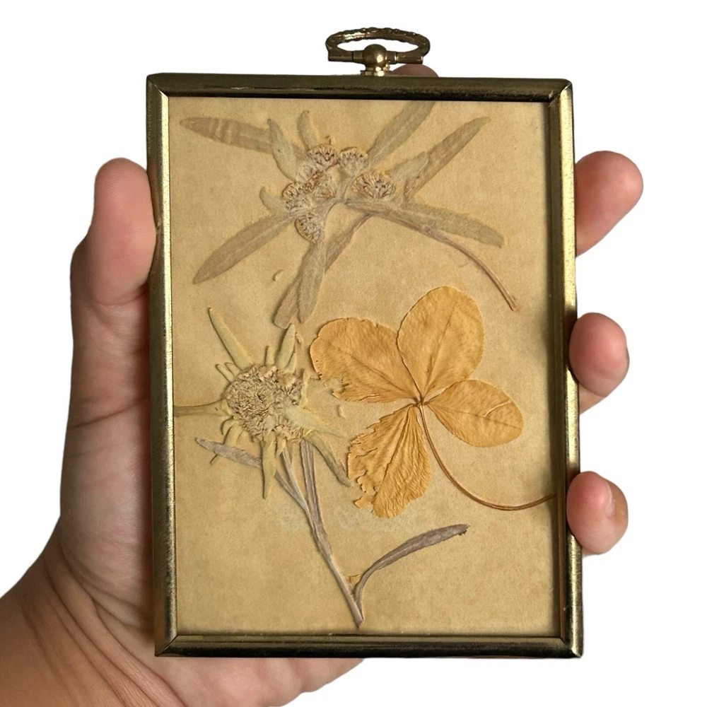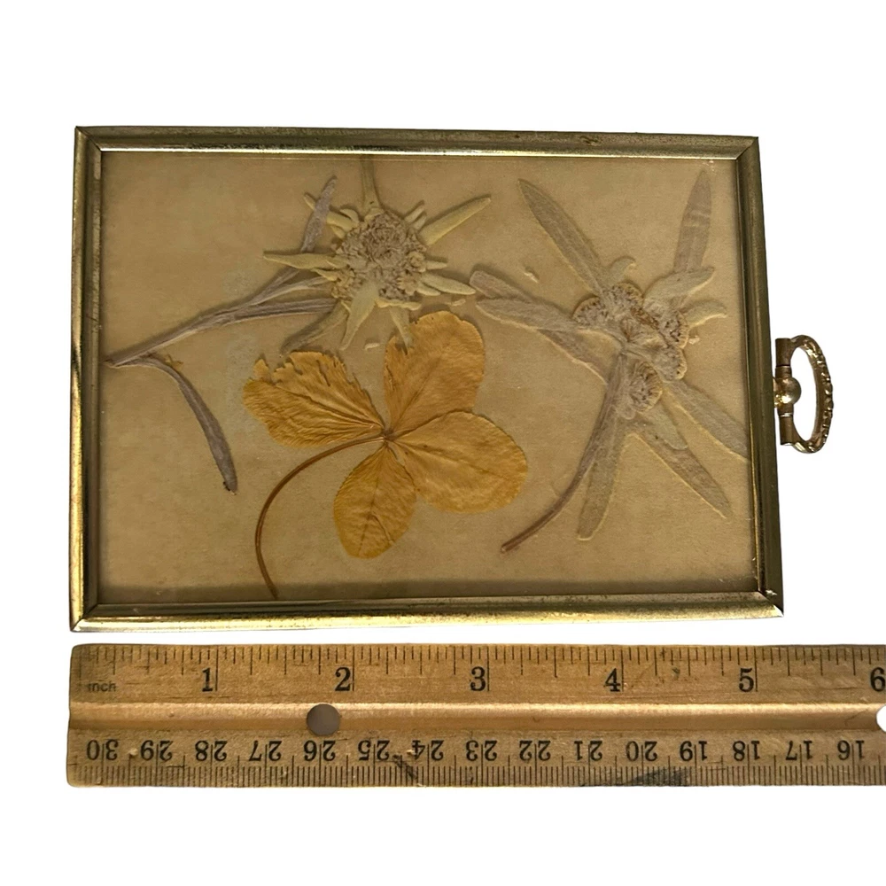 Vintage Framed Pressed Edelweiss Flowers & Four Leaf Clover Art Symbolic for True Love, bravery, strength and sacrifice. The edelweiss flower grows in the Alps and comes with a long list of historic & folkloric significance. In 1861, author Berthold Auerbach narrated a story of a brave young man who risks his life to collect this rare flower for his lover as an act of true love. In WW1, the edelweiss was granted to the German alpine troops for their bravery. In WW2 an edelweiss flower was worn on the sleeve and caps of the mountain infantry troops. Another interesting tidbit is the superstitious belief that burning the flower as incense will rid all evil spirits from your home. Four leaf clovers are considered a rare mutation that occurs approximately 1 in every 10,000 which is why they’re considered lucky. Minor surface scratches and some tarnishing may be present to the frame due to preowned condition. No chipping or fractures to the glass. Please see pictures as part of full description and measurements.
