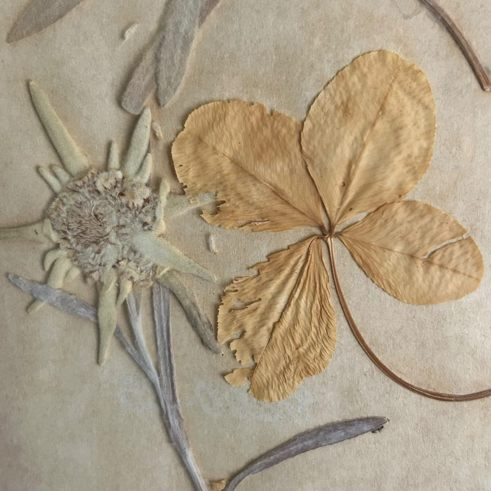 Vintage Framed Pressed Edelweiss Flowers & Four Leaf Clover Art