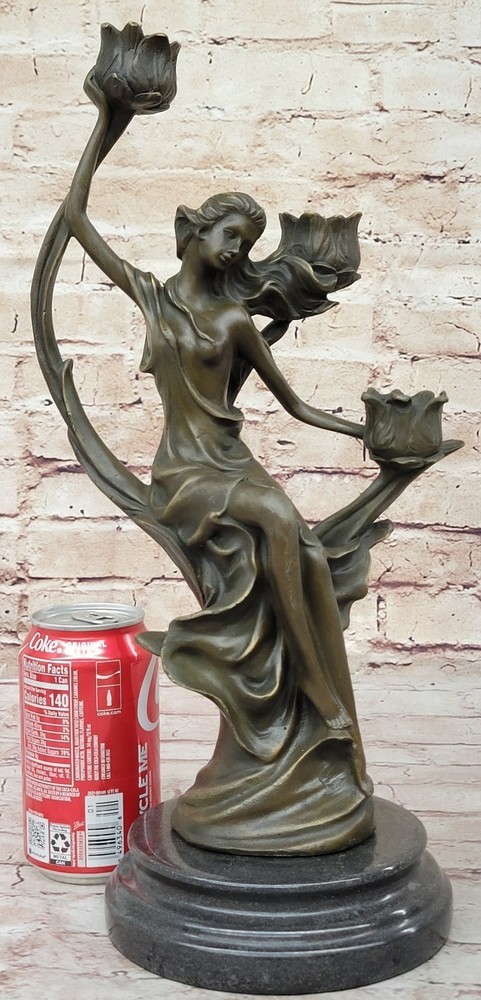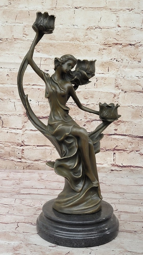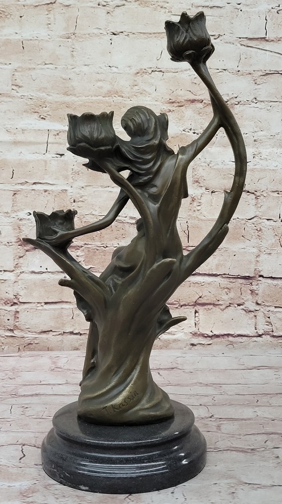 VINTAGE FRENCH EMPIRE BRASS BRONZE KASSIN CANDLE HOLDER CANDELABRA HOT CAST ART VINTAGE FRENCH EMPIRE BRASS BRONZE KASSIN CANDLE HOLDER CANDELABRA HOT CAST ART Condition : sculpture is perfect condition Bronze Dimensions with Marble Base: Height 15" X Width 9" Marble Dimensions: Diameter 5" Height without base:14" Weight:10 LBS Inventor:19YRD13115791 Experience the captivating beauty of our exquisite bronze candle holder, a stunning depiction of a woman in a moment of relaxation. With one hand gracefully behind her and wiping the sweat from her forehead, she exudes a sense of inner beauty and tranquility. Dressed in a flowing robe that elegantly hugs her legs up to her thigh, the sculpture showcases intricate details that create a sense of movement and dimension. The robe, bunching at the floor and fanning out around her, adds to the sculpture's allure, and her hips elegantly break up the form, providing the viewer with an additional dimension to appreciate. The flowers in the sculpture cleverly double as candle holders, concealing a charming surprise. Once a candle is lit and placed in the sculpture, the light reflects off the bronze, creating a breathtaking sight that adds ambiance and aesthetics to any room. This exceptionally gorgeous candle holder is not just a functional piece, but also a work of art that elevates the ambiance of your living room or home. Signed by the talented artist J. Kassin, this bronze sculpture is a testament to the artist's skill and vision, making it a prized addition to any collection or decor. Illuminate your space with the grace and elegance of this unique candle holder, turning any moment into a mesmerizing experience. Art Deco Nouveau Bronze Metal Candelabra Candleholder Sculpture Female Figure YRD-1311 bronzhaus.com Video will open in a new window Using the eBay App? Paste link into a browser window: [isdntekvideo] Shipping Terms : Most of our items are shipped via USPS (United States Postal Service) mail or UPS. Most orders are shipped within 24-48 hours of purchase. Please be aware that not all items are available for USPS shipping due to size and weight. We do ship to Hawaii, Alaska, Canada, Puerto Rico, APO/AE, and U.S. Virgin Islands, however, an additional charge may be required. Please contact us before making any purchases in these areas. For Non-USA customers, you may be responsible for all duty, tax, brokerage fees that may be due upon delivery (shipping costs cover freight charges only). We also ship internationally. Please refer to the "Shipping and Handling" chart for the rates for each area. Payment : We accept just about any form of payment. PayPal, Master Card, Visa or American Express credit cards. Money orders, cashiers checks, and even personal or business checks. For governmental institutions, we will also accept a purchase order. Please understand that for personal or business checks we have to wait for the check to clear (usually 7 days) before shipping. Condition : New Detailed Hand Crafted Hot Cast Bronze Satisfaction Guaranteed. This is Stock Photo, Slight Color Variation!! Listing and template services provided by inkFrog