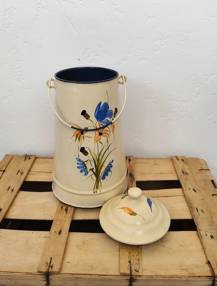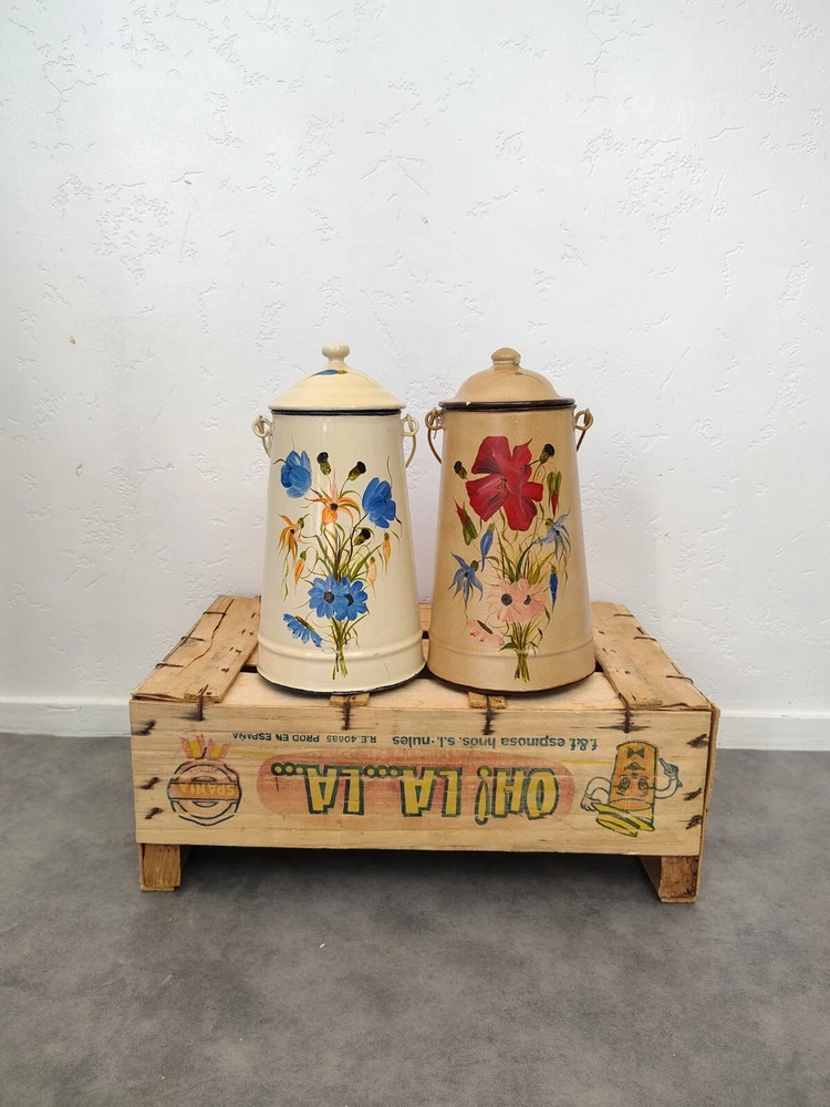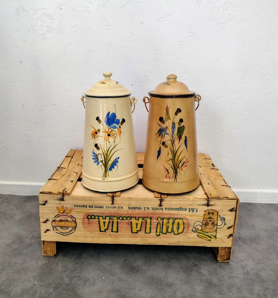 The vintage French enamelware milk coffee pot doubles as a charming flower vase, with its classic white enamel finish adding a touch of antique elegance to any space. This versatile piece showcases the timeless beauty of enamel material, making it a desirable collectible item for those who appreciate vintage kitchen decor. They have been decorated with new paintings Dimensions 26 x 14 cm // 10.23 x 5.51 inches
