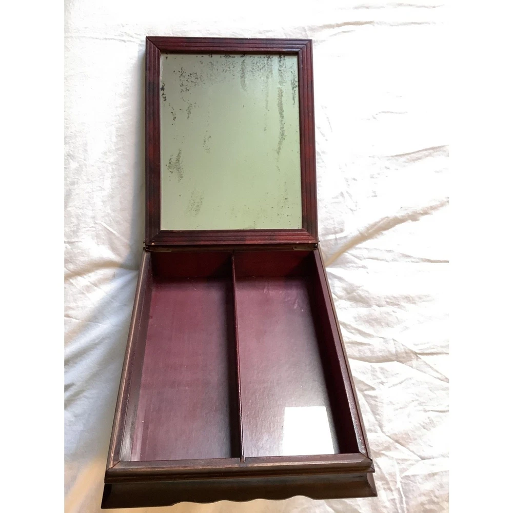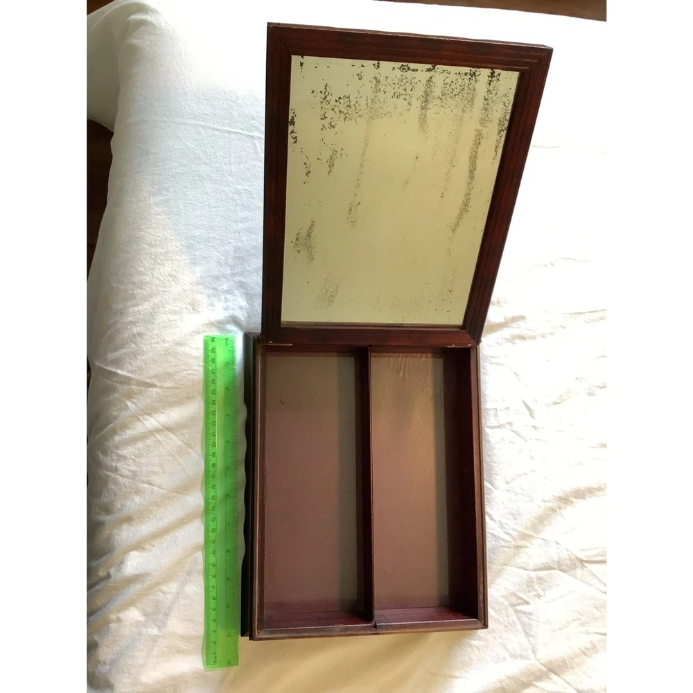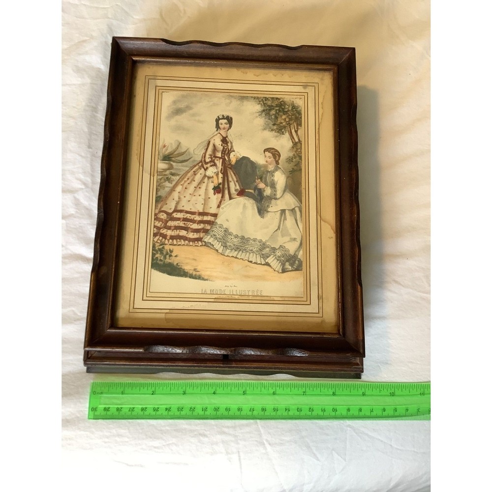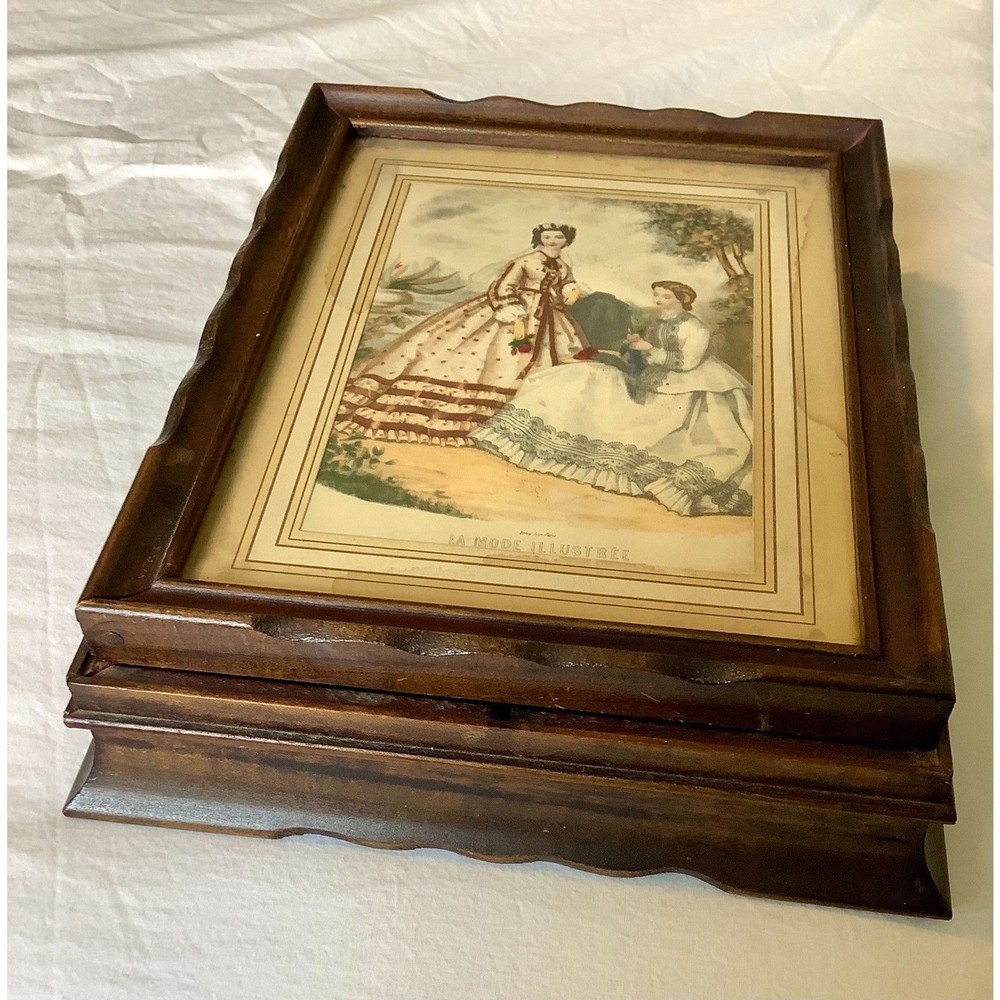 Struggling to find a stylish yet practical way to store your precious jewelry and other valuables. Introducing this Vintage French La Mode Illustrée Mirrored Wooden Jewelry Box. More impressive in person, hard to capture the historic vibe of this box. The lid is a framed 9" x 11" Country French themed Picture, which makes this a perfect blend of vintage country French charm and modern functionality. Inside, features 2 compartments designed to keep your jewelry and contents arranged and easily accessible as well as a mirror (vintage with some discoloration, adding an antique vibe) on the back side of the lid. Perfect in your dressing space for safe storage of special pieces of jewelry, trinkets, and valuables.
