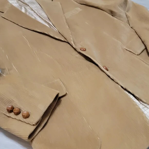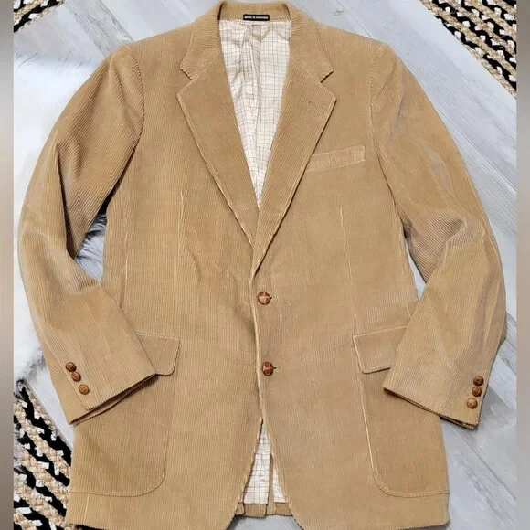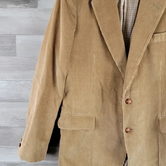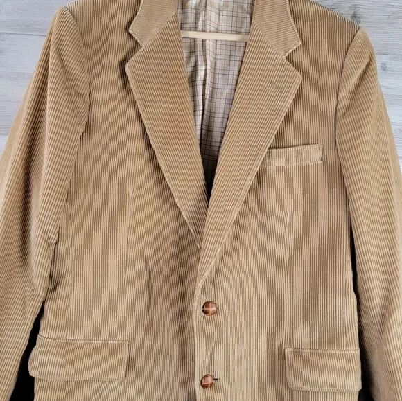 Vintage Frenchman Tan Whale Corduroy Blazer Mens Size 42R No Major Flaws In Great Overall Condition Cotton Corduroy Material Button Closure All measurements laying flat and in inches: Shoulder to hem: 31" Pit to pit: 21" Sleeves: 19" Cuff to Pit k5_121524 Vintage, Corduroy, Fall, Winter