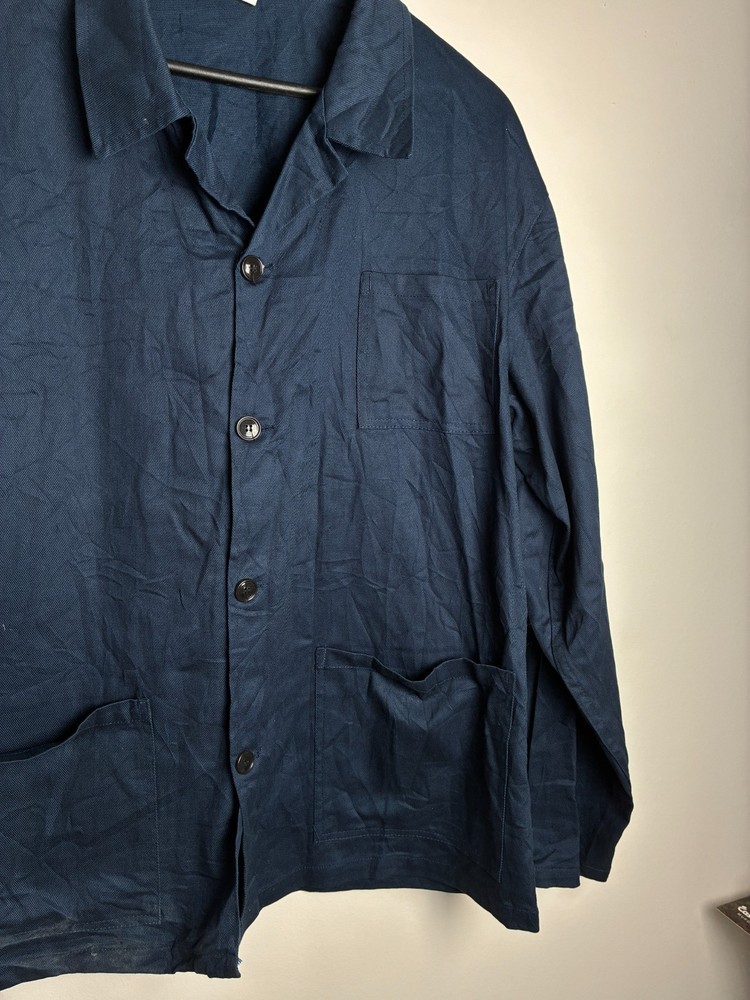 Vintage Workwear Chore Jacket Navy 100% Cotton Twill Button Up Utility “Very good condition overall with light cosmetic marks consistent with normal use, no rips or tears.” 100% cotton twill fabric (labelled BAWELNA 100% ) Classic workwear / chore jacket style with a worn, washed finish Plain design with no visible branding or graphics Button-up front with three practical patch pockets Light marks and signs of wear to lower hem and pocket areas as shown Approx measurements: Pit to pit 52–53cm, Length 70cm Please see photo's for best description and measurements Any questions, please ask.