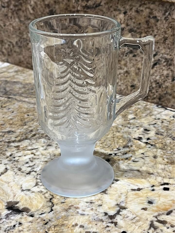 Sweet set of 4 vintage glass Christmas mugs with frosted base π₯°π Measure: 5.5β tall 2.75β diameter (3.75β including handle)