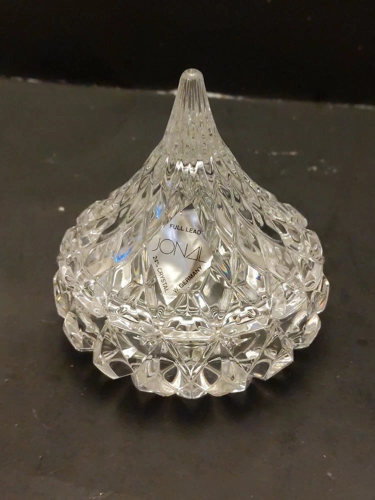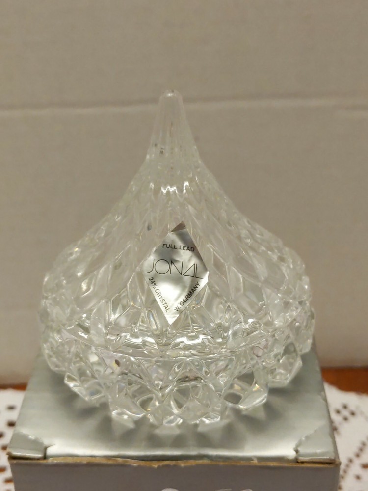 Full Lead Crystal HERSHEY'S KISS Trinket or Candy Box in Original Box with foil Label made by JONAL Crystal Ltd. West Germany. Condition is previously owned but unused condition. Box shows age and some damage, see photos. Shipped with USPS Priority Mail.