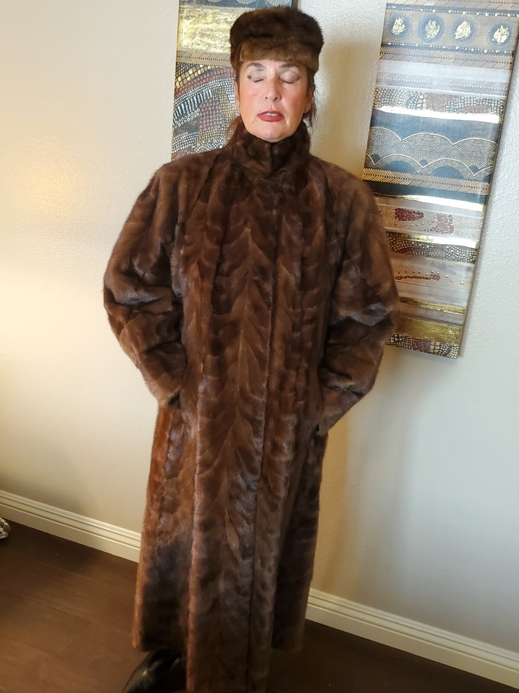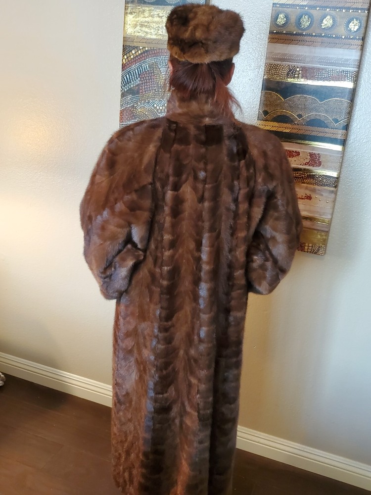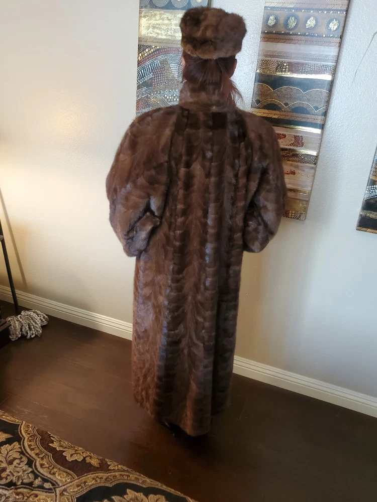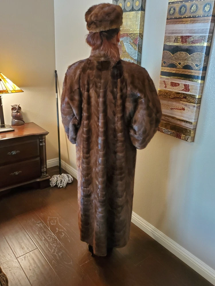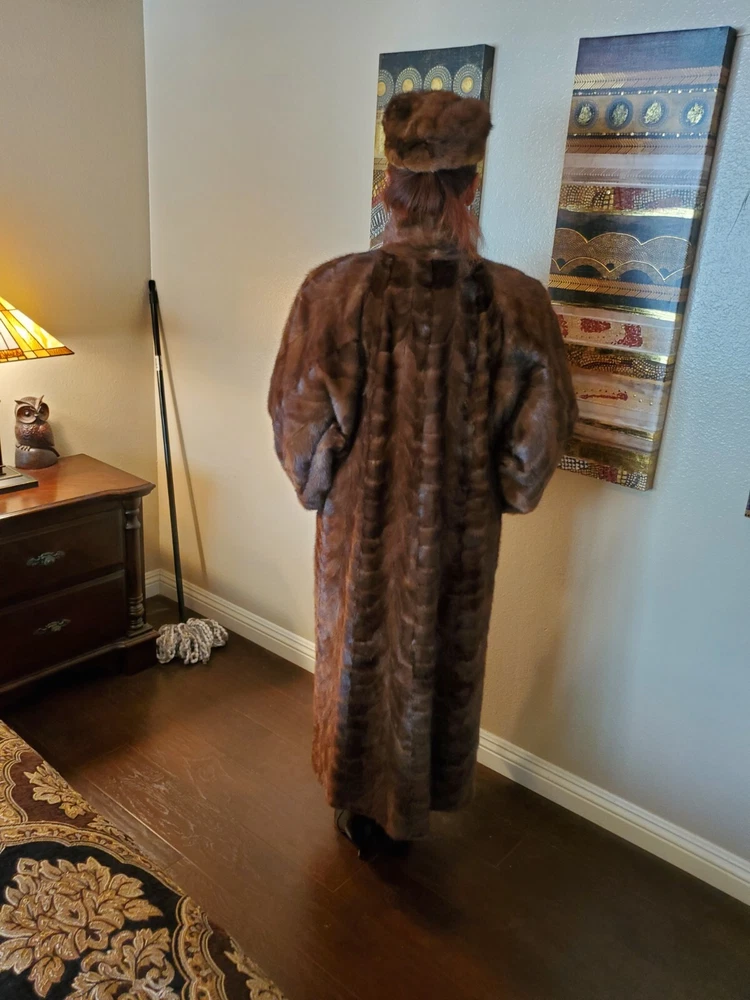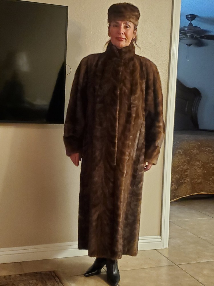 This stunning full-length mink coat is the epitome of luxury and style. The soft beige fur feels incredibly plush against the skin, while the silk lining adds extra comfort. The matching hat ties the elegant look together perfectly. The craftsmanship is impeccable, with clean stitching and a flattering silhouette that drapes beautifully. It keeps you warm without being bulky, making it ideal for formal events or chilly evenings. The classic design ensures it never goes out of fashion. A true investment piece that elevates any outfit instantly.