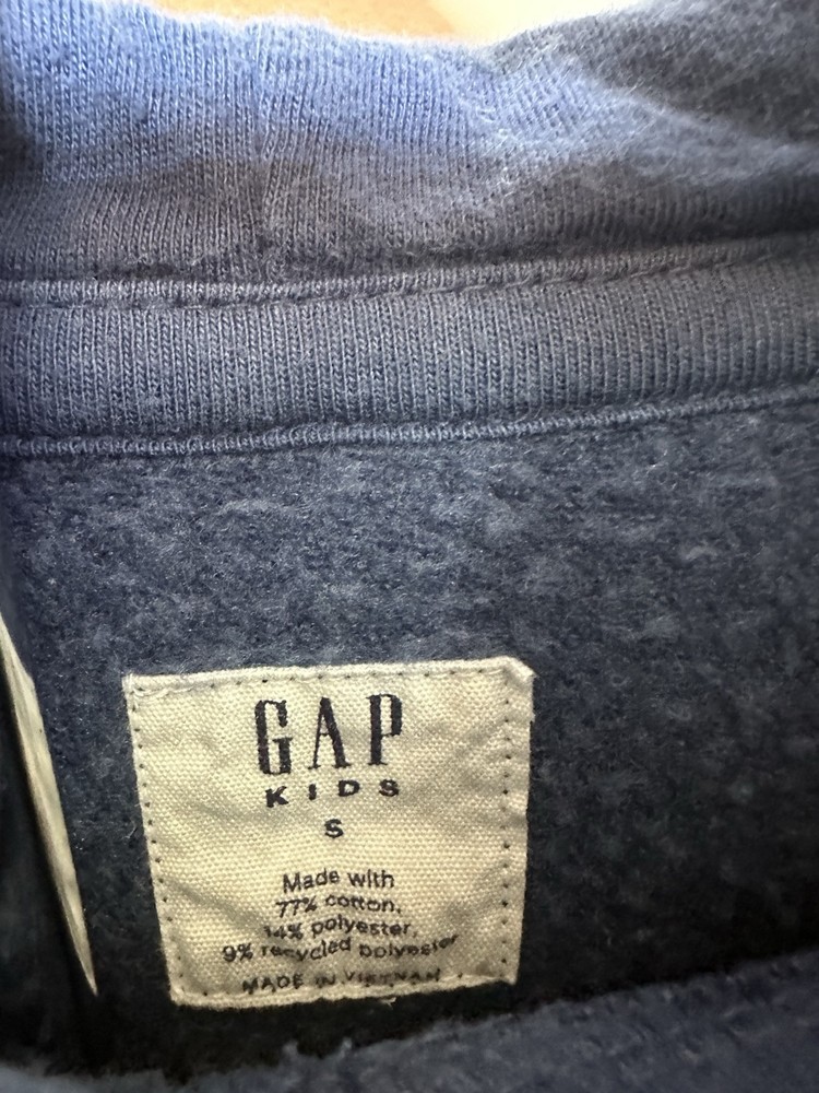 This is a GAP pullover sweatshirt for youth boys in blue, featuring a hood with the GAP logo embroidered on the front. It has long sleeves, a pullover closure, and pockets. Made of a cotton-polyester blend fabric, this casual hoodie is suitable for travel, activewear, and everyday wear in fall, winter, and spring. Easy to care for with machine washing, it is a classic style with a regular fit for boys size S.