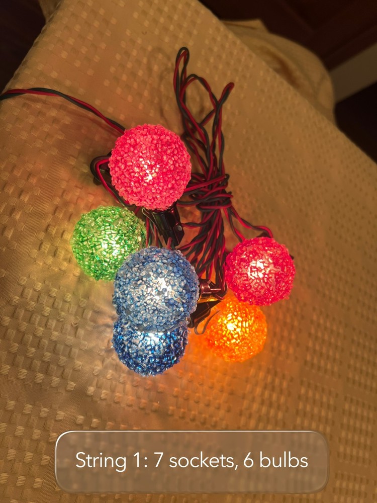 Wishing you had some of the cool Christmas frosted light bulbs from the 60's and 70's? You're in luck! I have GE Lighted Ice light bulbs! Manufactured from 1957 to 1975 by GE, these original string lights showcase a traditional Christmas aesthetic with a touch of nostalgia. Perfect for collectors or those looking to add a touch of vintage charm to their holiday decor. I have 5 lots of 11 bulbs. Almost all lots include red, green, blue, orange and white bulbs. Price is for 1 lot or unit of 11 bulbs. These electric-powered Indoor/Outdoor bulbs are made of frosted glass and come in multiple colors. Photos show both a lot of 11 bulbs and an example of working bulbs. The electrical strings are also available for sale. If anyone is interested, I will post them.