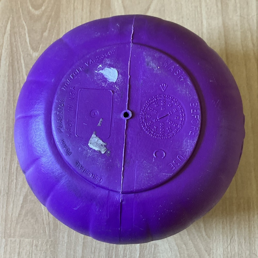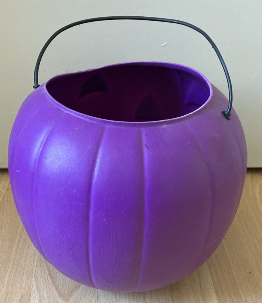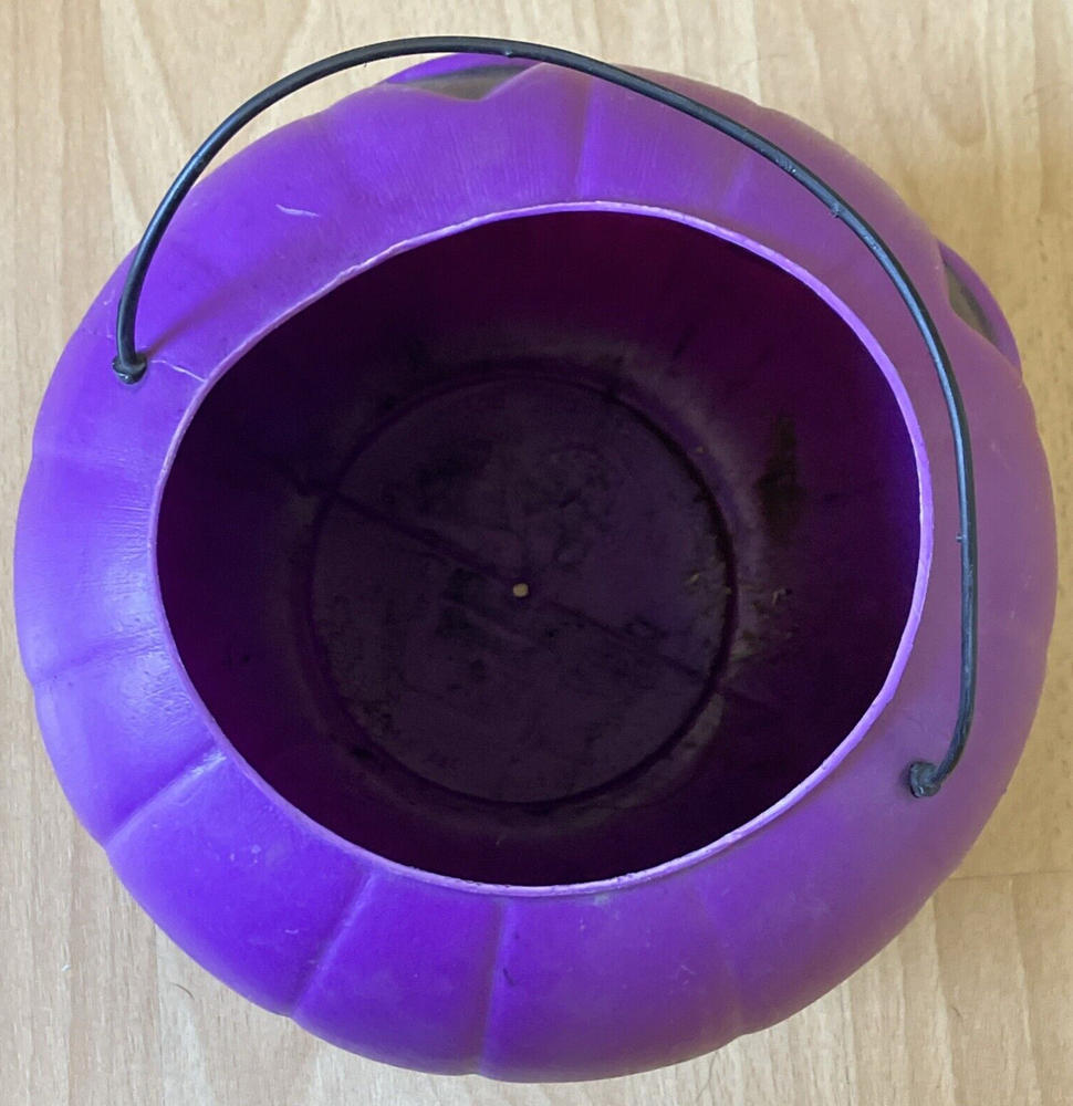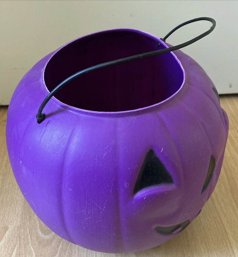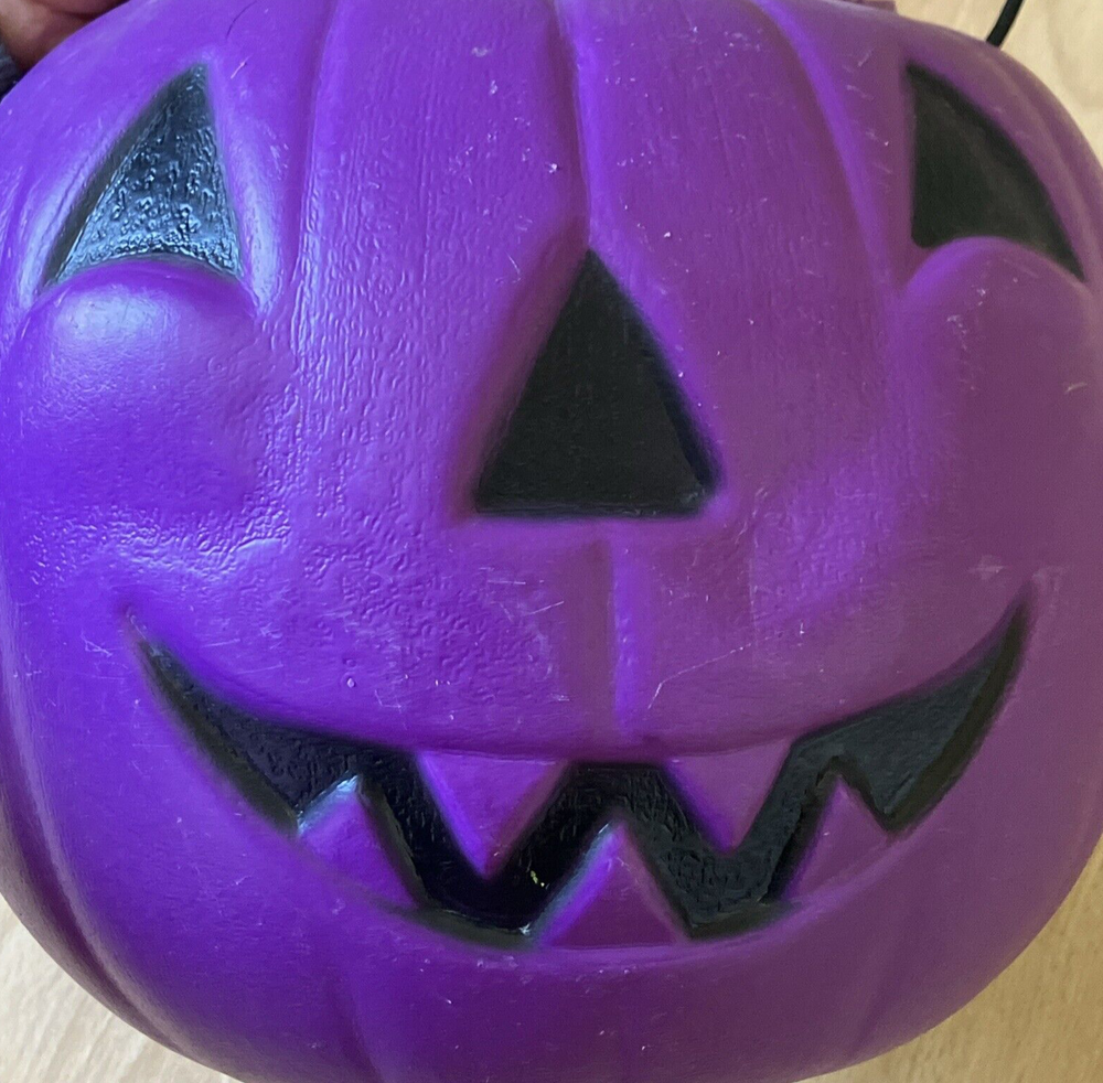 This vintage Halloween candy bucket from General Foam Plastics is a must-have for any collector. With its vibrant purple color and classic design, it's sure to be a standout piece in your collection. Made of durable plastic, this bucket is perfect for displaying or using to store your favorite treats. Pre-owned. See photos for condition details. Some warping. Black marks inside pumpkin.