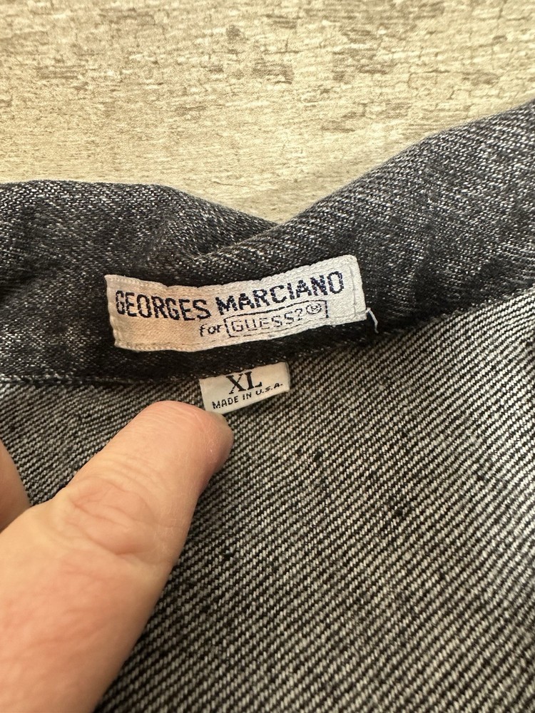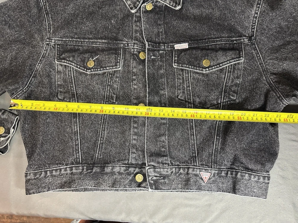 The Vintage GUESS Georges Marciano XL Black Faded Denim Trucker Jean Jacket is a stylish and iconic piece perfect for any casual occasion. Made from durable cotton denim with a regular fit, this jacket features a solid black color with the signature GUESS logo accents. With a button closure and machine washable care instructions, it offers both comfort and easy maintenance. Ideal for the 80s and 90s fashion enthusiasts, this jacket is a timeless piece that can be worn in winter, fall, and spring for a classic look. It does have one tiny frayed spot on it he sleeve as shown in pics.